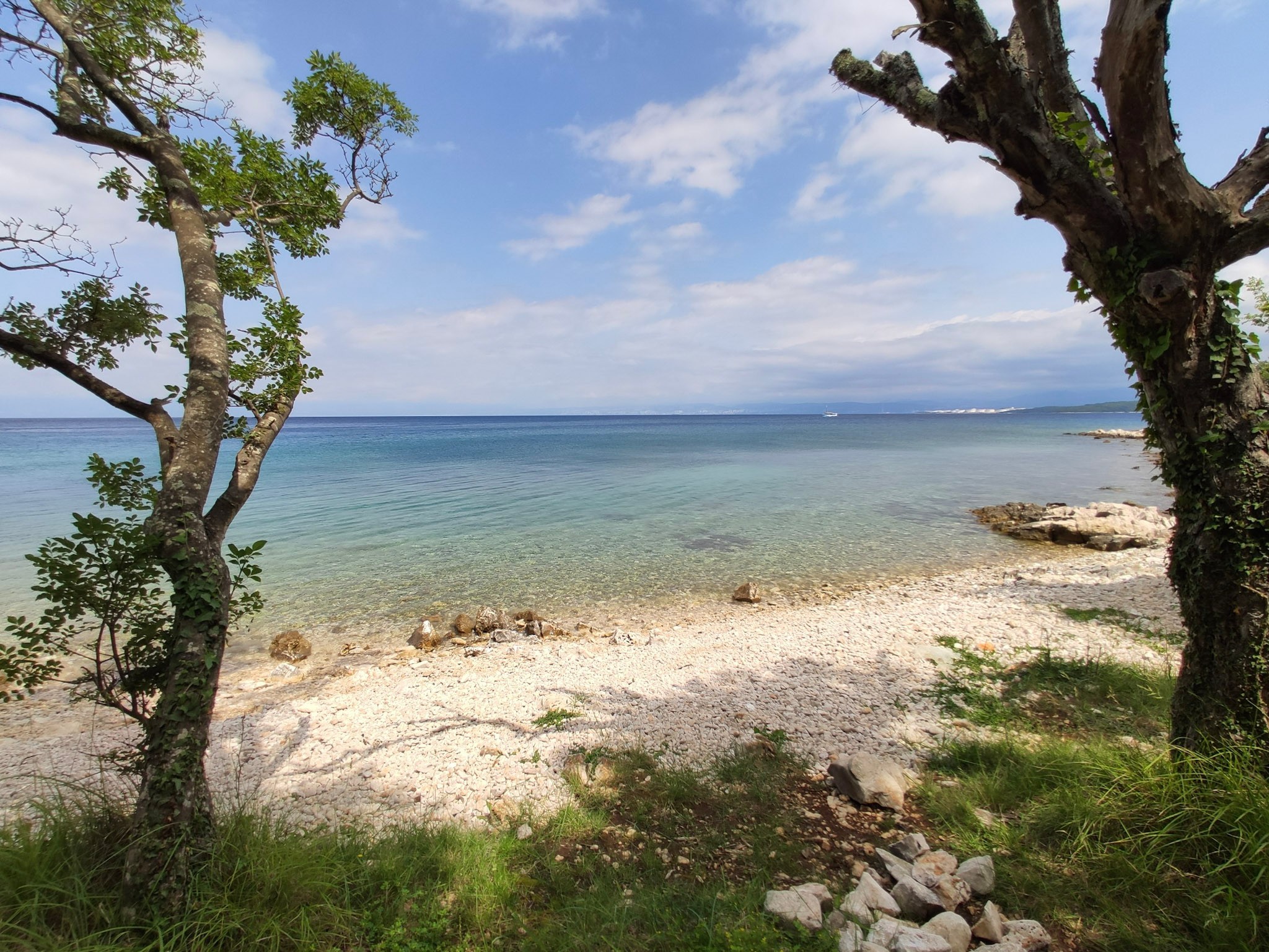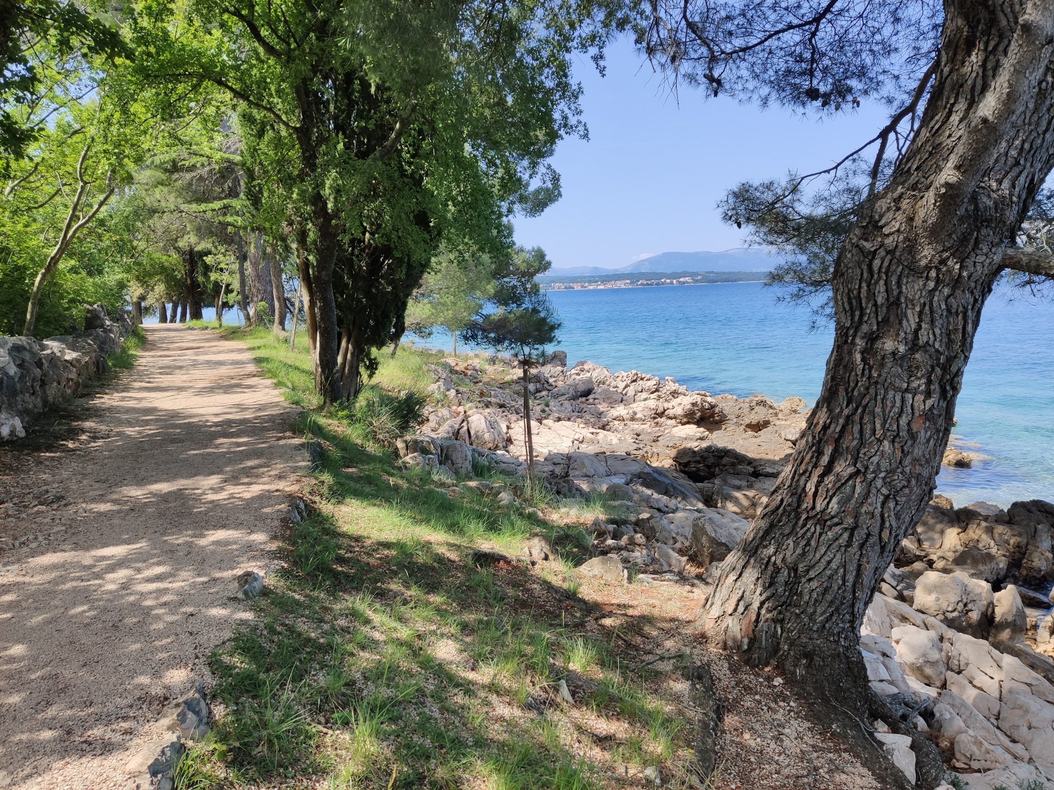 Der Weg führt zuerst entlang eines (in der Vorsaison) wunderbar leeren Felsenstrandes vor der verlassenen Hotelanlage Haludova. Viele betonierte Platten, vielfach im Schatten von hohen Kiefern führen zum mit Bojen abgesperrten Schwimmbereich im Meer. Das türkisblaue Wasser lädt richtiggehend zum Baden ein, der Felsenstrand verspricht entspannte Stunden am Meer. Der Park hinter dem Strand geht eher Richtung etwas heruntergekommen als romantisch. Aber man kann sich gut vorstellen, wie diese Anlage in einem etwas gepflegteren Zustand ausgesehen hat. Ich finde aber trotzdem, dass dieser „Strand“ eine Empfehlung wert ist.
