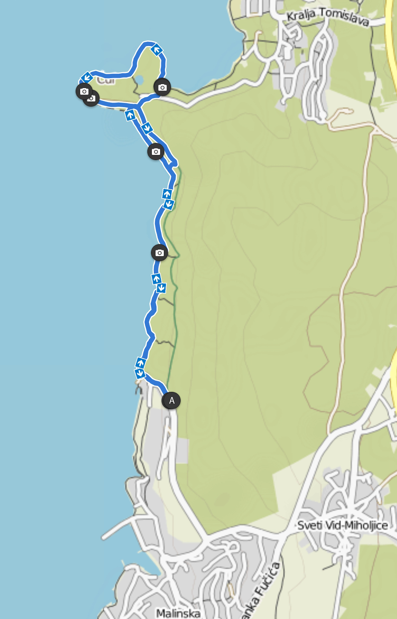 Am Ende des befestigten, perfekt ausgebauten Paradiesweges bin ich entlang der Küste auf einem Pfad weitergegengen. Hier ist definitiv FKK Gelände, denn das wurde mit roter Farbe so auf den Steinen markiert. Laut rotem Schriftzug (mit Pfeil nach links) auf einem grossen Betonblock ist ein Teil dieser Felsküste wohl sogar Swingern vorbehalten: Da scheint und den Büschen im Sommer die Post abzugehen… Heute ist es einfach nur idyllisch und menschenleer. Ich gehe wieder rauf auf die Strasse mit den „richtigen“ Wanderweg Nr. 6 Richtung Kijac. Dort biege ich dann wieder links ab zur Küste (denn die asphaltierte Strasser lädt nicht mehr weiter zum Wandern ein) und nehme den schönen Pfad direkt entlang der Küste rund um die Landspitze zurück.