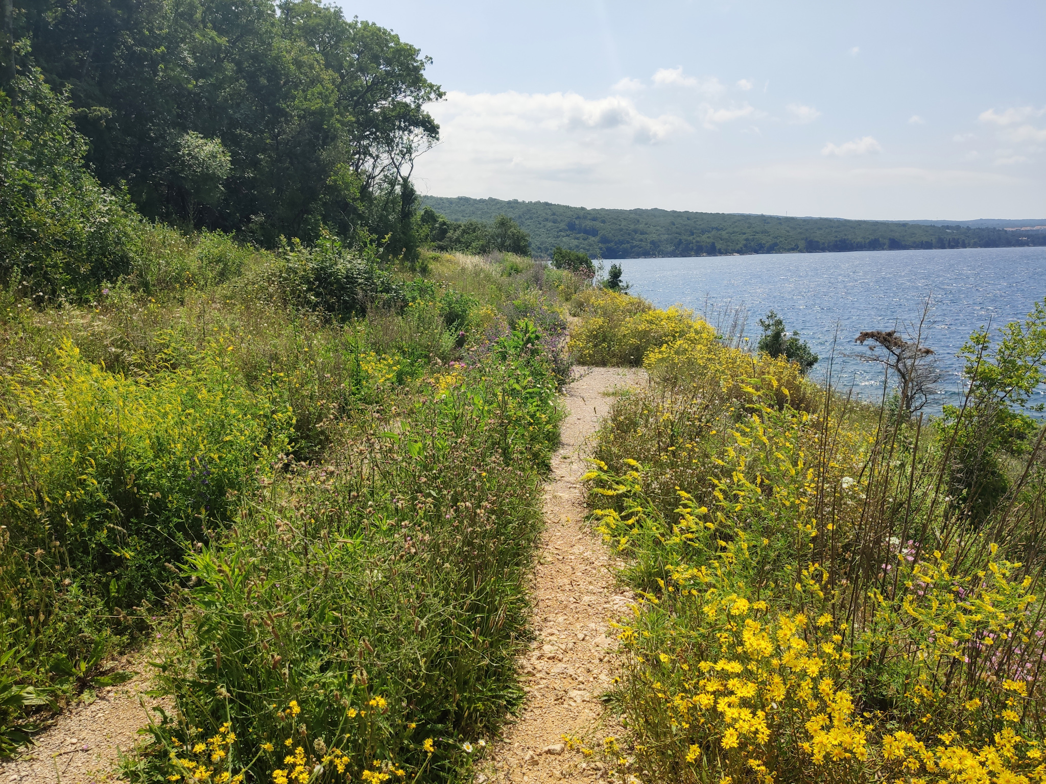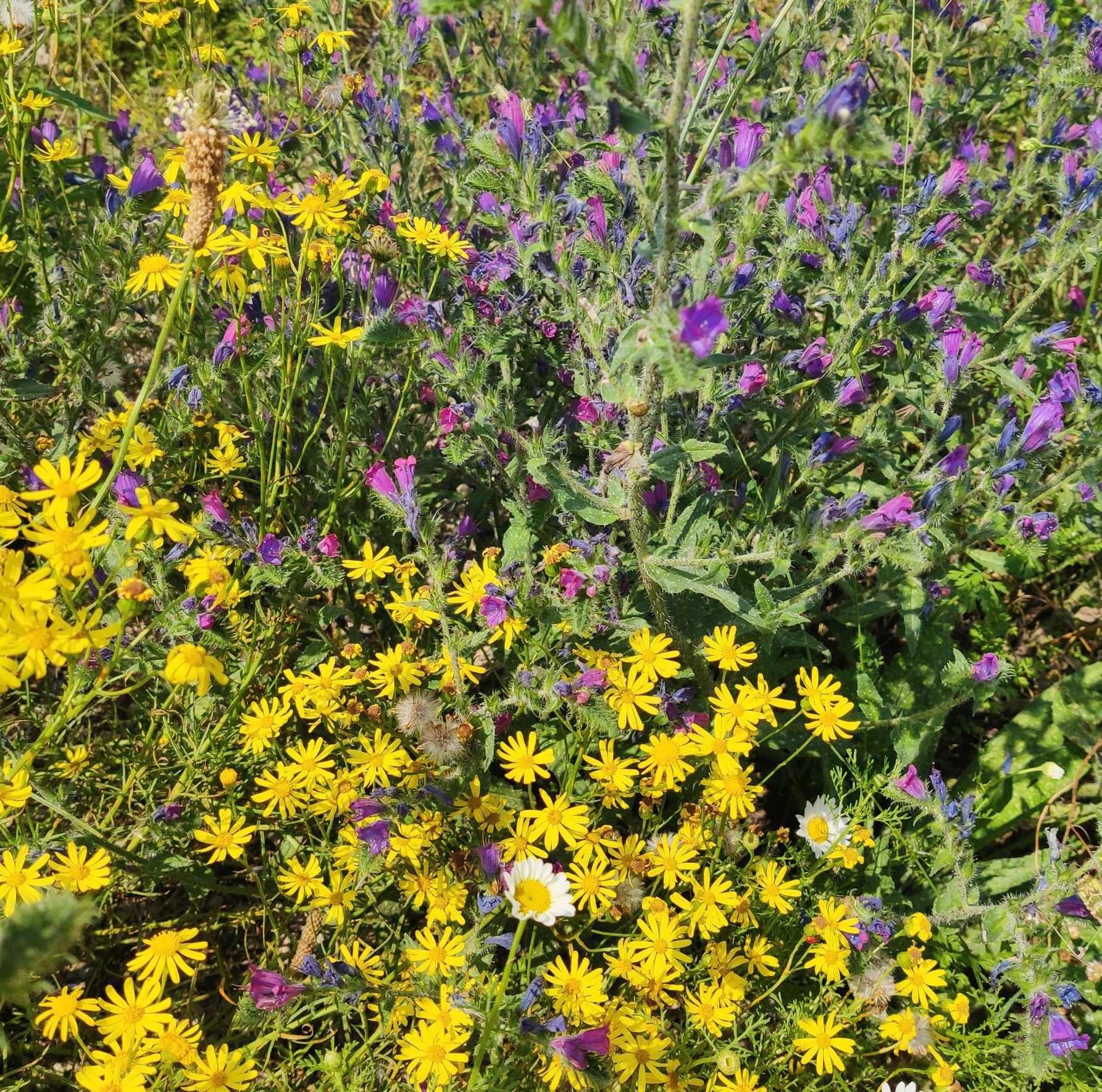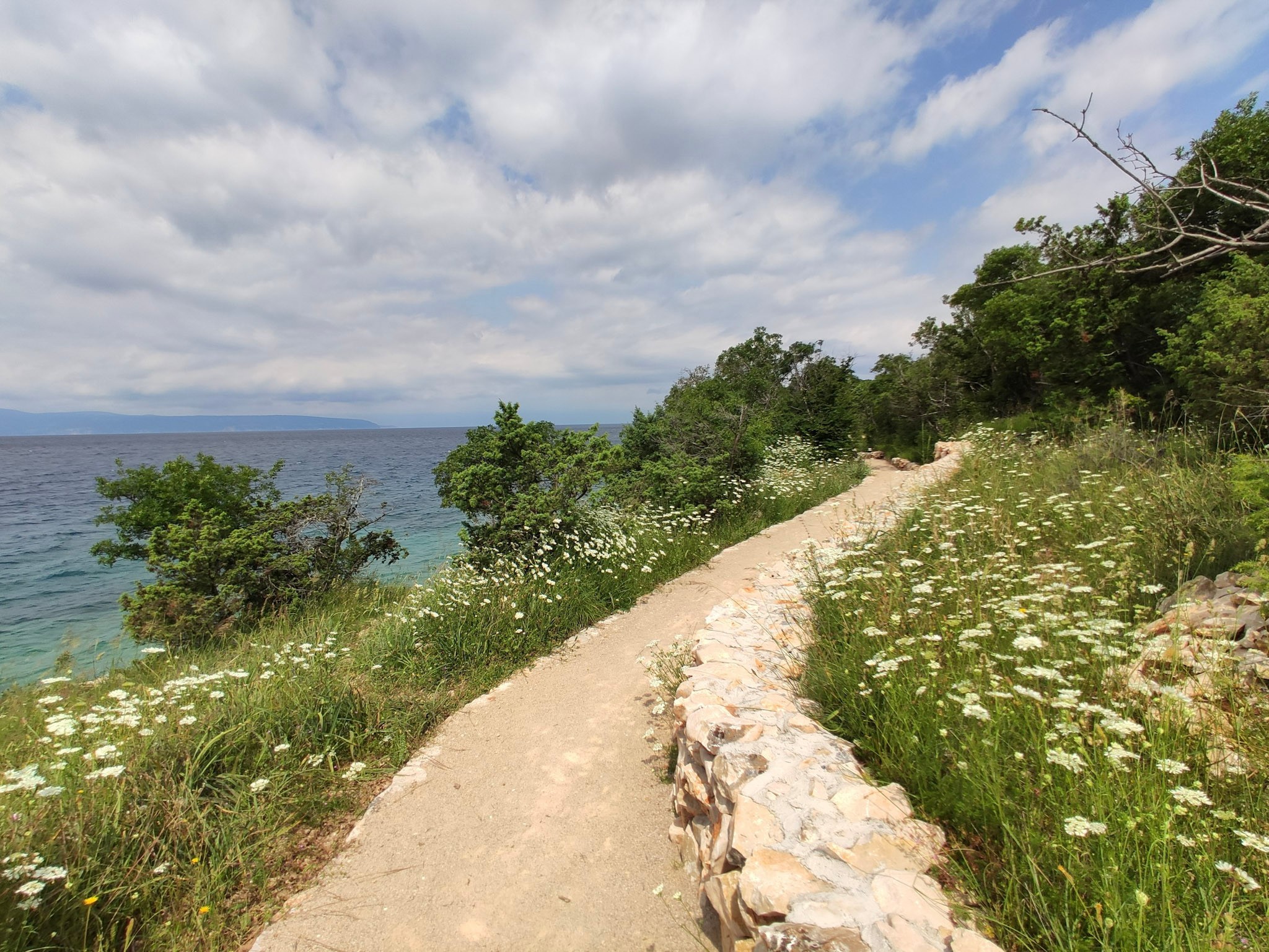 Entlang des Pfades weichen mir erschrocken ein paar braune Schlangen aus, die sich auf den Steinen aufgewärmt hatten. Ums Eck der Landspitze, wieder im Wind, herrscht eine immense, vielfarbige Blütenpracht. Wie toll ist das denn! Ich nehme nun den breiten Fahrweg etwas oberhalb und steche dann irgendwann wieder auf den Paradiesweg hinunter.