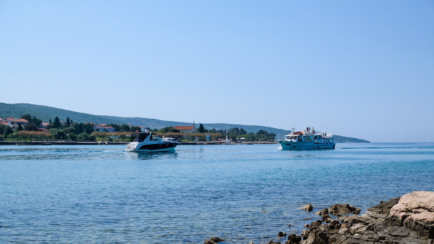 Es geht wieder ein kleines Stück Weg zurück, dann links den Weg gehen, bis man wieder am Wasser steht. Hier kann man nach Punat rüberschauen, der Campingplatz ist sehr nahe. Da in Punat unendliche viele Boote im Wasser und an Land liegen, fahren viele Schiffe vorbei. Das könnte für Stunden ein Zeitvertreib sein. Es gibt sogar FKK-Segler; das durfte ich bei dieser Gelegenheit feststellen.