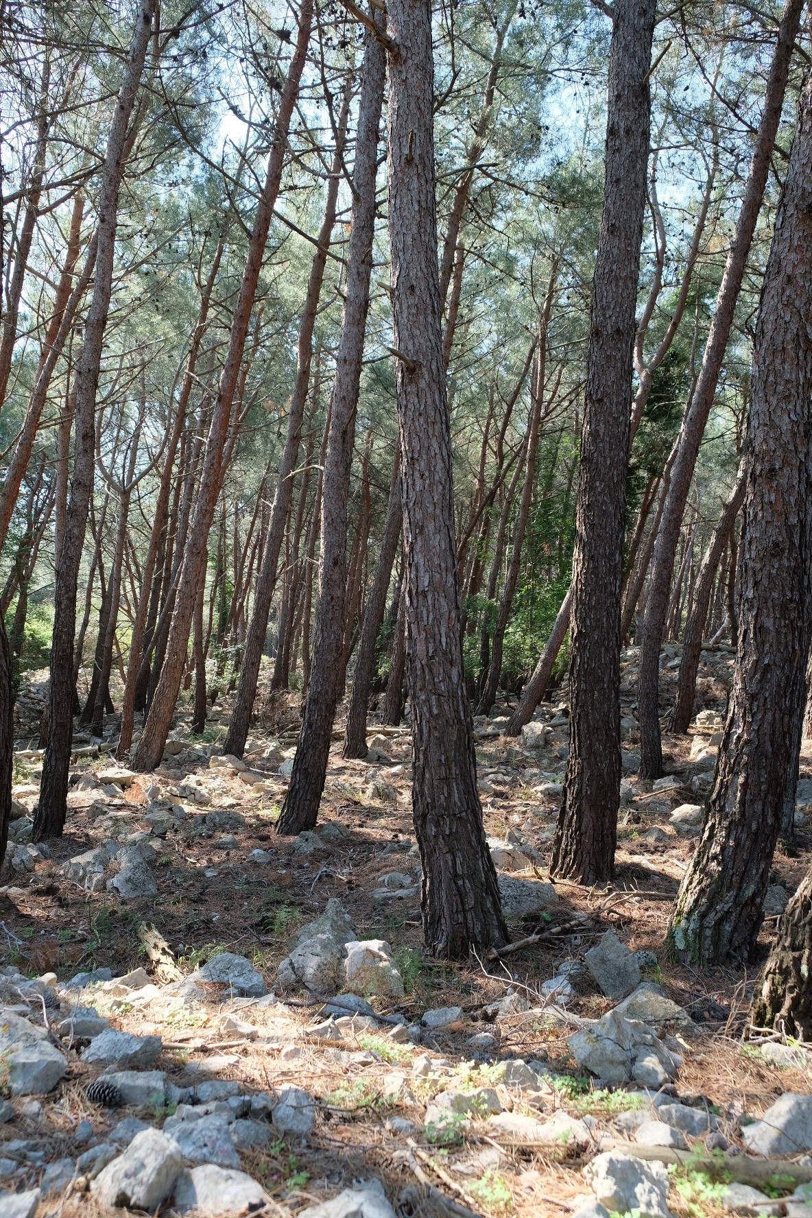 Auf dem Weg durch den Kiefernwald staune ich über die unendlich vielen Steinwälle. Das war ja eine gigantische Arbeit, alle diese grossen Steine aufzulesen und zu Wällen und Trockenmauern aufzuschichten. Diese Wälle durchziehen den ganzen Wald. Waren das wohl früher Olivenplantagen? Sonst würde das kaum Sinn machen, habe ich mir überlegt.