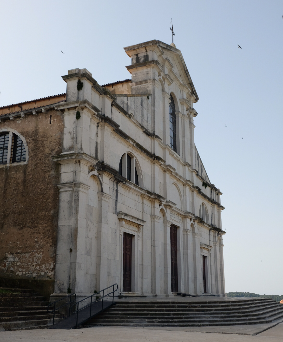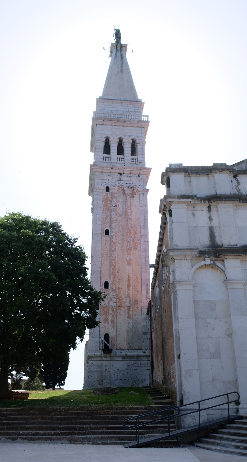 Die Kirche der Hl. Euphemia zuoberst auf der Halbinsel dominiert die Skyline der Altsatdt. Sie ist ein barockes Bauwerk in venezianischem Stil und das größte Denkmal der Stadt, errichtet i. J. 1725. Der dominante Glockenturm gleicht dem Glockenturm des Hl. Markus in Venedig. Die kupferne Statue an der Spitze des Turmes ist 3,9 m hoch. Sie wurde 1758 an der Stelle einer ehemaligen Holzfigur errichtet. Diese wurde durch einen Blitzschlag 1756 vernichtet. Die Statue dreht sich in der Windrichtung um ihre eigene Achse. Das finde ich schon eine sehr extravagante Idee, oder?