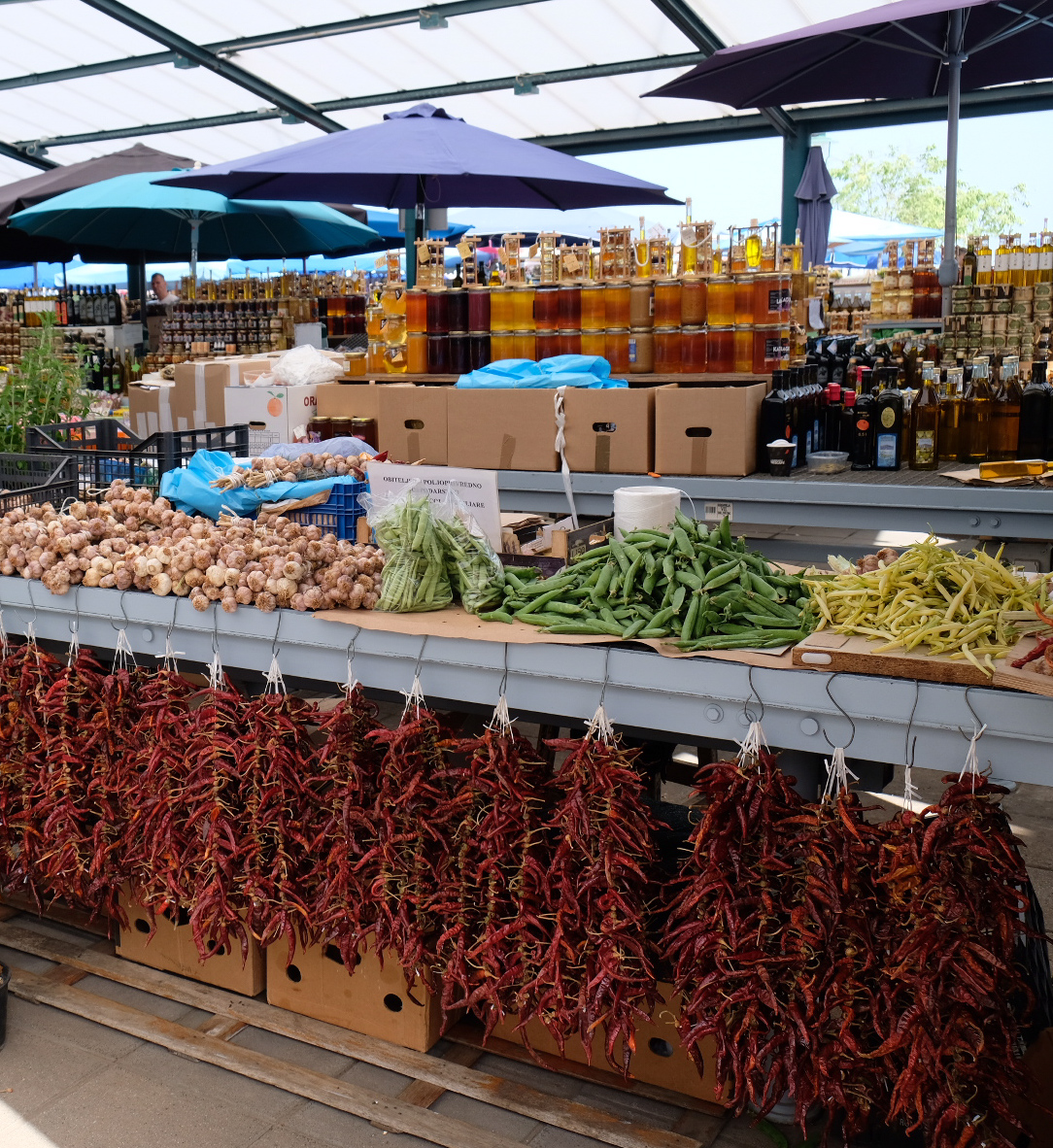Als erstes kann ich gleich die bekannte Silhouette bestaunen und komme zu einem Markt, welcher sich zwischen den beiden Teilen der Altstadt im Übergang zwischen der (nun) Halbinsel und den radial verlaufenden Gassen auf dem Festland befindet. Geschäftige Treiben in einer Mischung aus Touristenartikeln und Angeboten der Bauern. Alles sehr schön präsentiert.