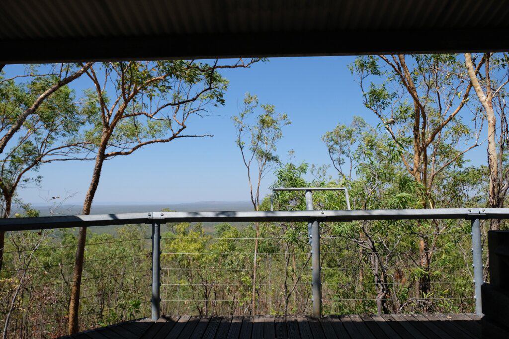 Beim nächsten Parkplatz könnte man auch noch 600m auf den Nawurlandja lookout raufsteigen. Das habe ich auch sein lassen, denn vor dem Mittag wollte ich lieber den Mirrai Lookout über einen 850m langen, moderat ansteigenden felsigen Weg erklimmen. Die Rundumsicht vom Mount Cahill ist von einer Aussichtsplattform (mit Schatten spendendem Dach) fantastisch. Zum Fotografieren stören leider die Bäume, welche höher als die Plattform sind. Runter geht’s dann in der Mittagshitze etwas einfacher.