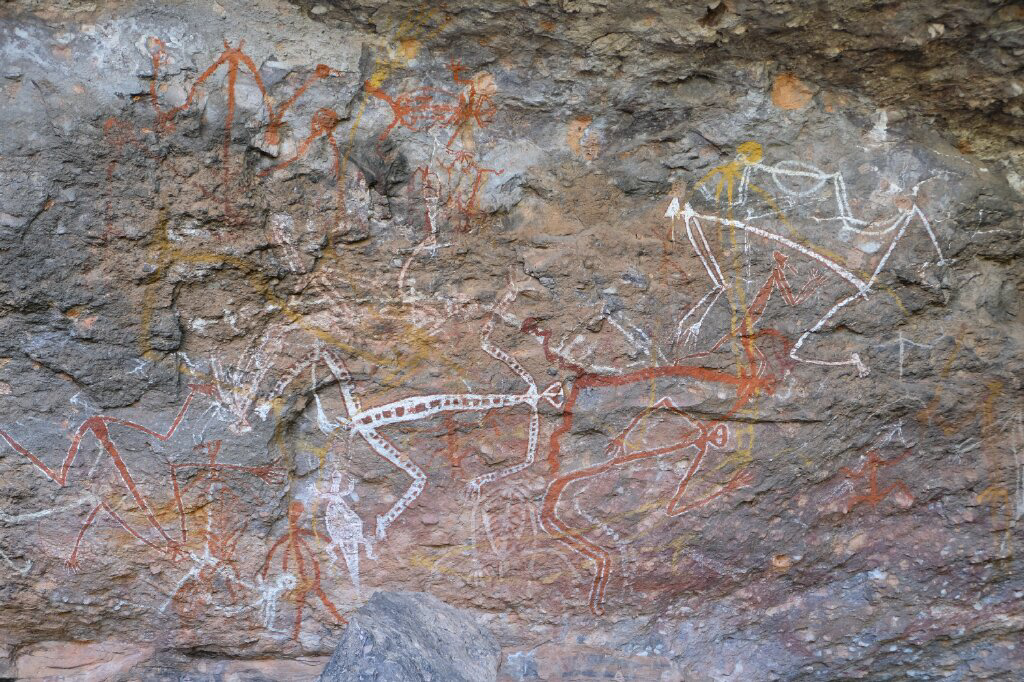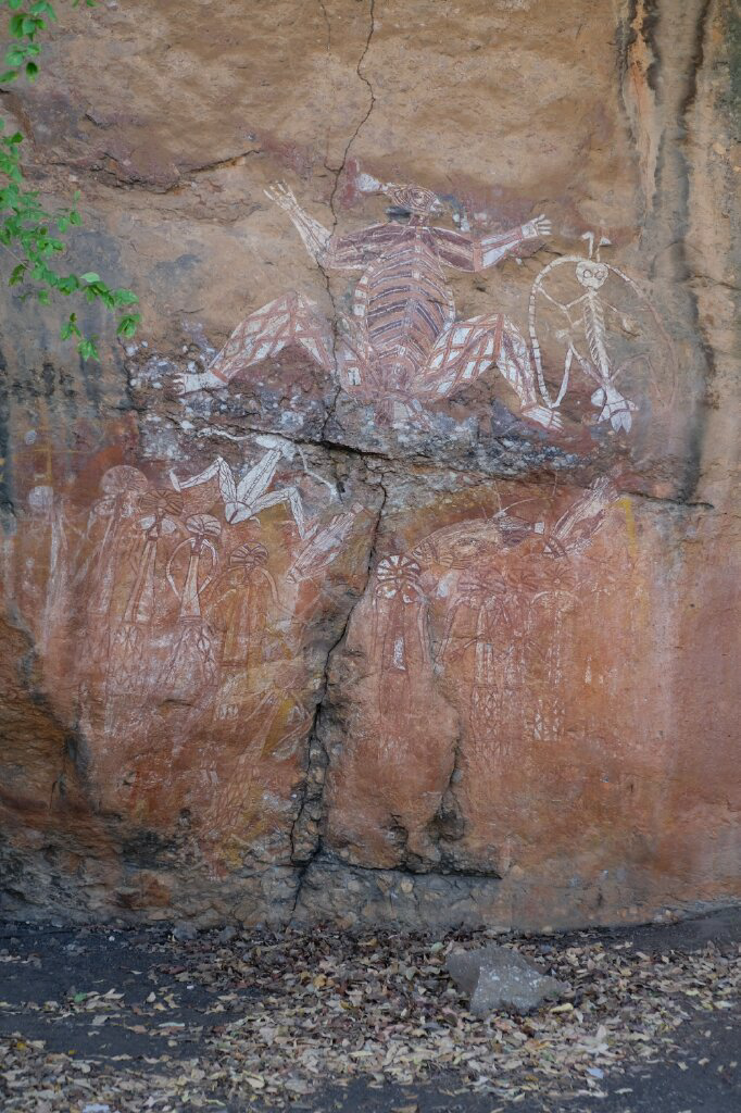 Der Anbangbang Shelter ist der erste auf dem Rundkurs. Die geschützte, kühle und trockene Lage und die Grösse machen sofort klar, warum hier gerne gelebt wurde. Seit 20’000 Jahren bis in unsere Zeit wurde diese Shelter genutzt. Vor 10’000 Jahren, während der Eiszeit, war das Meer aber rund 200-300km weiter entfernt als heute, da der Meeresspiegel sehr viel tiefer war! Weiter geht es durch das zerklüftete Gebiet an mehreren Sheltern vorbei, bis am Ende des Weges die vielfach reproduzieren Bilder der Gestaltenden Vorfahren (Creating Ancestors) Namondjok, Namarrgon und des Lightning Man zu sehen sind. Der Blitz-Mann soll weiter hinten in diesem Felsformationen wohnen und darf nicht gestört werden, da sonst sehr grosses Unheil drohen würde.