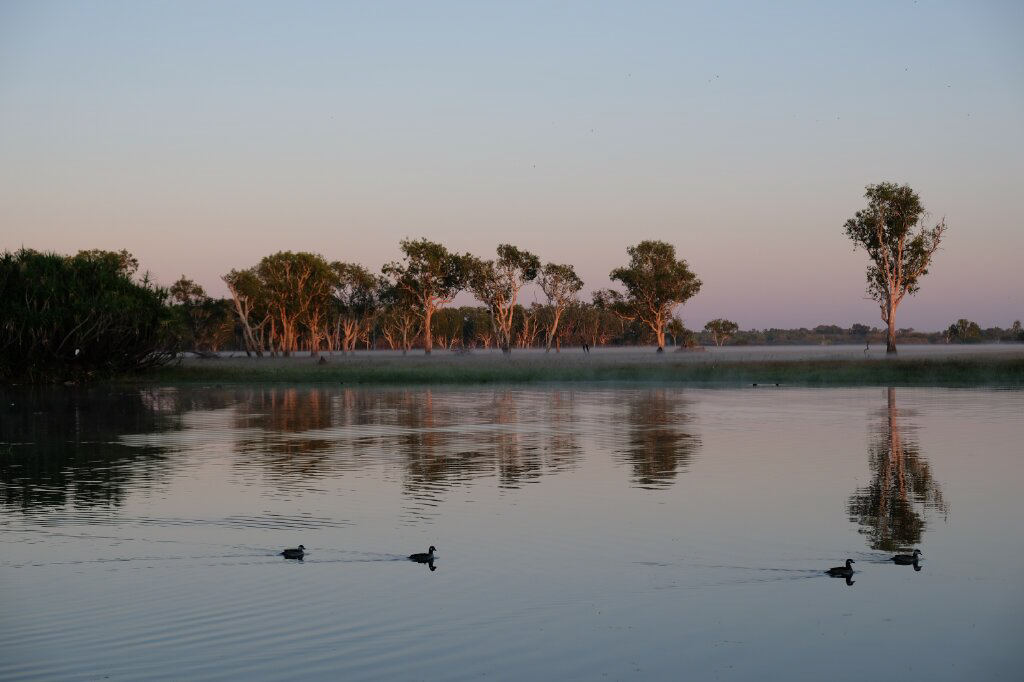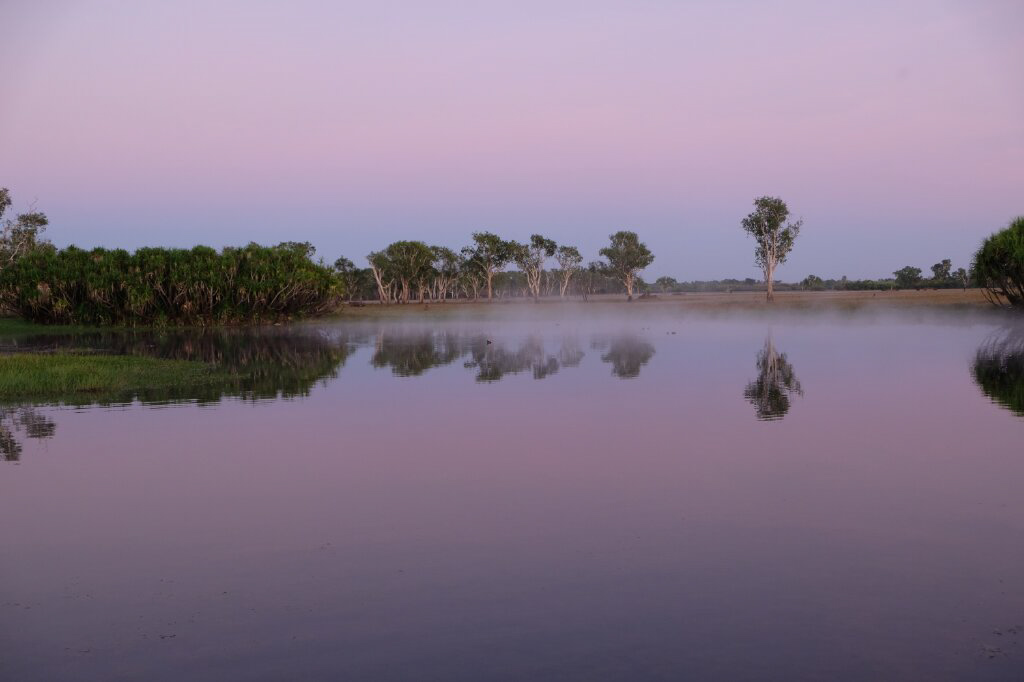 Um 06:25 fuhr dann der Bus mit allen Gästen die 2km zur Anlandestelle des Yellow Water Billabong. Gerade ging der Fast-Vollmond unter und die Morgendämmerung wurde immer stärker und farbiger.