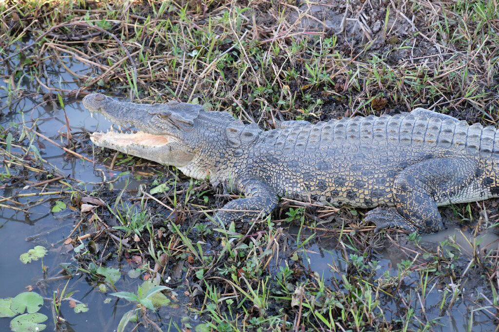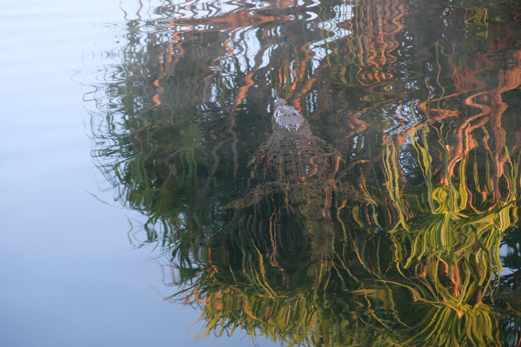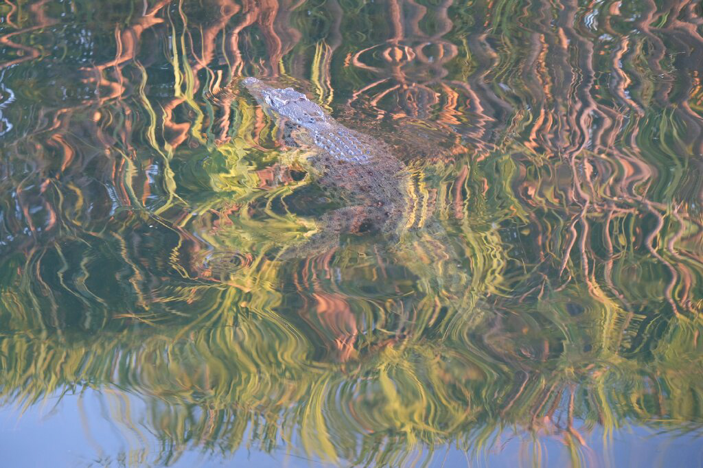 Auf der schnellen Rückfahrt haben wir dann doch nochmal kurz angehalten, um das heute einzige Krokodilmännchen mit den Wellen des Bootes etwas zu ärgern. Die Weibchen hören nach einiger Zeit mit dem Wachsen auf, die Männchen werden mit dem Alter immer riesiger. Auf dieser Cruise hatten wir es bis zuletzt nur mit Weibchen zu tun. Ein altes Weibchen liess sich vom Boot nicht aus der Ruhe bringen und schwamm ruhig an der Seite des Bootes den Fluss hinauf.