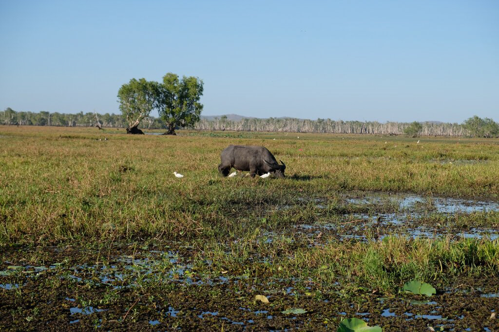 Wir haben uns nach den üblichen Sicherheitshinweisen (Gebrauch der Schwimmwesten für den Krokodilfluss!!!) auf den Weg gemacht und der Guide hat uns sehr viel erzählt. Aber irgendwie war die Aufmerksamkeit eher auf die Tierwelt und die Landschaft gerichtet. Der Guide hat uns aber super zu vielen Gingas, Vogelarten, Wallabies und einen Büffel herangeführt und perfekt sehr vieles erklärt.