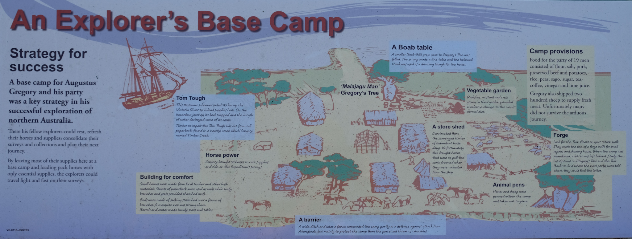 Gregorys Boot wurde an am Ort vom heutigen Timber Creek zerstört. Es wird gesagt, dass Gregory den Standort Timber Creek benannt hat, nachdem er Holz geschlagen hatte, um das Loch in seinem Schiff zu reparieren. Der Affenbrotbaum markiert das Gebiet von Gregors „Verschanzungslager“ von Oktober 1855 bis Juli 1856 und trägt immer noch Inschriften, in denen das Datum der Ankunft und Abfahrt aus dem Lager vermerkt ist.