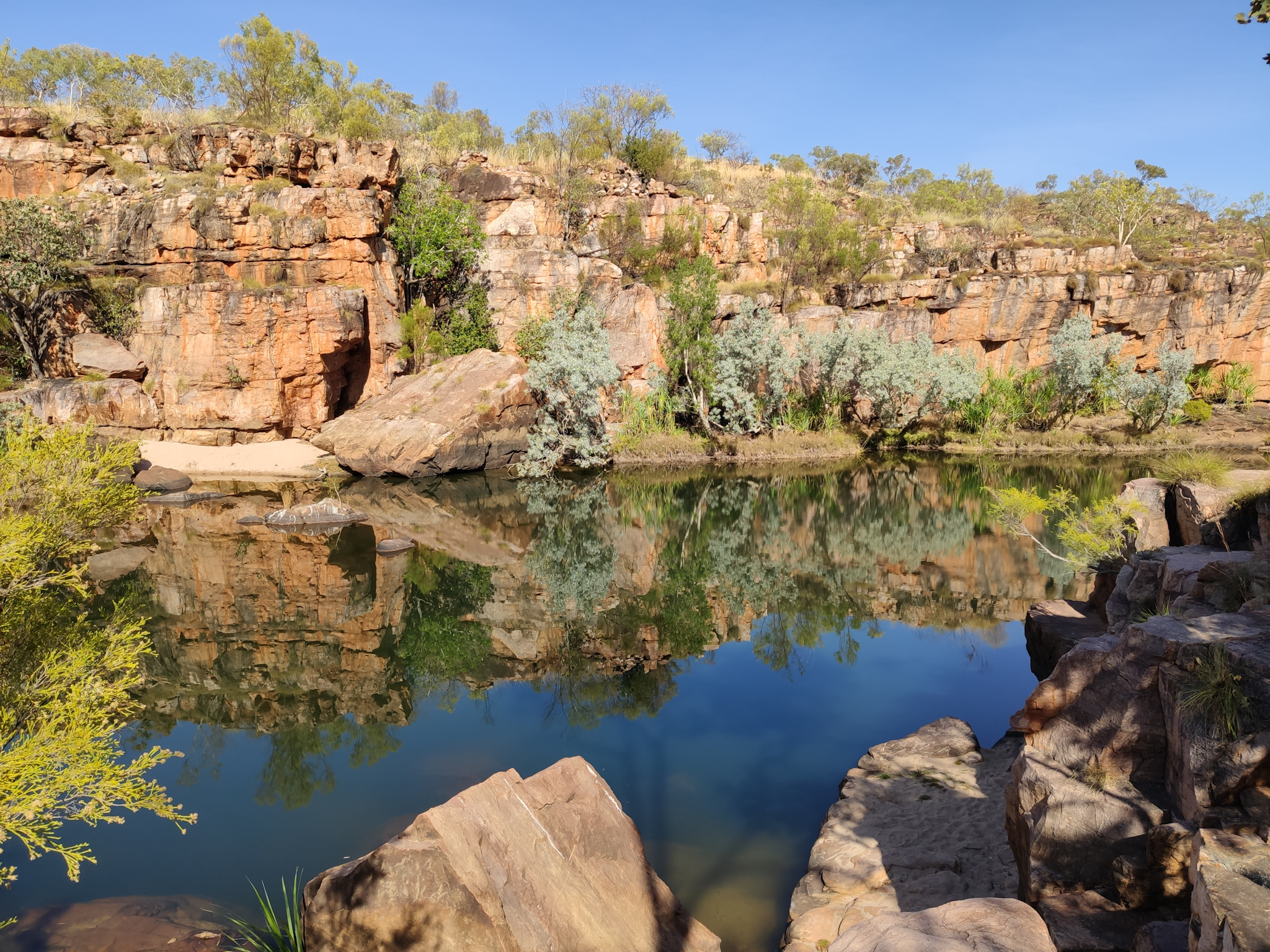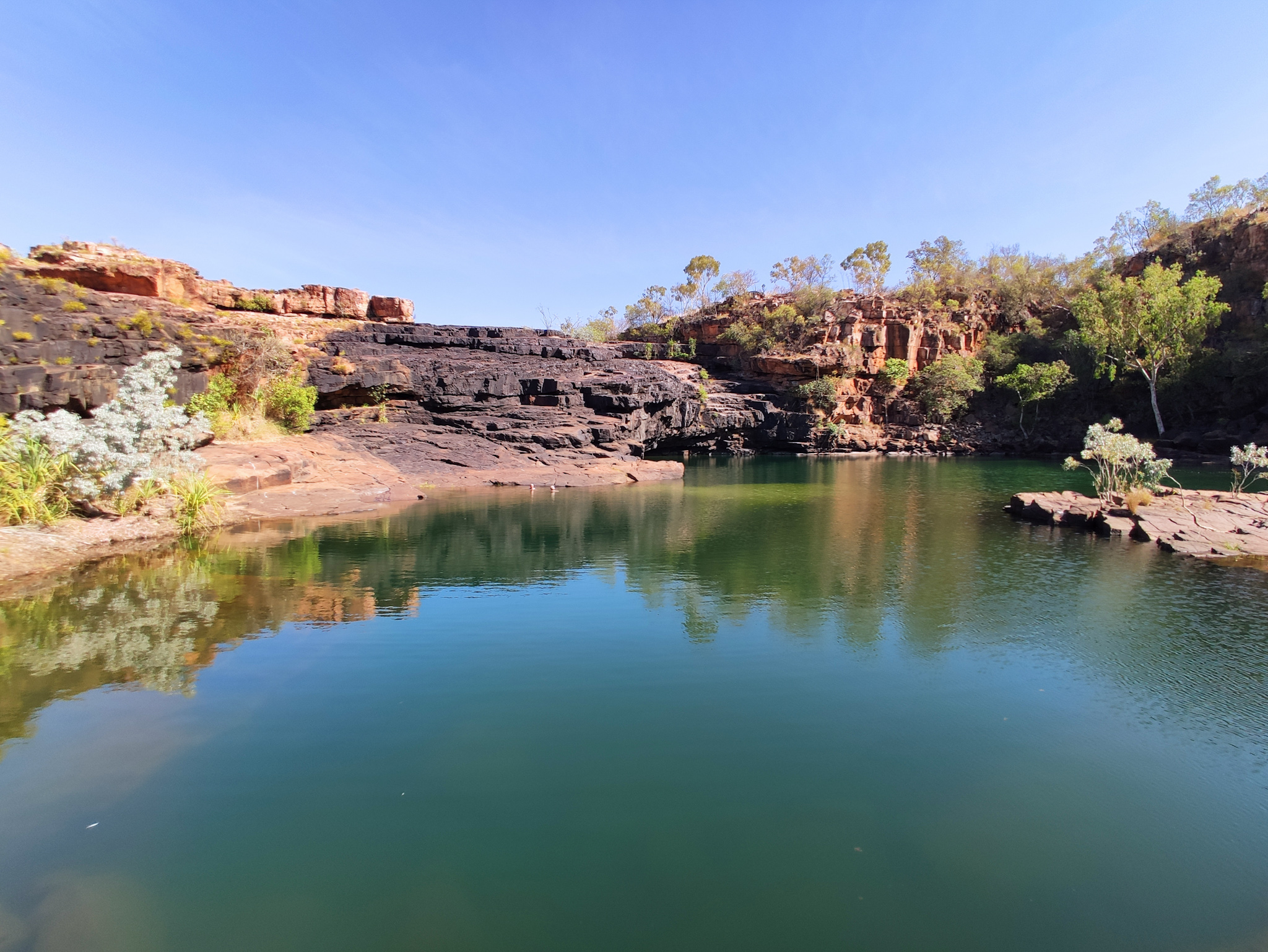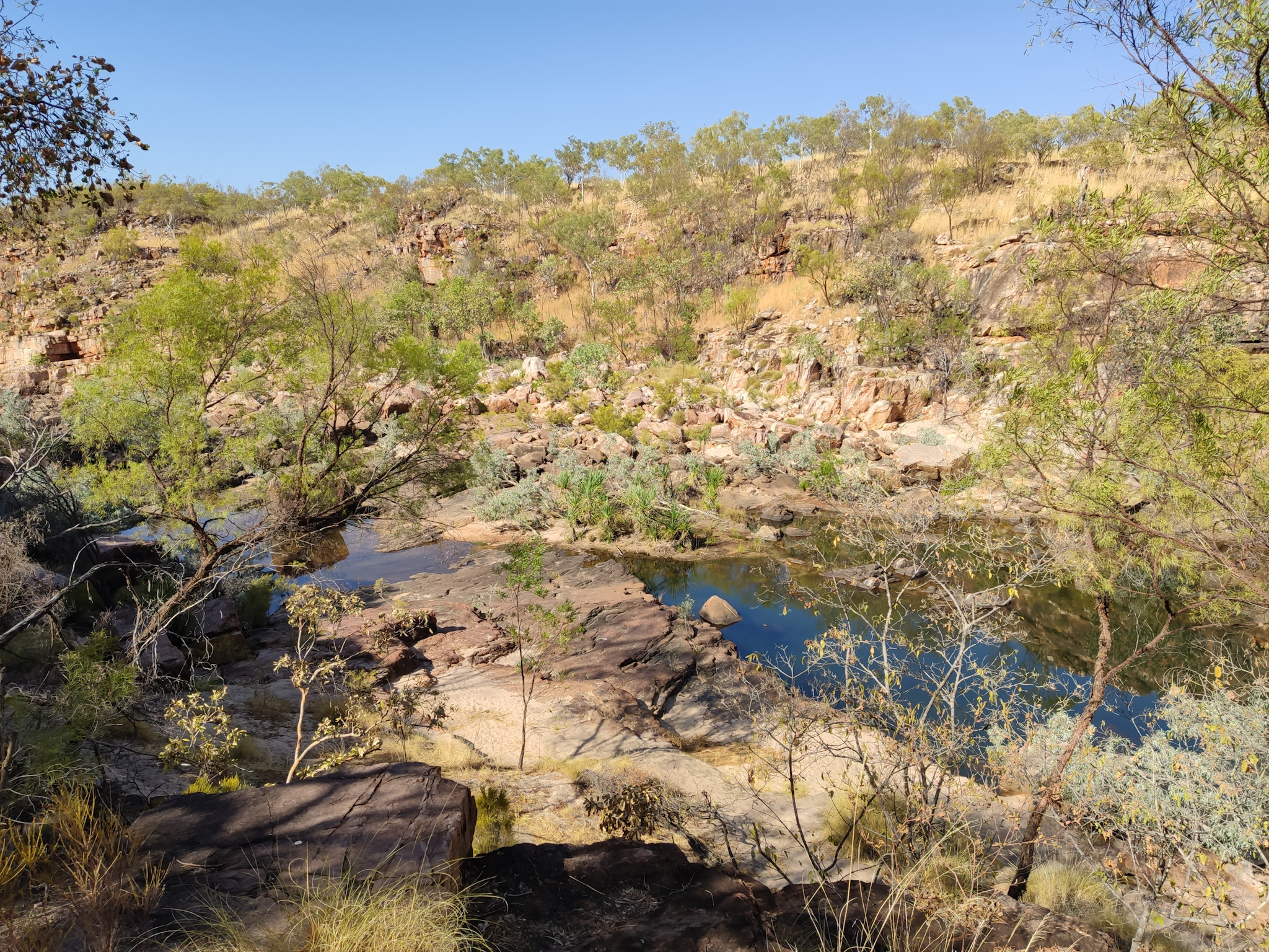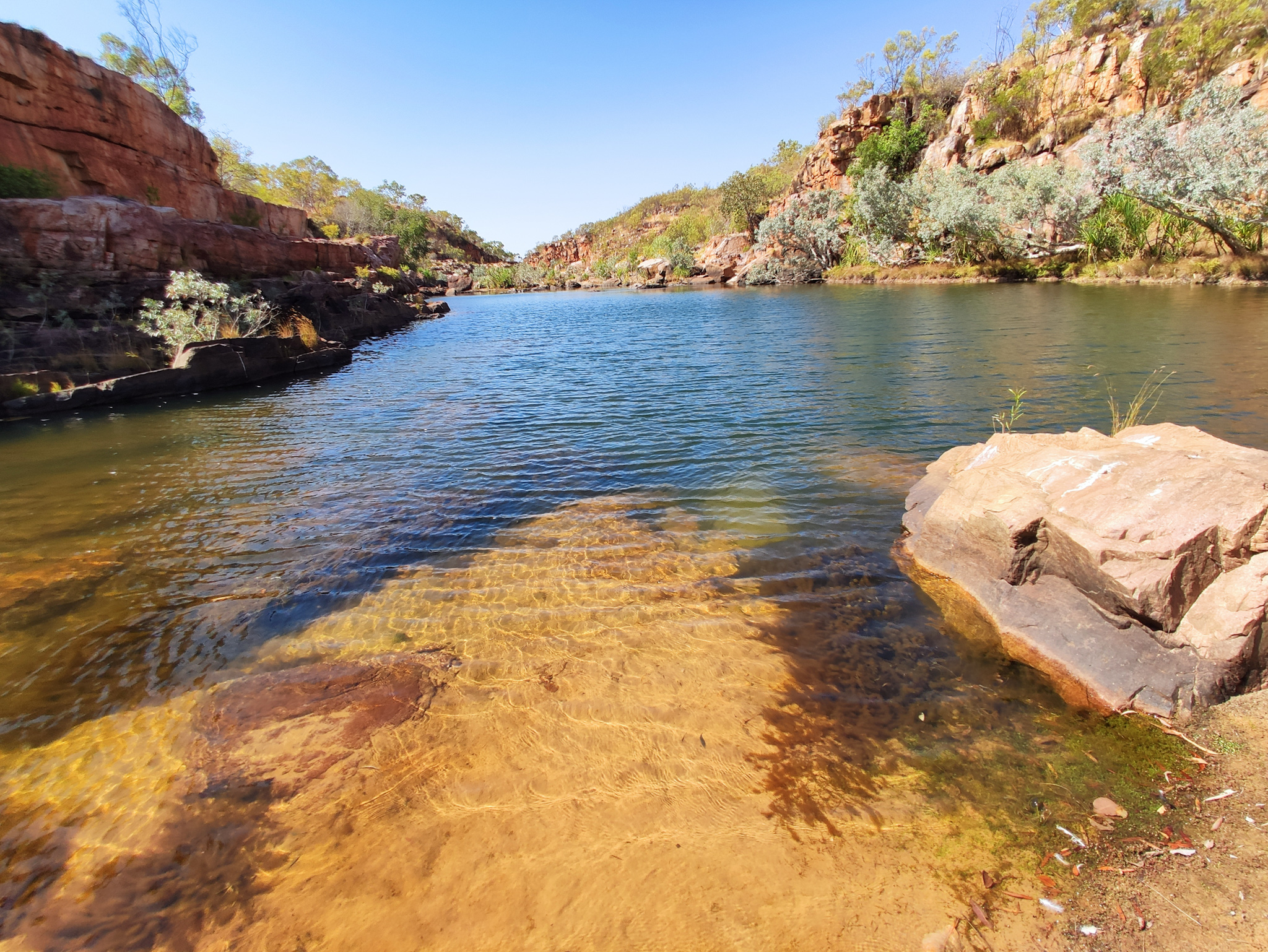 Schön erfrischt geht es dann auf die Wanderung durch die fast schattenlose Savanne, am Ende durch zwei Creeks und dann runter in den Manning Gorge zu den zwei Pools mit den Falls.