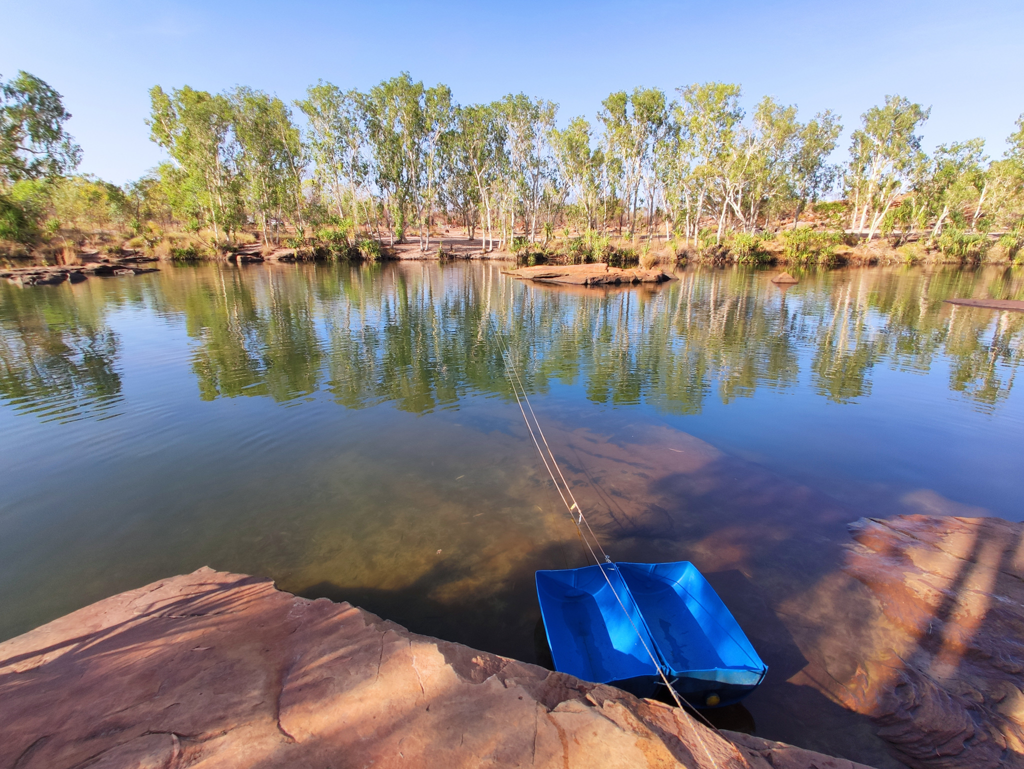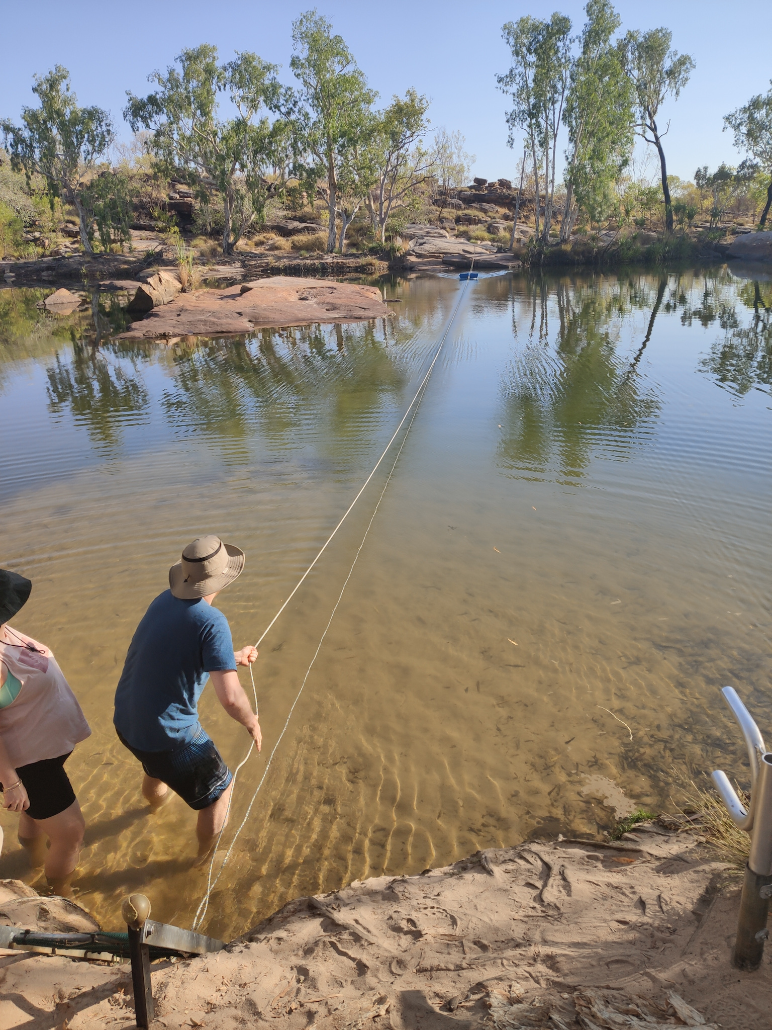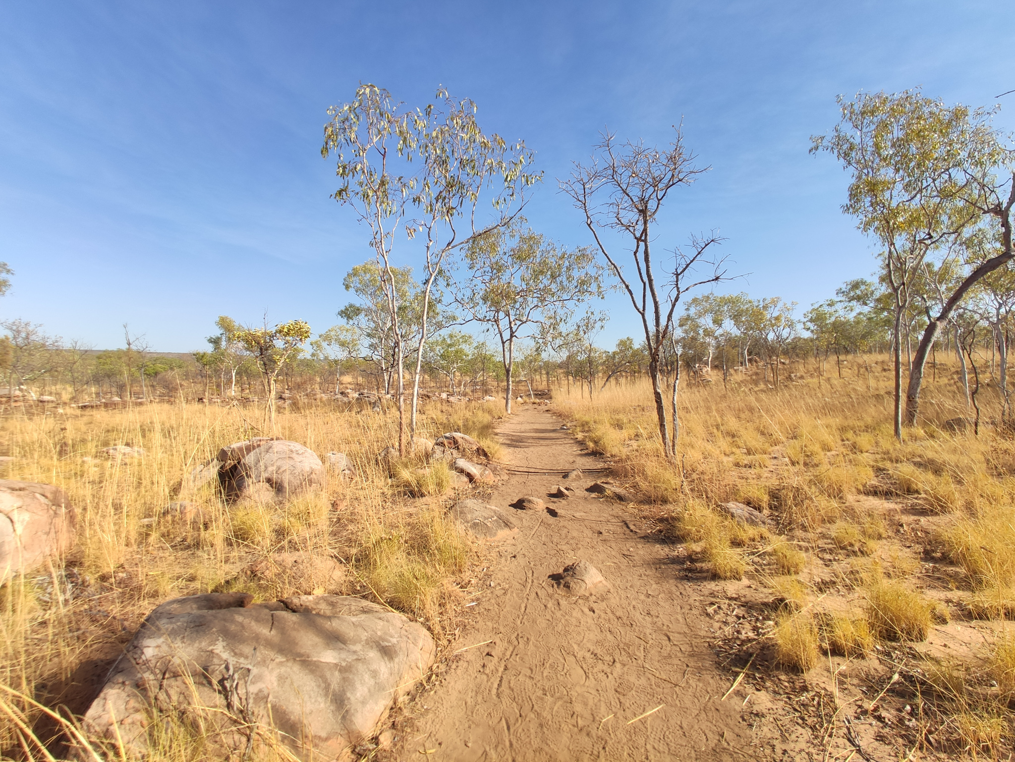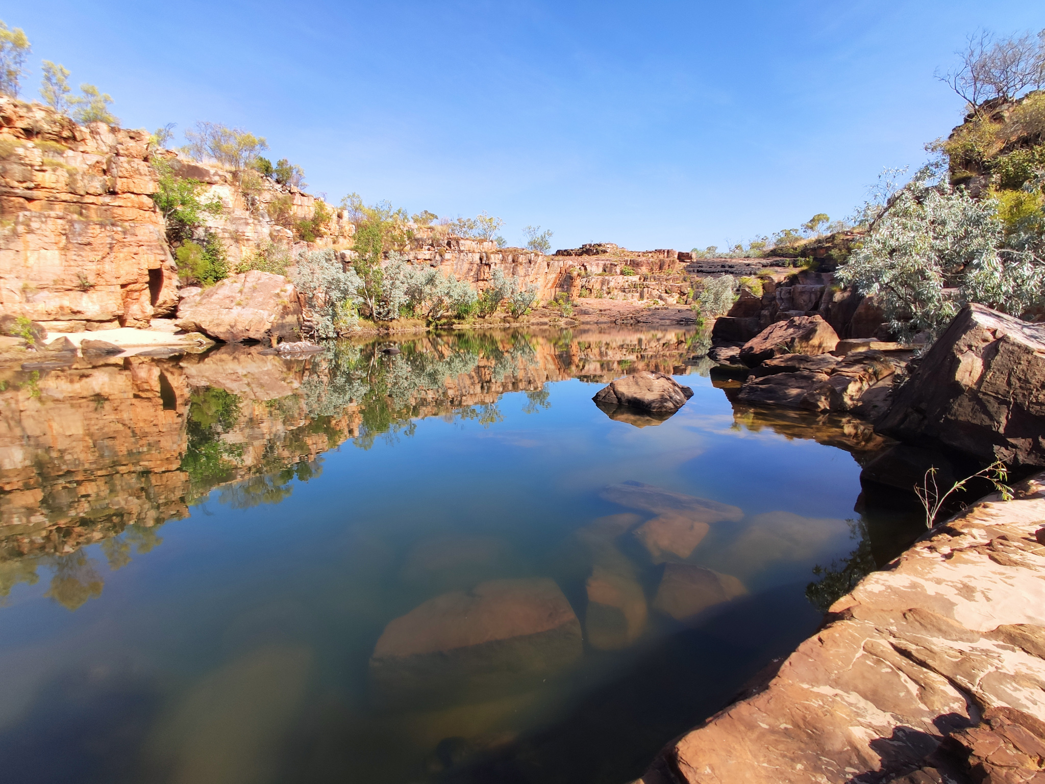 Schön erfrischt geht es dann auf die Wanderung durch die fast schattenlose Savanne, am Ende durch zwei Creeks und dann runter in den Manning Gorge zu den zwei Pools mit den Falls.