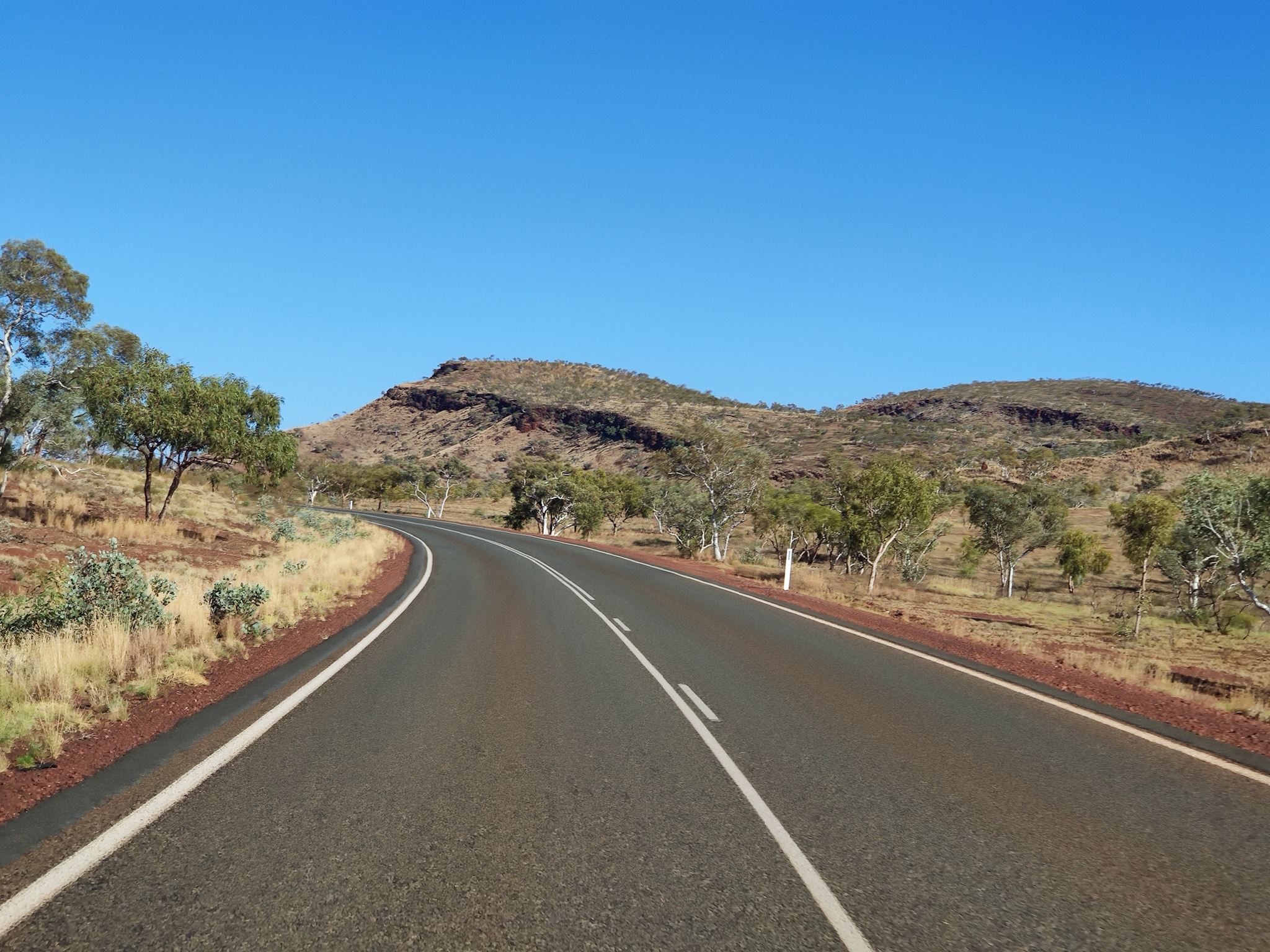 Dann machte ich mich auf die nächsten 260km auf dem Great Northern Highway Richtung Newman. Die Landschaft wird nun mit den Ausläufern der Pilbara deutlich interessanter. Diese Strecke wurde nach genauer Evaluation von mehreren Varianten möglichst umwelt- und kultur-schonend gebaut und 1987 dem Verkehr übergeben.