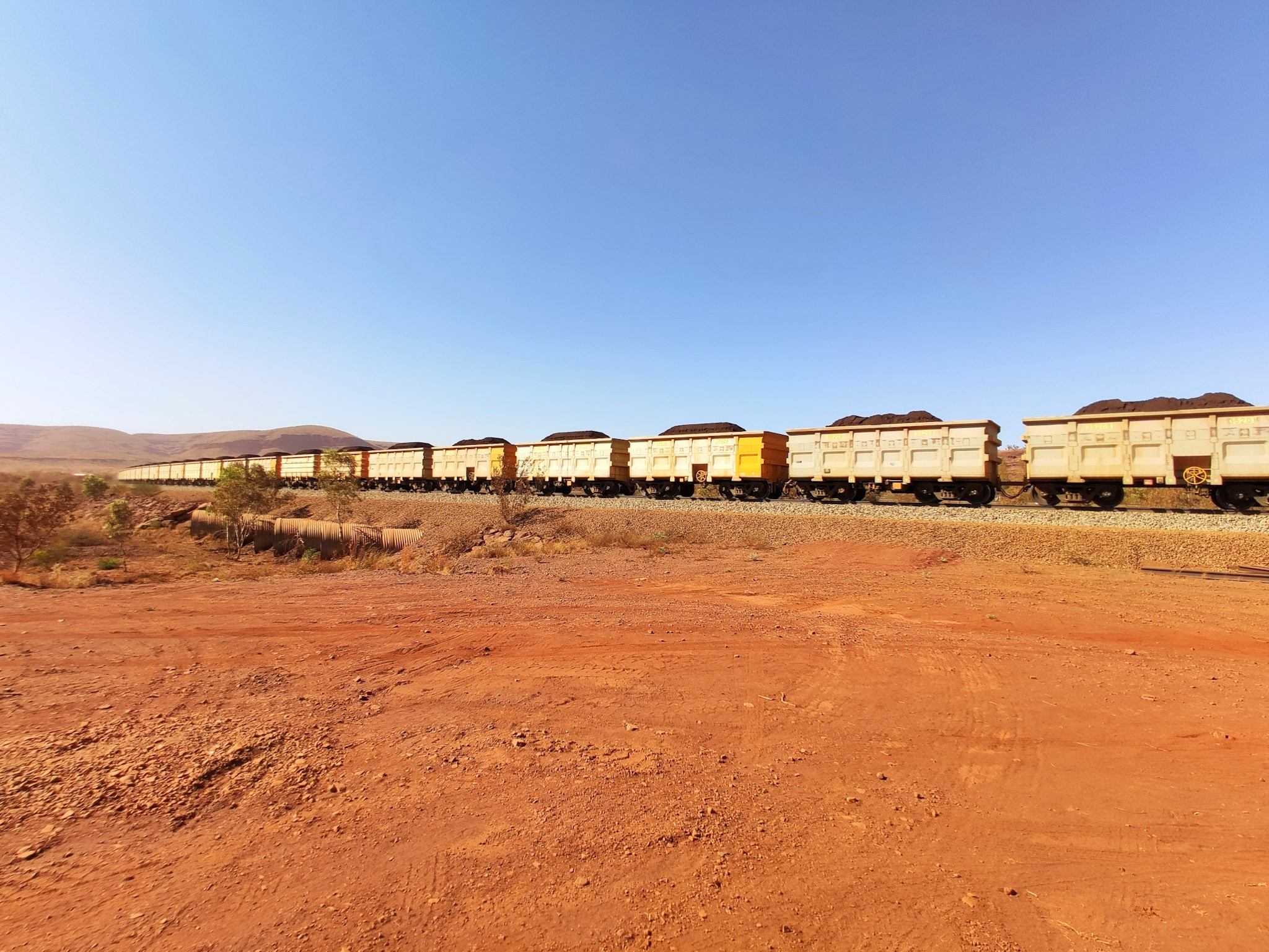 Ein typischer Zug auf dem Tom Price-Liniensystem, der alle Südminen bedient, hat drei Lokomotiven und 240 Erzwaggons. Jeder Wagon ist mit bis zu 130 Tonnen Erz beladen.