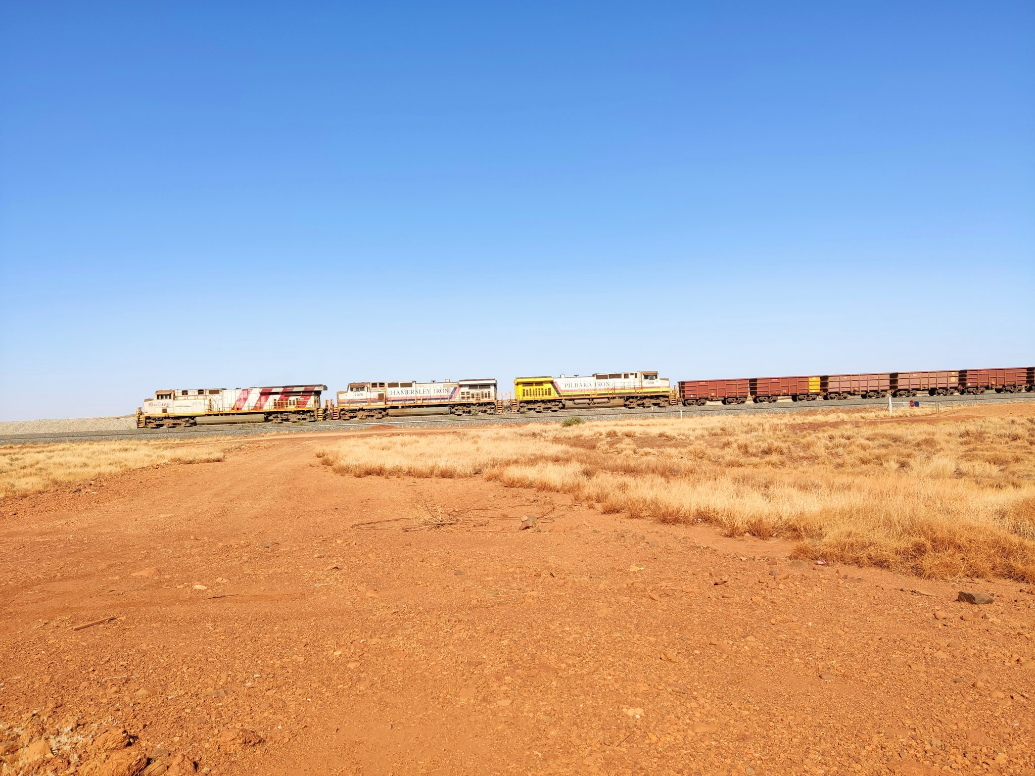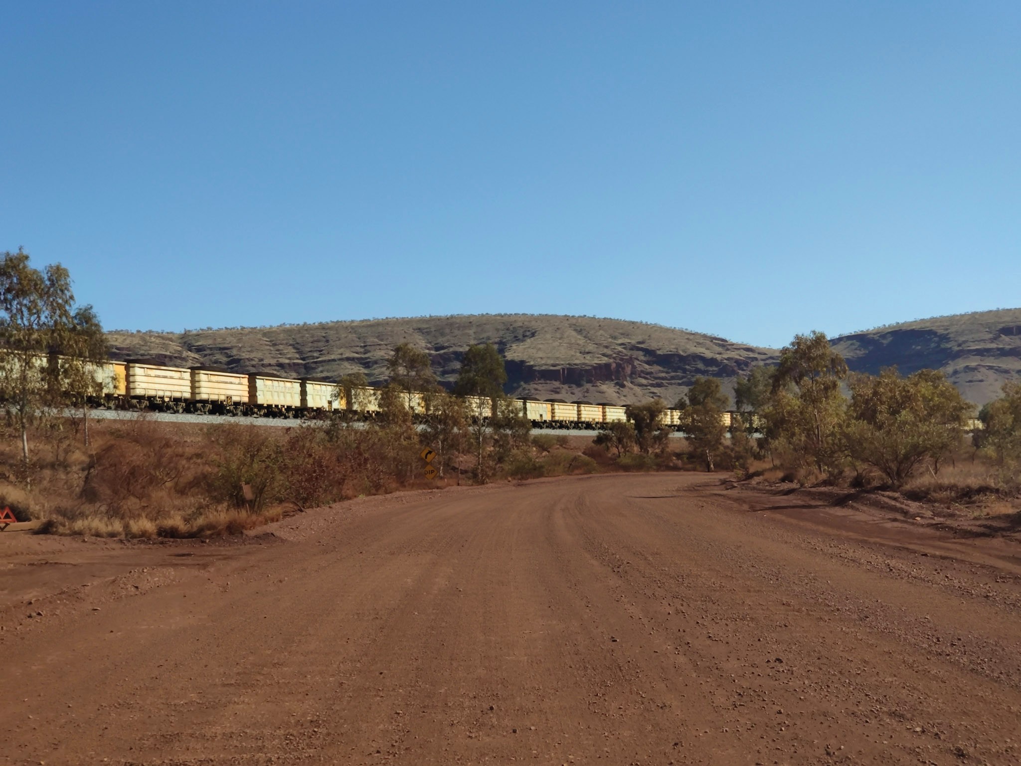 Ich habe nun heute Morgen die 120km entlang der grünen Eisenbahnlinie im obenstehenden Bild in Angriff genommen. Diese Eisenbahnlinie gehört zum rund 2’600km langen privaten Eisenbahnnetz in der Pilbara. Es soll wohl das längste private Eisenbahnnetz der Welt sein. Und es wächst mit jeder neuen Mine. Momentan seien zwei weitere Minen-Gesuche in Bearbeitung. 16 Minen sind in Betrieb.