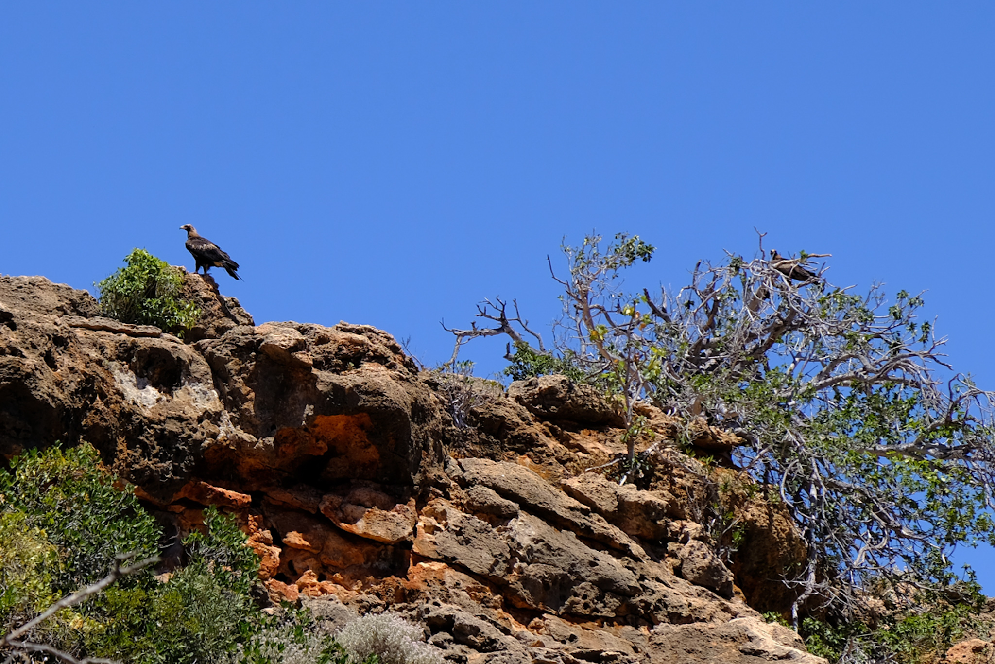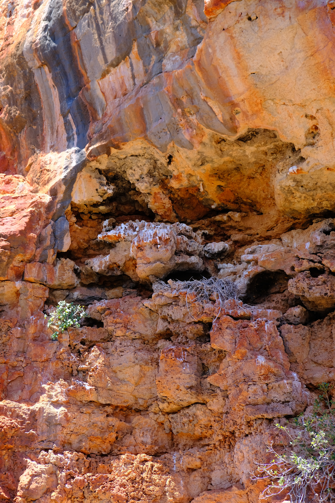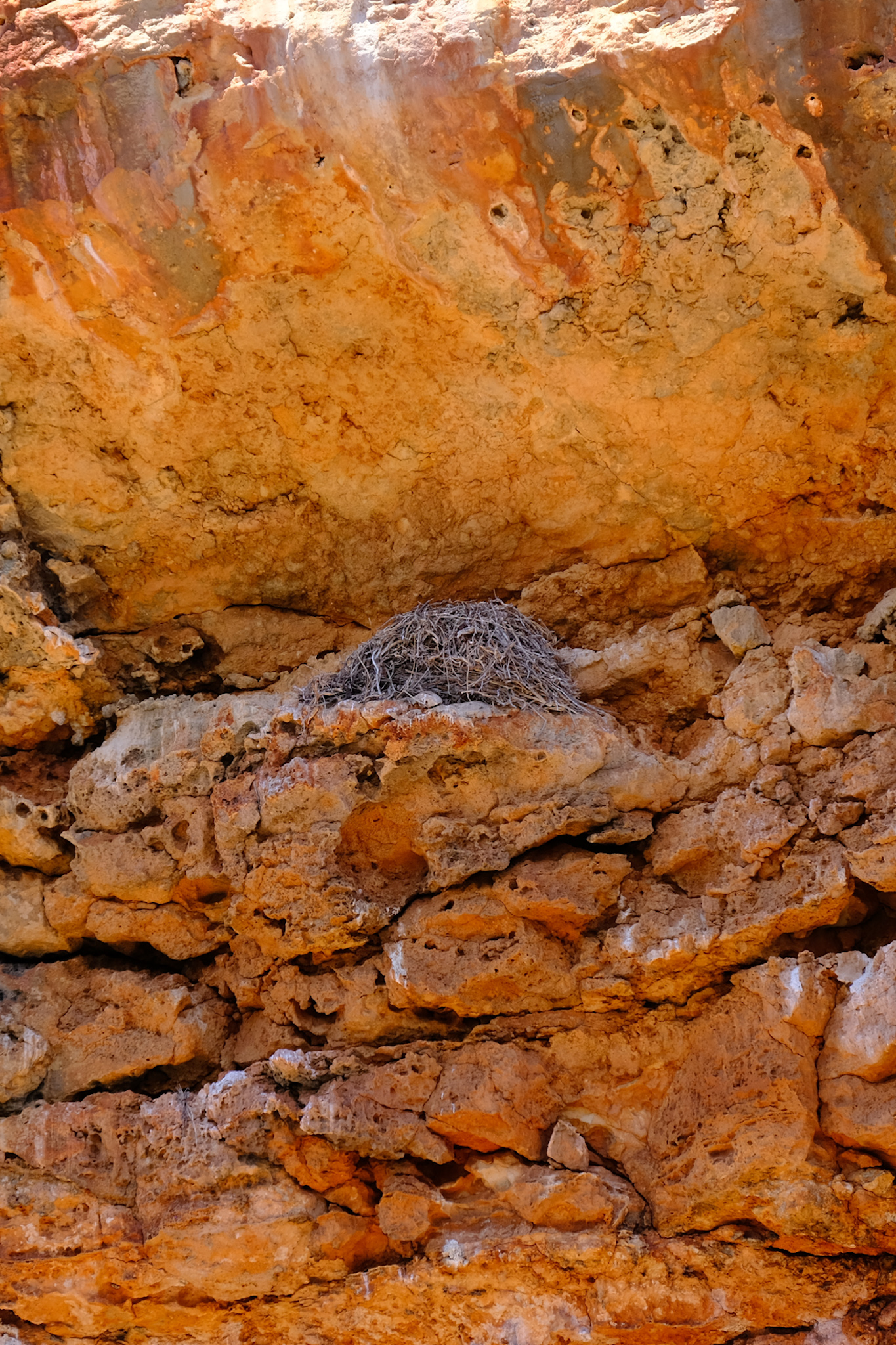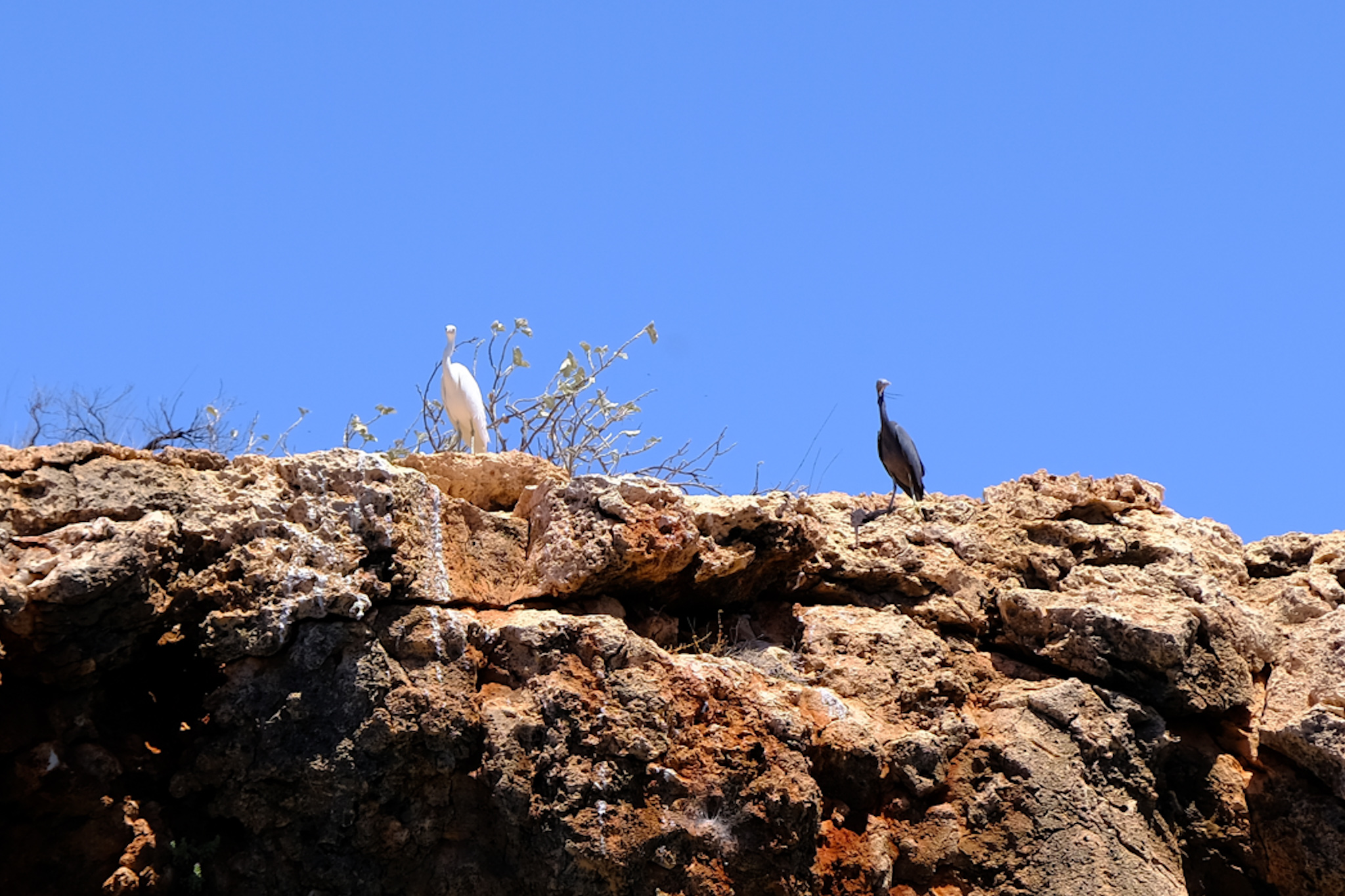Canyonwände in Cape Range sind wichtige Nist- und Rastplätze für Vögel. Ständiges Wasser, Nahrung und Schutz vor Raubtieren machen diese Felswände besonders gastfreundlich. Der Seeadler und der Fischadler bauen hier die grössten Nester. Das Nest wird für jedes neue Gelege restauriert und kann bis zu 2 Meter breit sein. Eines der Nester wurde schon von den Entdecker vor rund 150 Jahren gefunden. Viele willkommene Schwalben nisten an diesen Wänden. Man kann ihre Flug Akrobatik bewunden, während sie fliegende Insekten jagen. An den Wänden wachsen Feigen, die Nistplätze für die Reiher und Früchte für Laubvögel bieten. Die weissen Streifen, welche man an den Felswänden beobachten kann, sind Vogelkot von den vielen Vögeln, die hier brüten und nisten: Darunter sind Turmfalken, australische Zwergscharben (Kormorane), (schwarze und weisse) Schlangenhalsvögel und sogar die kleinen Nacktaugenkakadus, die sich hier an das Nisten in Felsspalten gewöhnt haben.