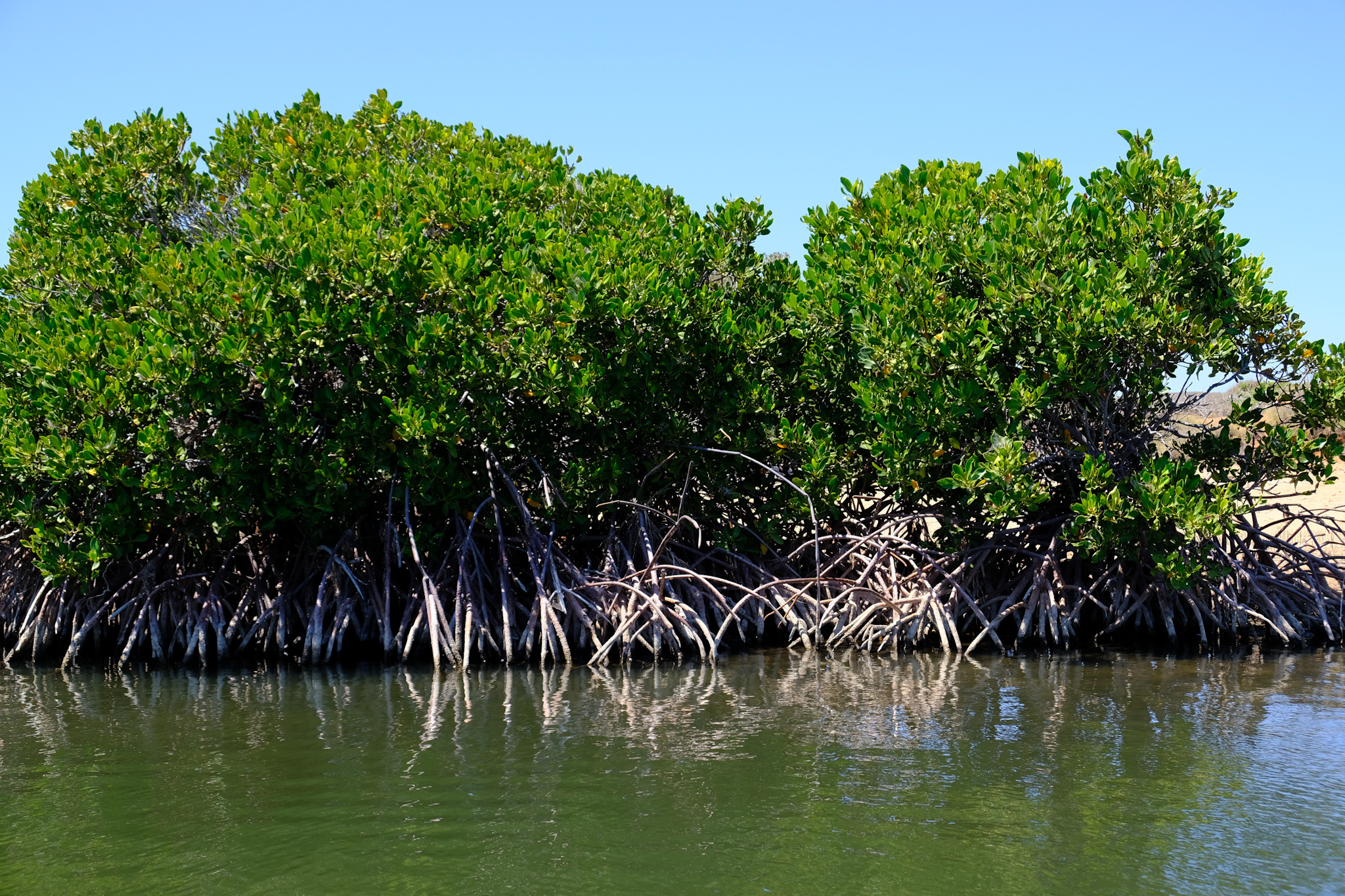 Am Gezeitenrand sind Mangroven kleine Bäume und Sträucher, die in der Nähe der Bachmündung gedeihen. Hier gibt es eine Mischung aus tropischen und gemässigten Arten, darunter die rote Mangrove mit Stelzwurzel (mit dunkleren grünen Blättern), die sich am südlichsten Ende des Bachlaufes befindet. Mangroven sind hochproduktive Ökosysteme, die eine Vielzahl von Tierarten unterstützen und ein Paradies für Jungfische und Krebstiere darstellen. Man kann in den Mangroven und Sandebenen nach Fischreihern (Erons, Egrets) und Austernfischern, die nach Nahrungsmitteln wie Sumpfkrabben suchen. Sie können sogar Euros (Wallaroos) sehen, die unter den Bäumen im Schatten liegen. In der Nacht fangen insektenfressende Fledermäuse fliegende Insekten auf ihrem Flug über die Mangroven und über das Wasser.