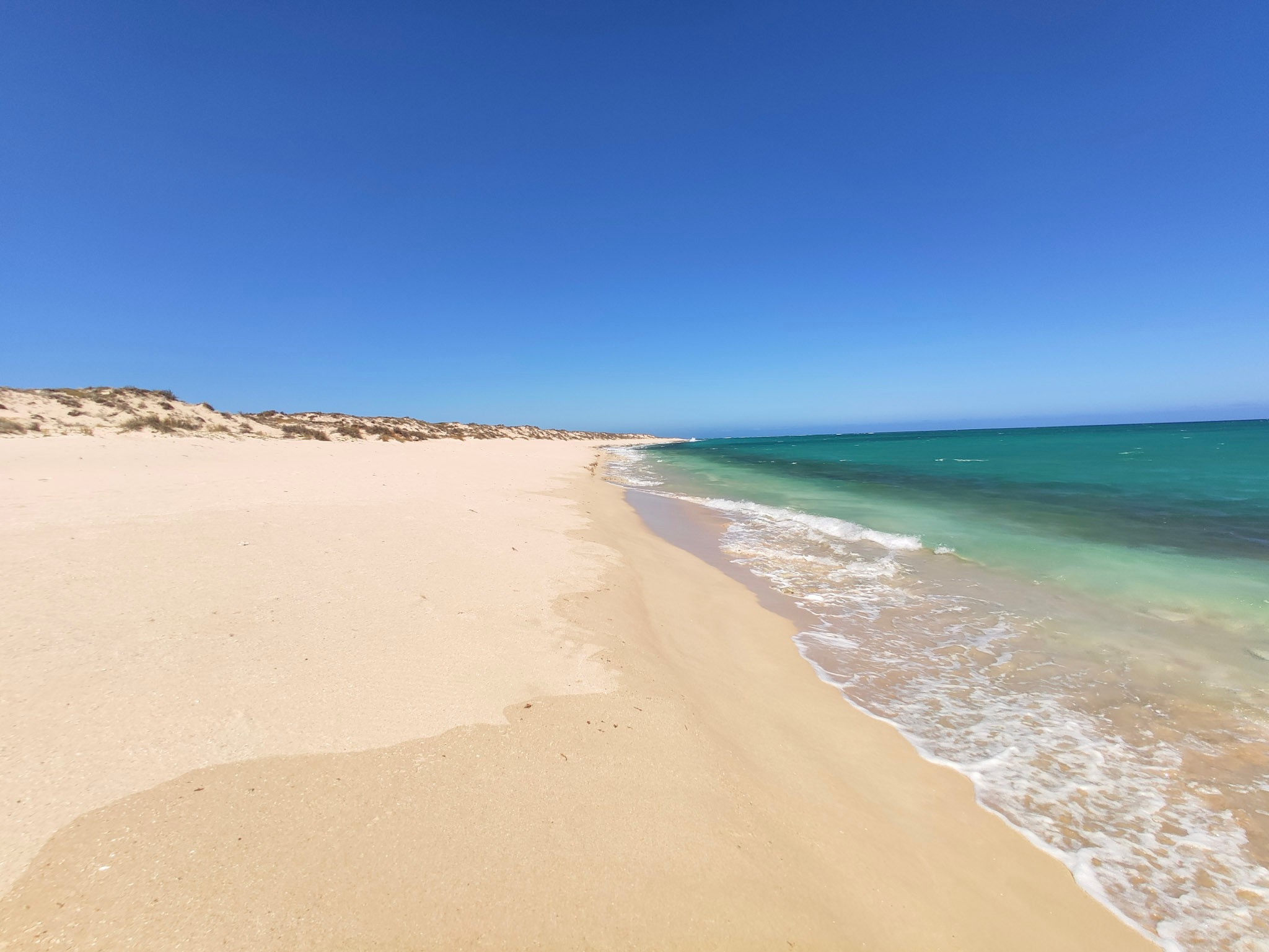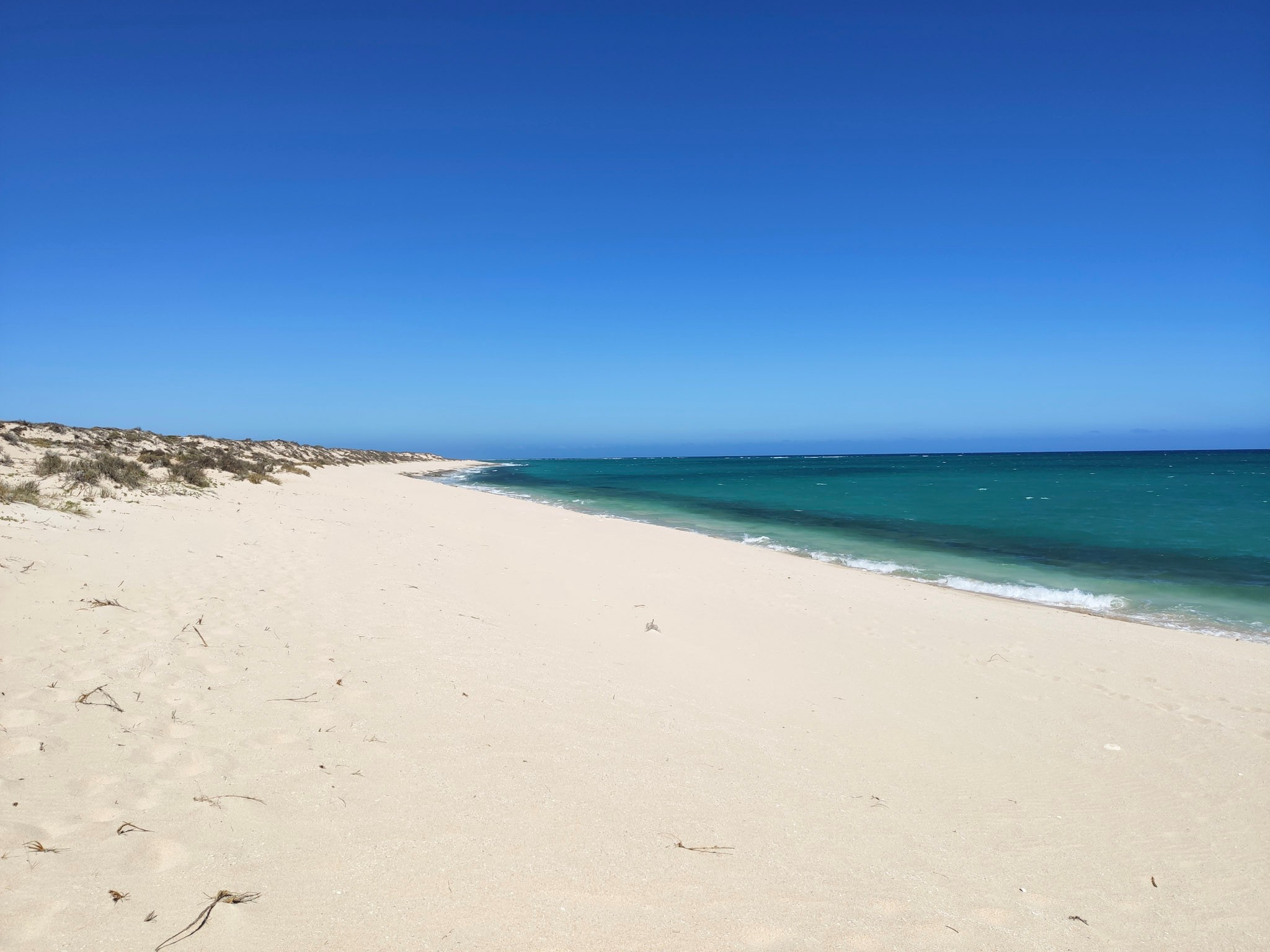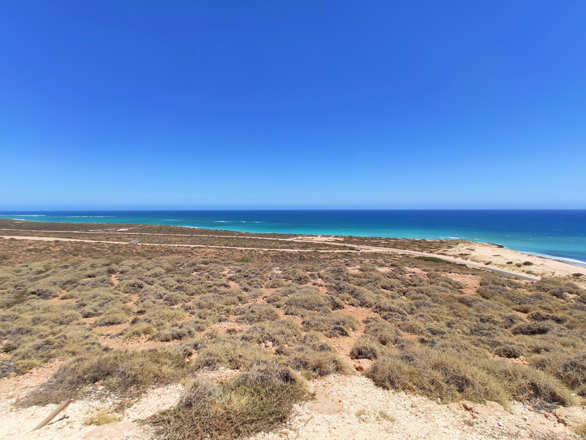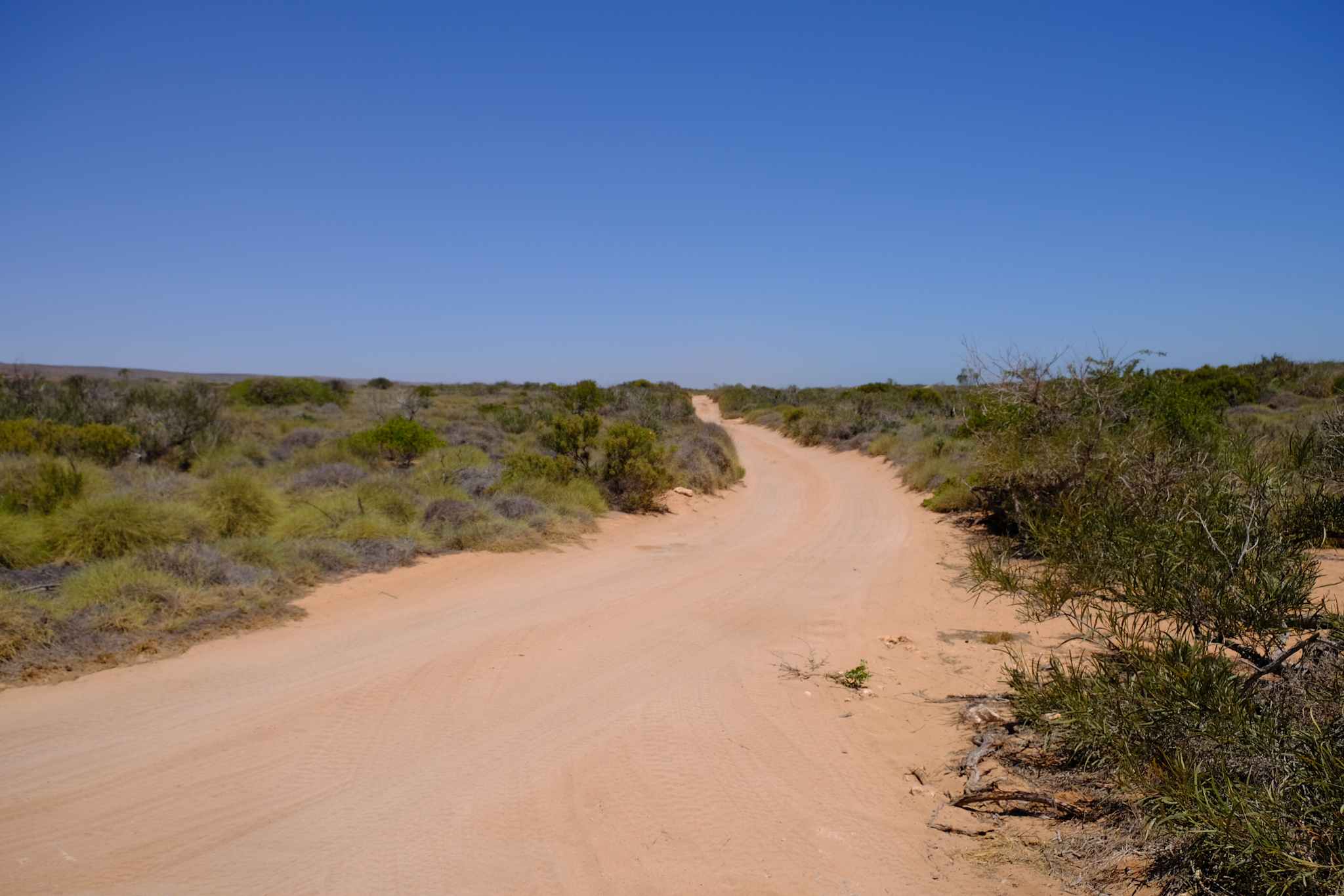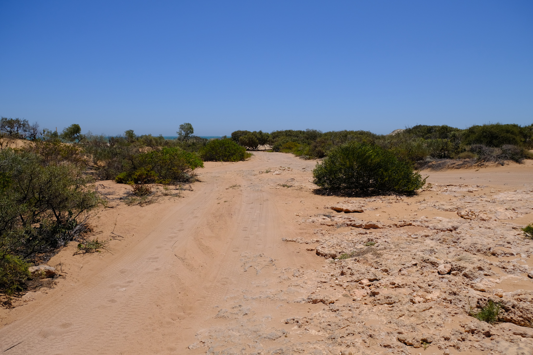 Den Creek Übergang zum Track nach Ningaloo Station (58km) und dann nach Coral Bay (50km) habe ich nach der Yardie Tour inspiziert: Er besteht über etwa 50m aus sehr tiefem Sand. Das wäre wohl mit viel Luft raus lassen (und neuen Vorderreifen) machbar. Die Single Track Road nach Ningaloo Station ist dann nicht mehr so anspruchsvoll.
