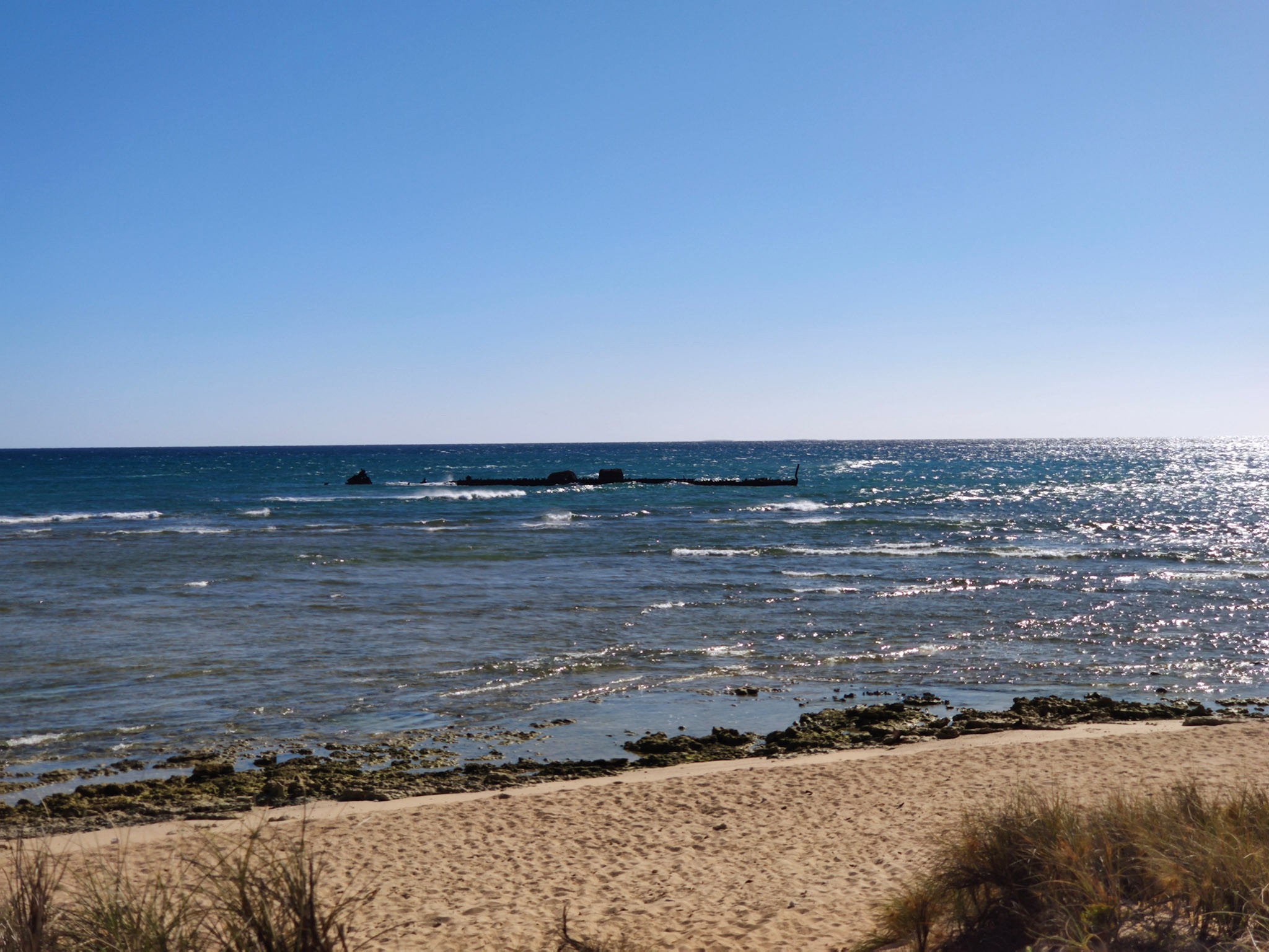 Bei der Anfahrt zum Bootsanleger haben wir das Wrack der 1907 gesunkenen Mildura angeschaut, bei der Rückfahrt die Aussicht vom Leuchtturm genossen. Auf einem Bild sieht man auch die hohen VLF Antennen (höher als die Wolkenkratzer in New York). Auf den sehr tiefen Frequenzen (VLF: Very Low Frequency) kommuniziert man mit U-Booten.