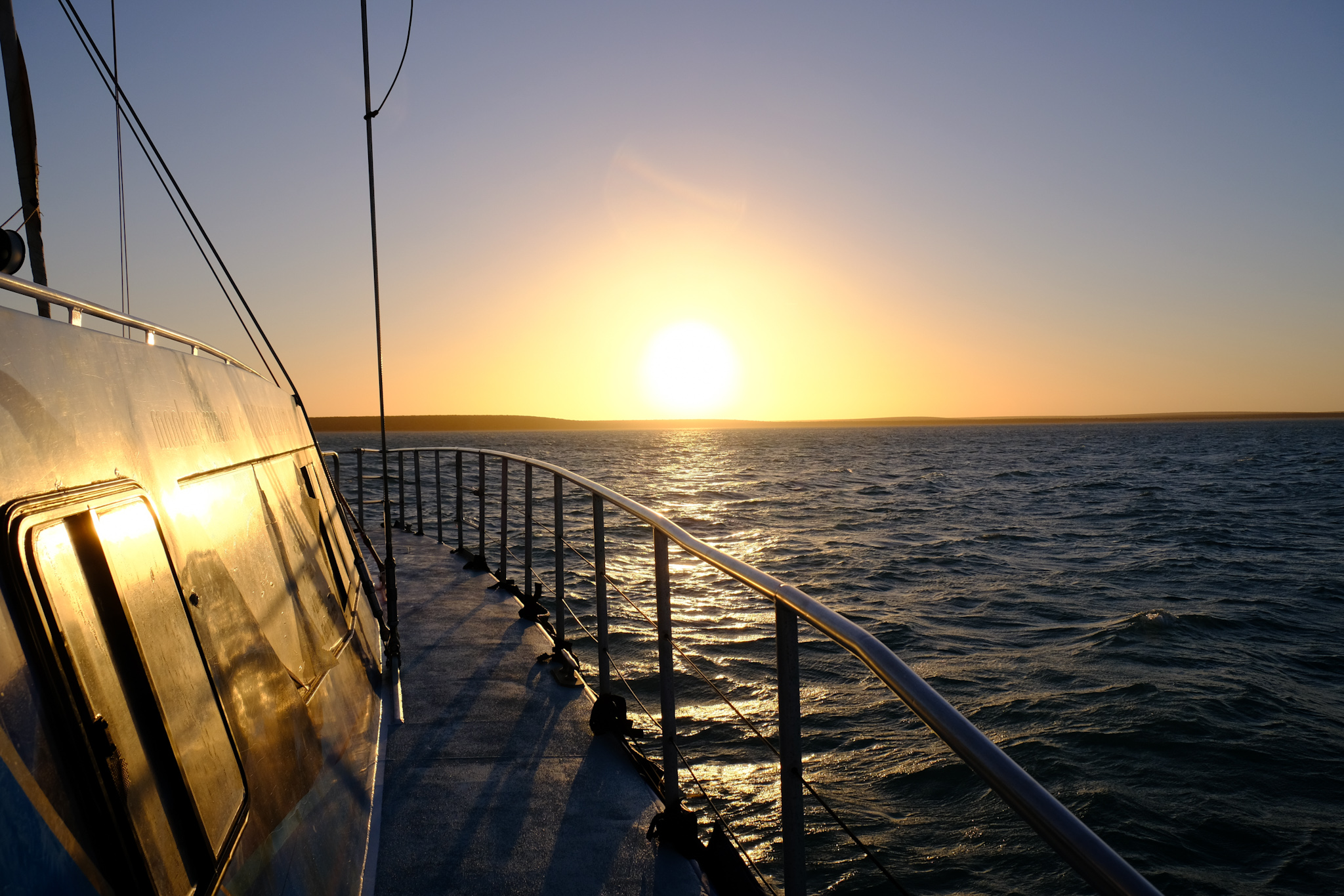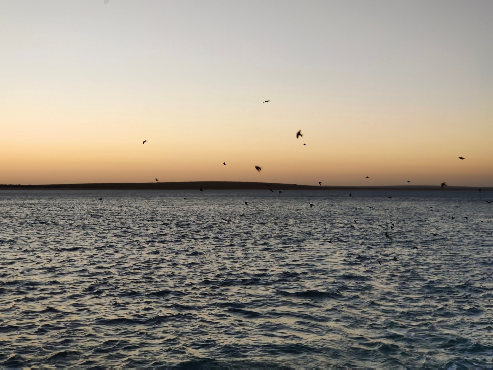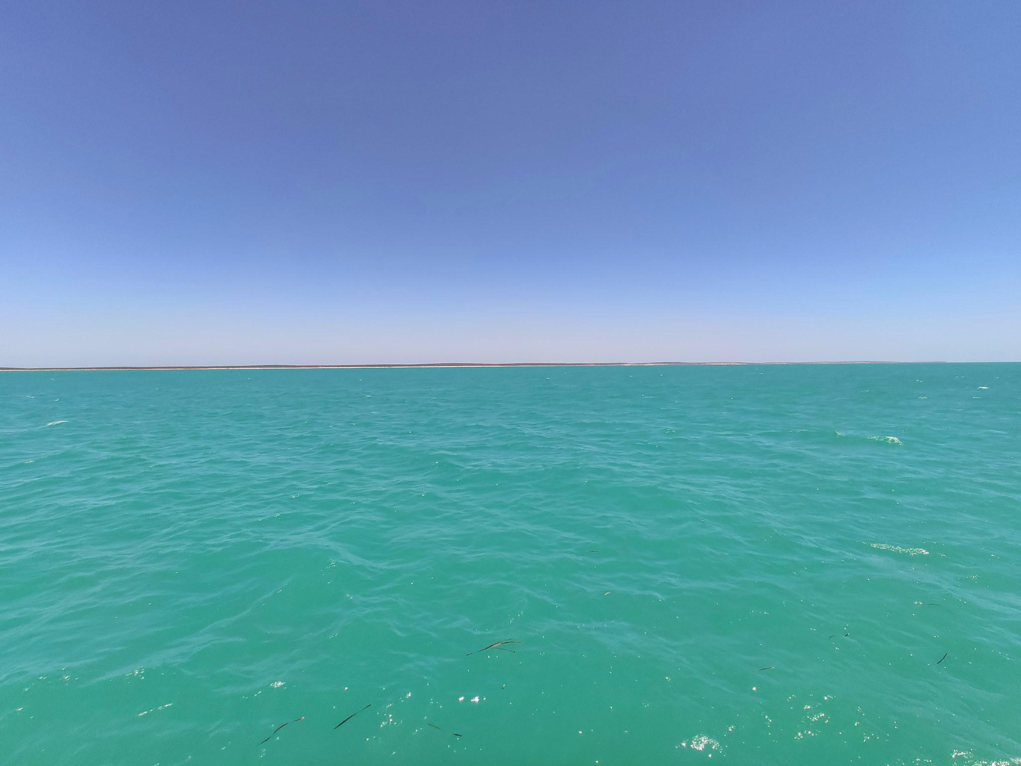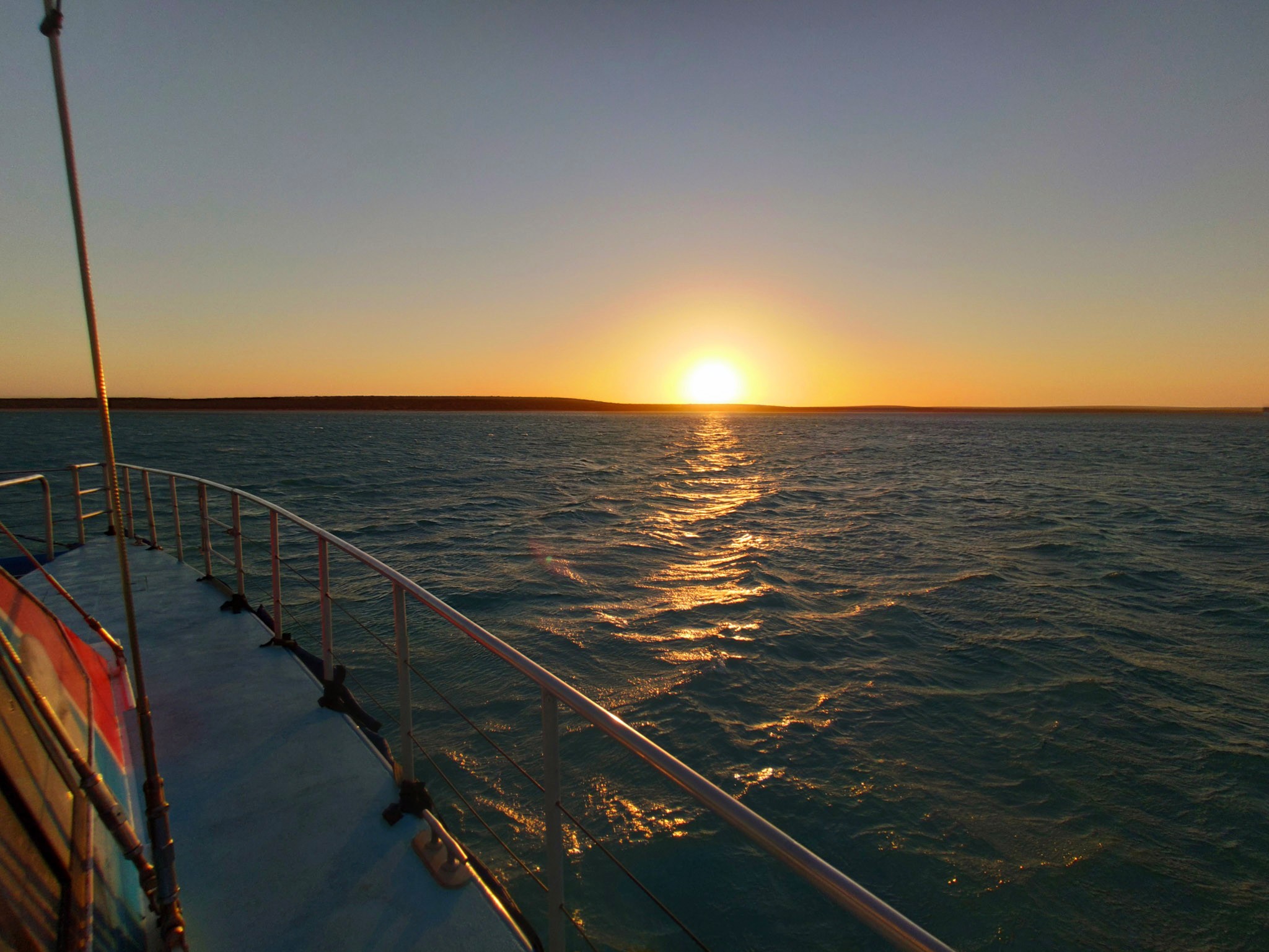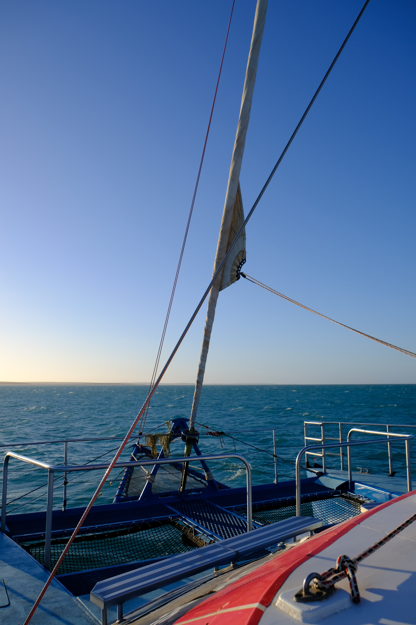 Also habe ich heute Morgen nach der Begegnung mit den Delfinen für 10 Uhr die dreistündige Katamaran-Tour ab dem Pier von Monkey Mia gebucht. Das Schiff ist das einzige mit der Lizenz zum Befahren des Meeresparks. Das zweite Schiff, welches täglich Katamaran-Touren anbietet, darf das nicht.