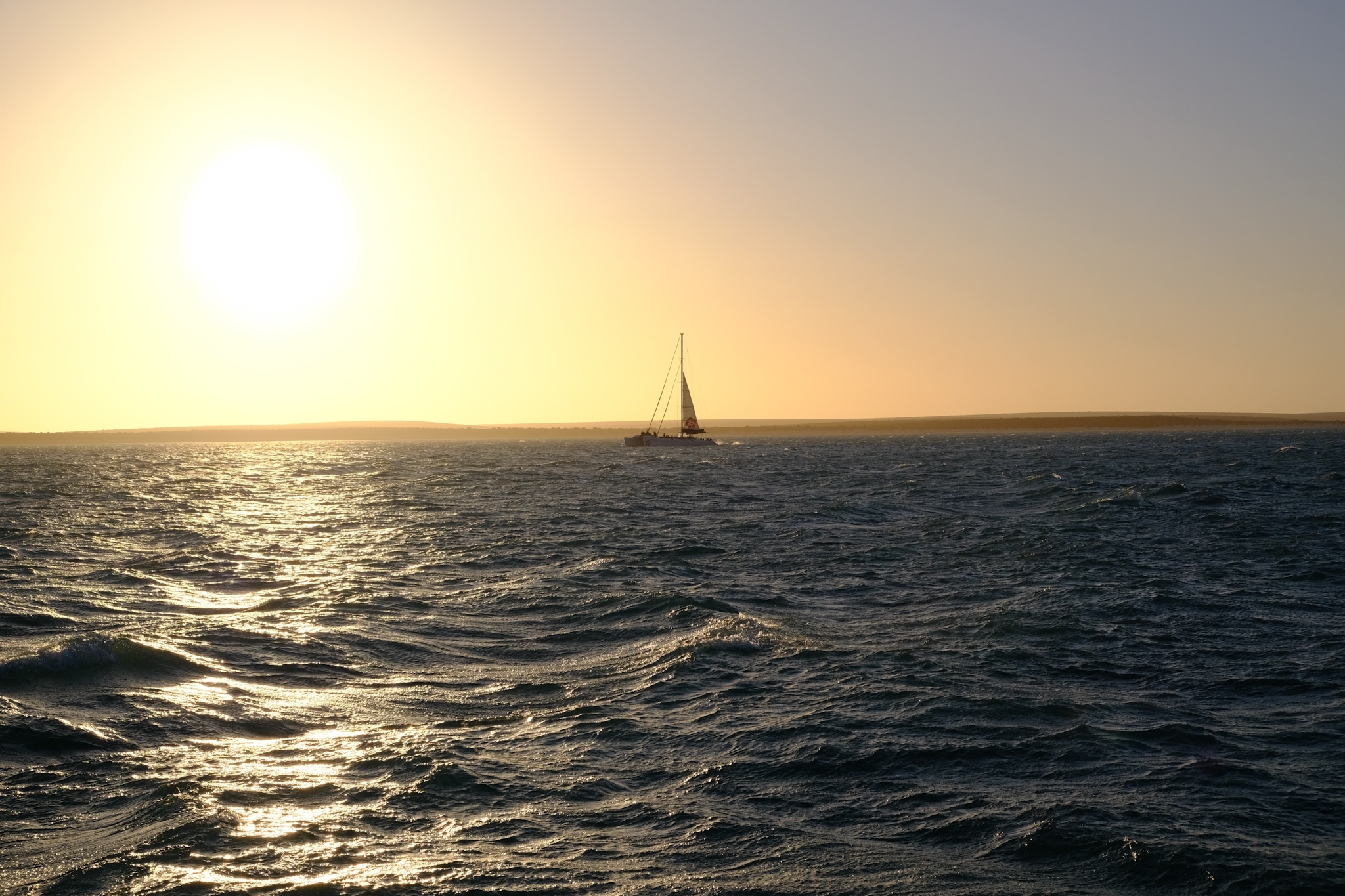 Zum Ausflugspaket gehört auch die Sunset-Cruise. Wir liefen um 17 Uhr bei sehr starkem Wind aus und genossen bei ein paar Bier und dem heftigen Wind die untergehenden Sonne. Da es so stark windete, war es leider keine reine Segeltour, sondern der Motor musste etwas mithelfen. Das Schiff darf bis 35 Knoten segeln, der Wind war wohl mindestens 40km/h, also noch weit darunter…