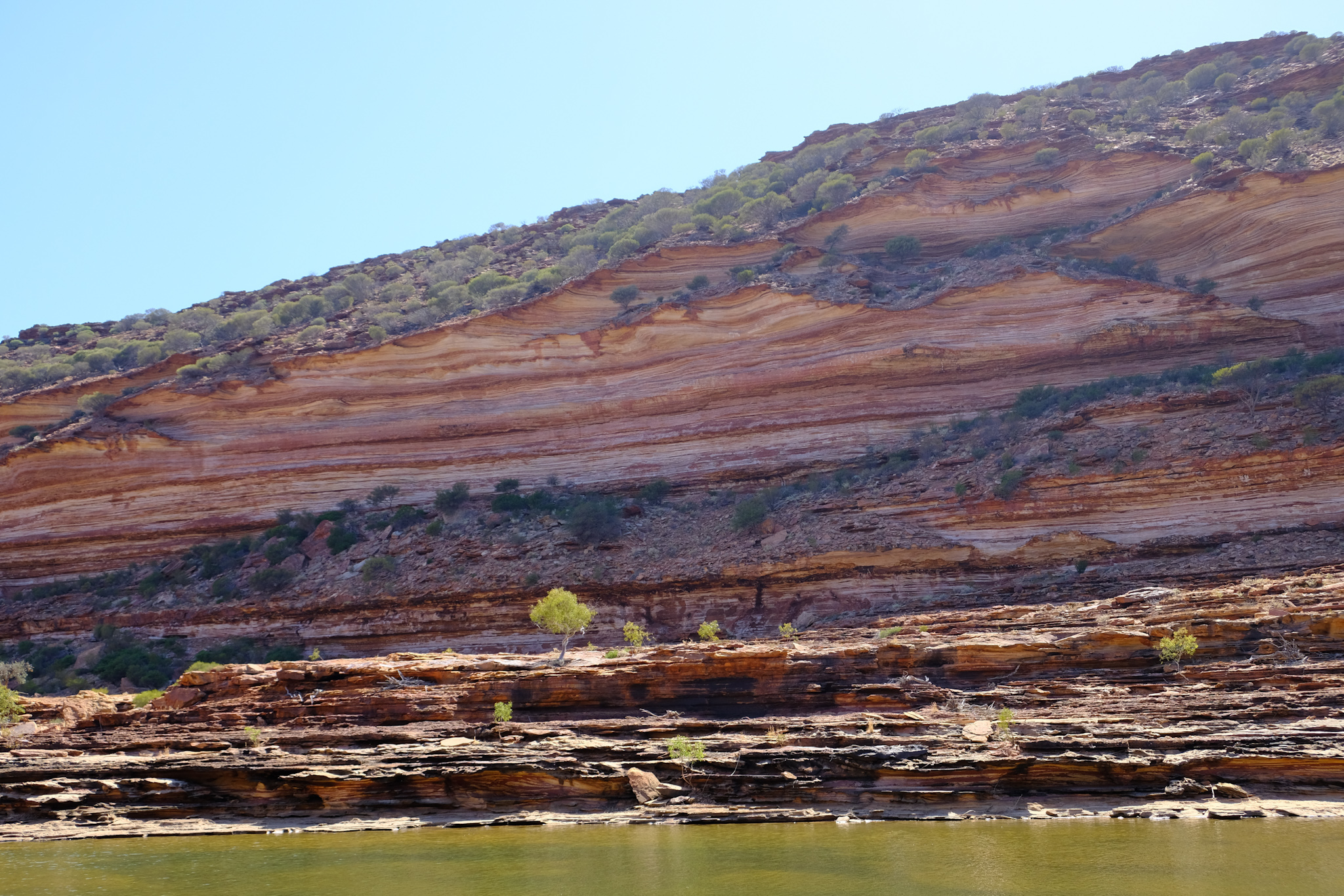 Die spektakuläre Landschaft des Kalbarri-Nationalparks ist das Ergebnis von vielen Millionen von Jahren geologischen Erosion. Die Geologie dieser Landschaft besteht aus tiefen, horizontalen Bändern aus mehrfarbigem Sand, welche vor 400 Millionen Jahren in Schichten abgelagert wurden. Das resultierende Sedimentgestein wird Tumblagooda-Sandstein genannt. Der Murchison River hat sich seinen Weg zum Meer durch diese Formationen gebahnt und mit seiner Strömung den Sandstein durchschnitten. Dadurch sind herrlich rot-weiss gestreifte Schluchten entstanden. Diese Schluchten schlängeln sich 80km durch den 186’000ha grossen Park.