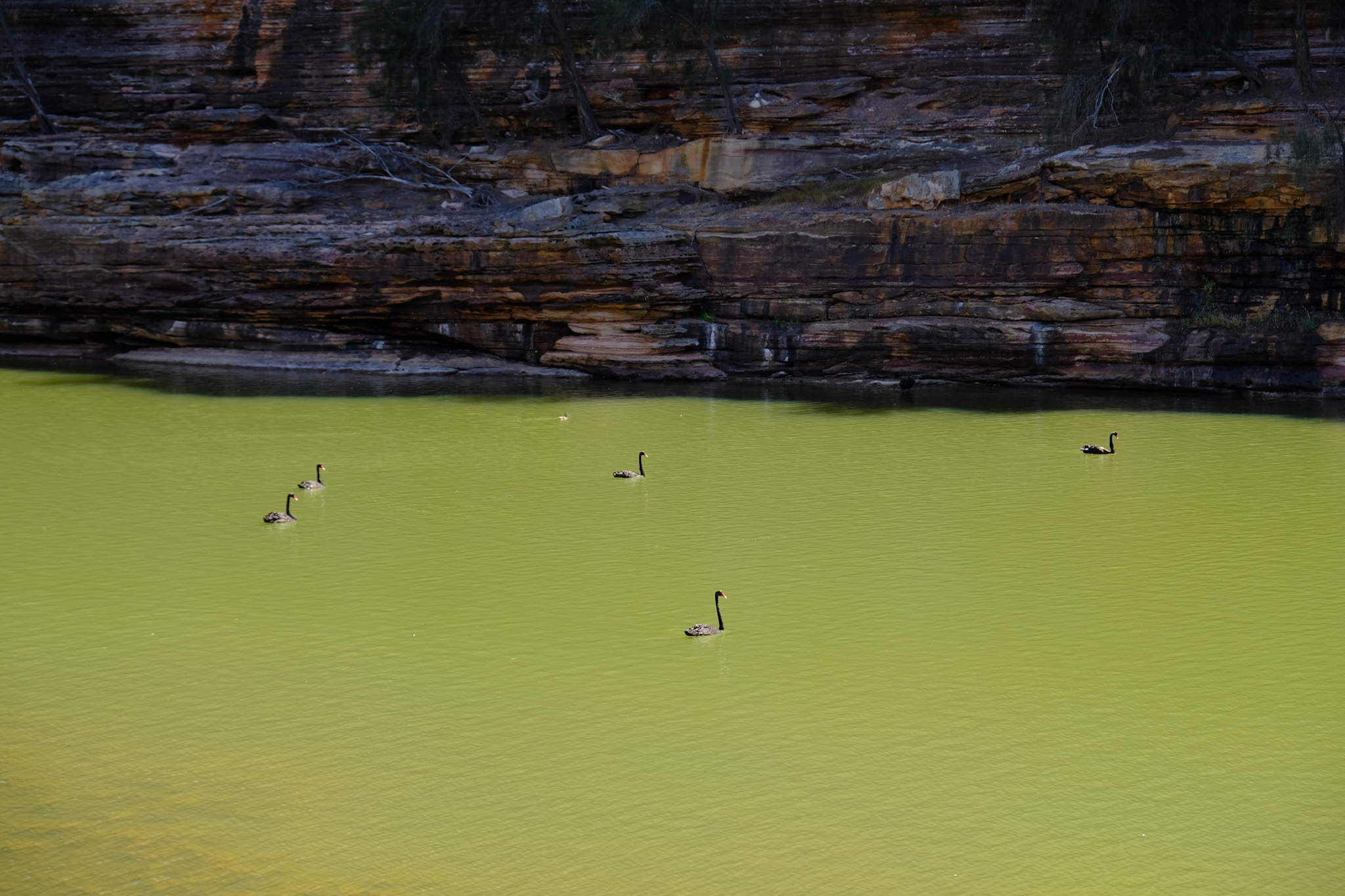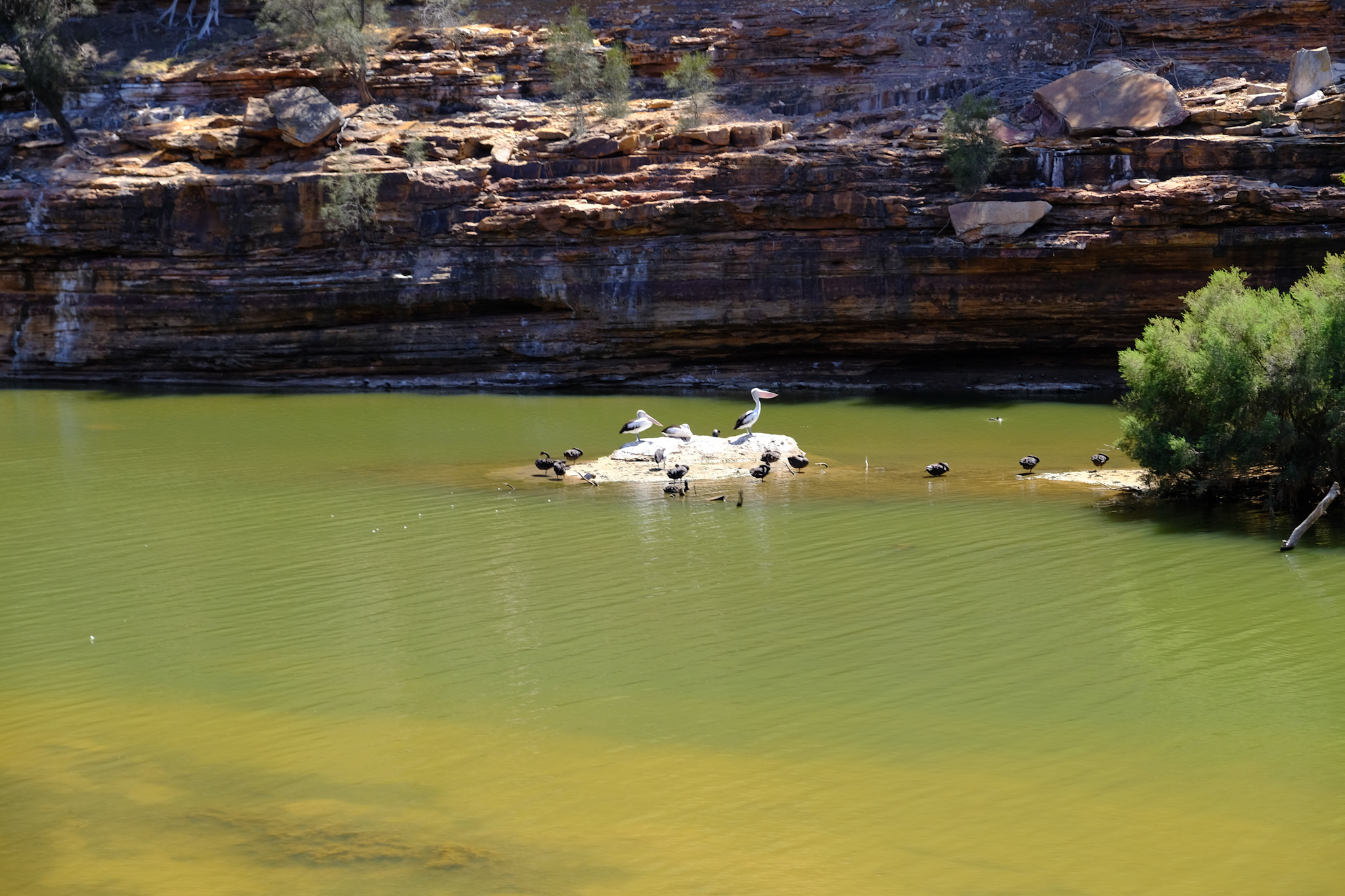 Nach dem felsigen Teilstück kommt dann eine sandige Strecke, welche durch Bäume und Büsche gesäumt wird. Im recht breiten Fluss sind zwei Inseln, und auf einer kleinen Insel sitzen tatsächlich mehrere Pelikane. Enten, Schlangenhalsreiher und schwarze Schwäne schwimmen im Fluss. Das ist schon fast ein surreales Bild, hier Pelikane (etwa 30km von der Küste entfernt) und schwarze Schwäne anzutreffen.