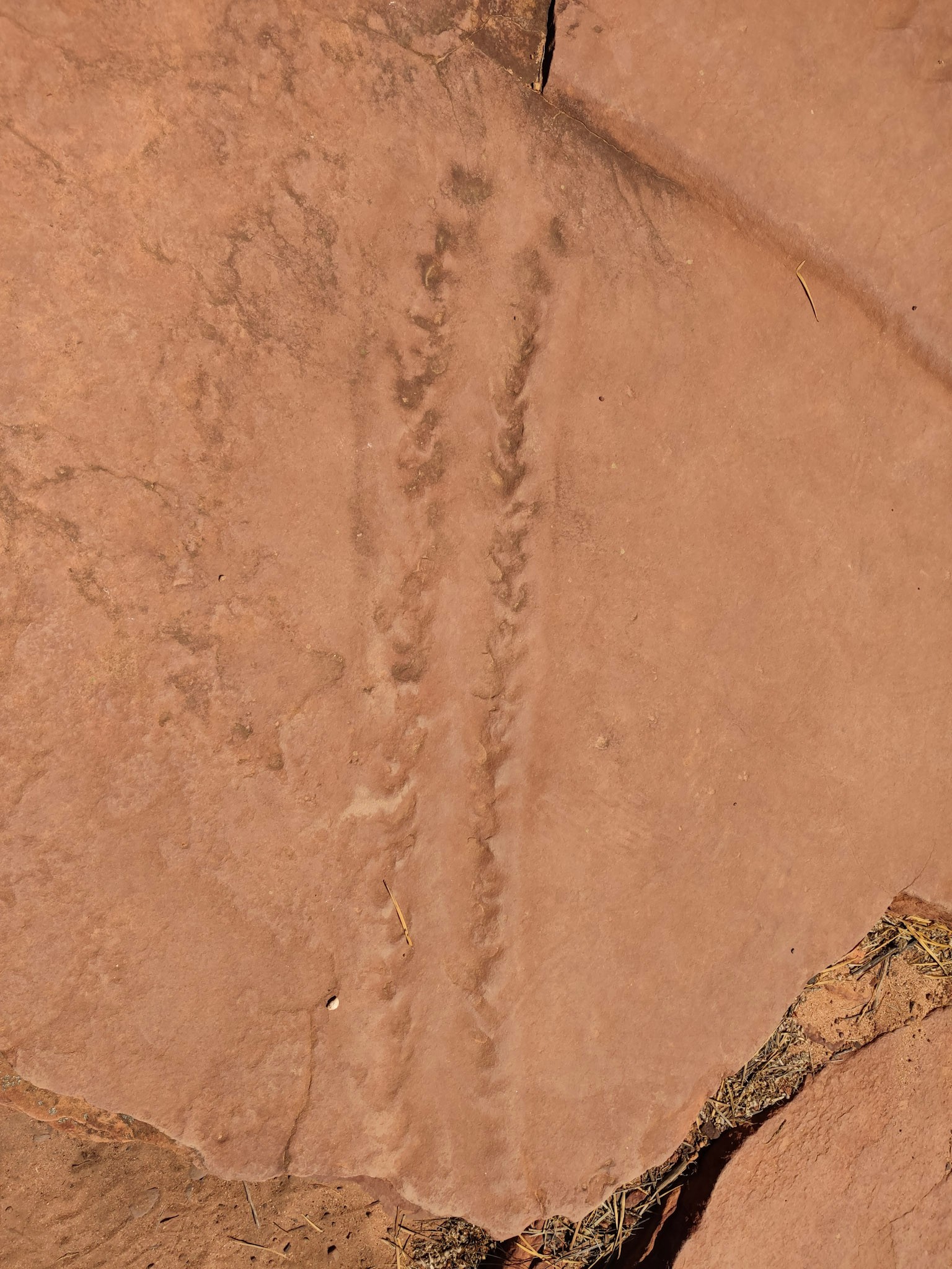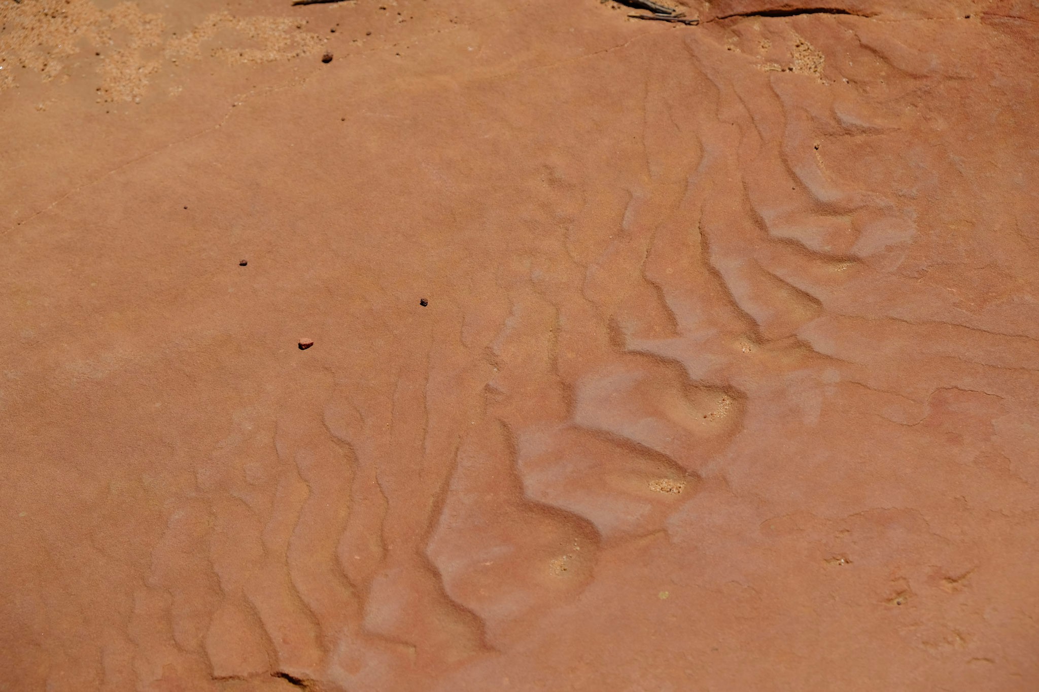 In den Schichten des Sandsteins sieht man auch hier noch Versteigerungen von Spuren urzeitlicher Tiere sowie der Wellen, wie man sie im Watt findet.