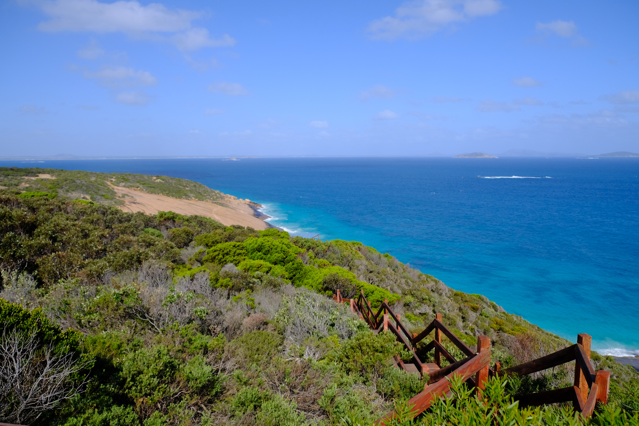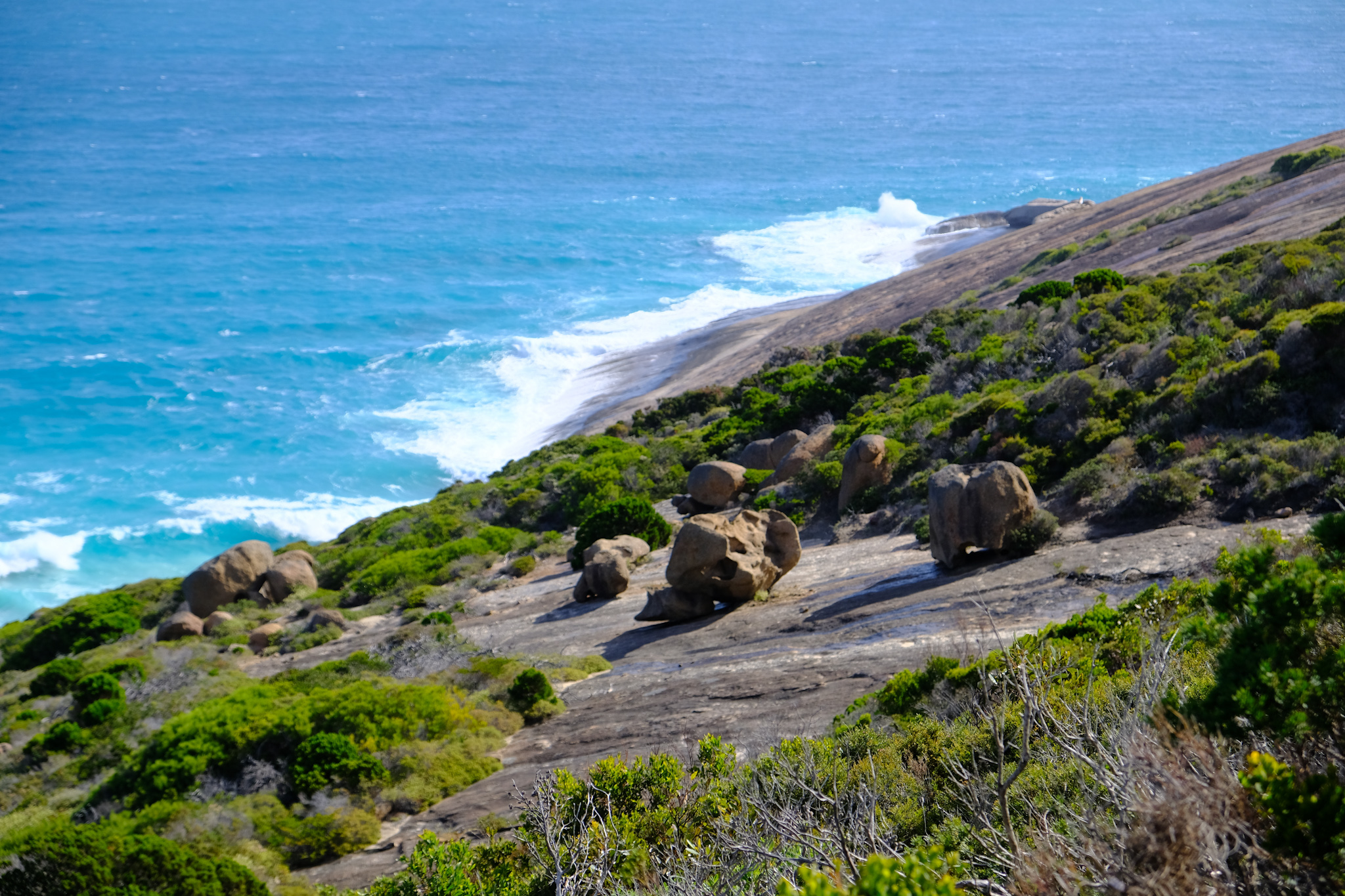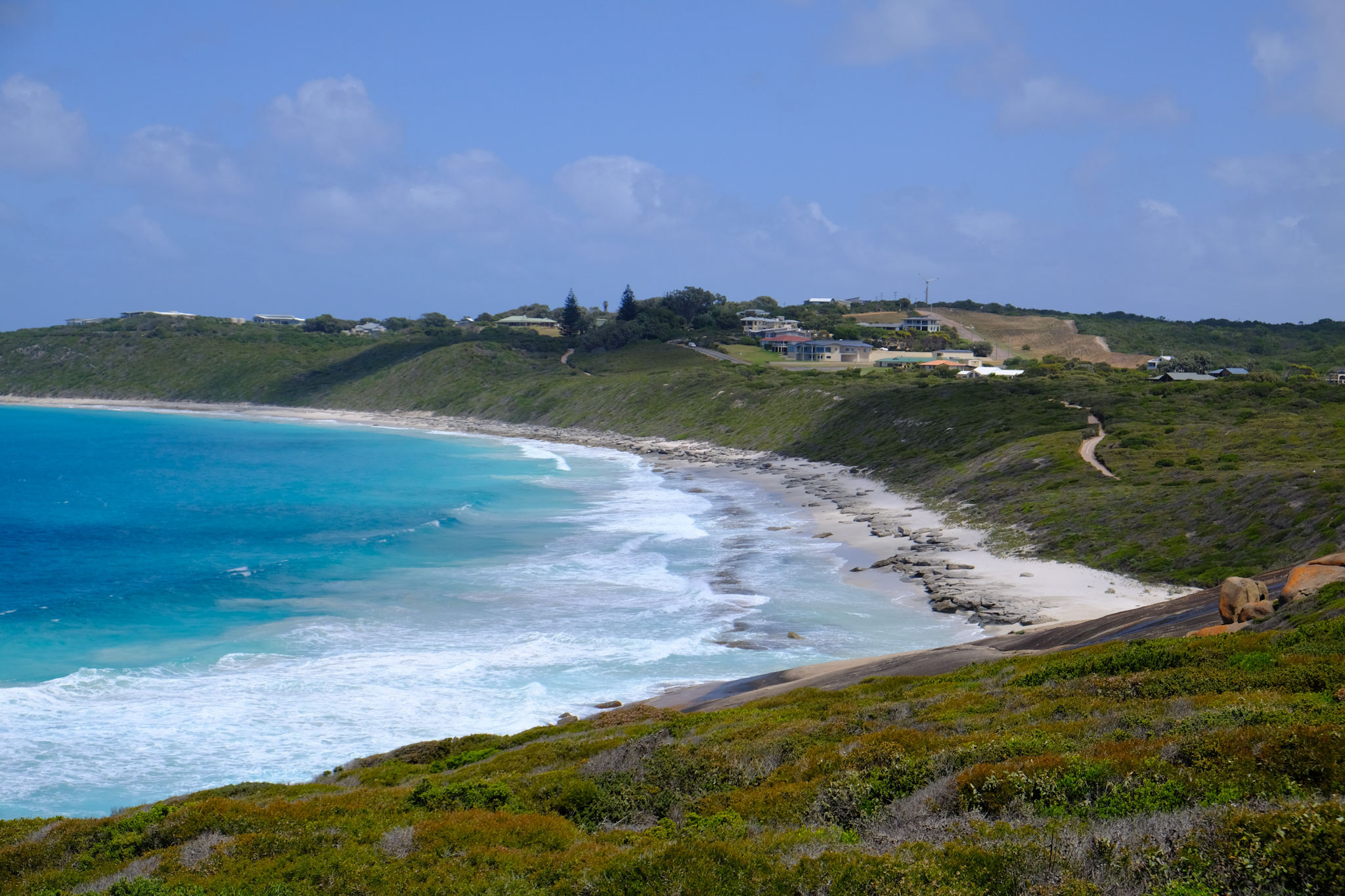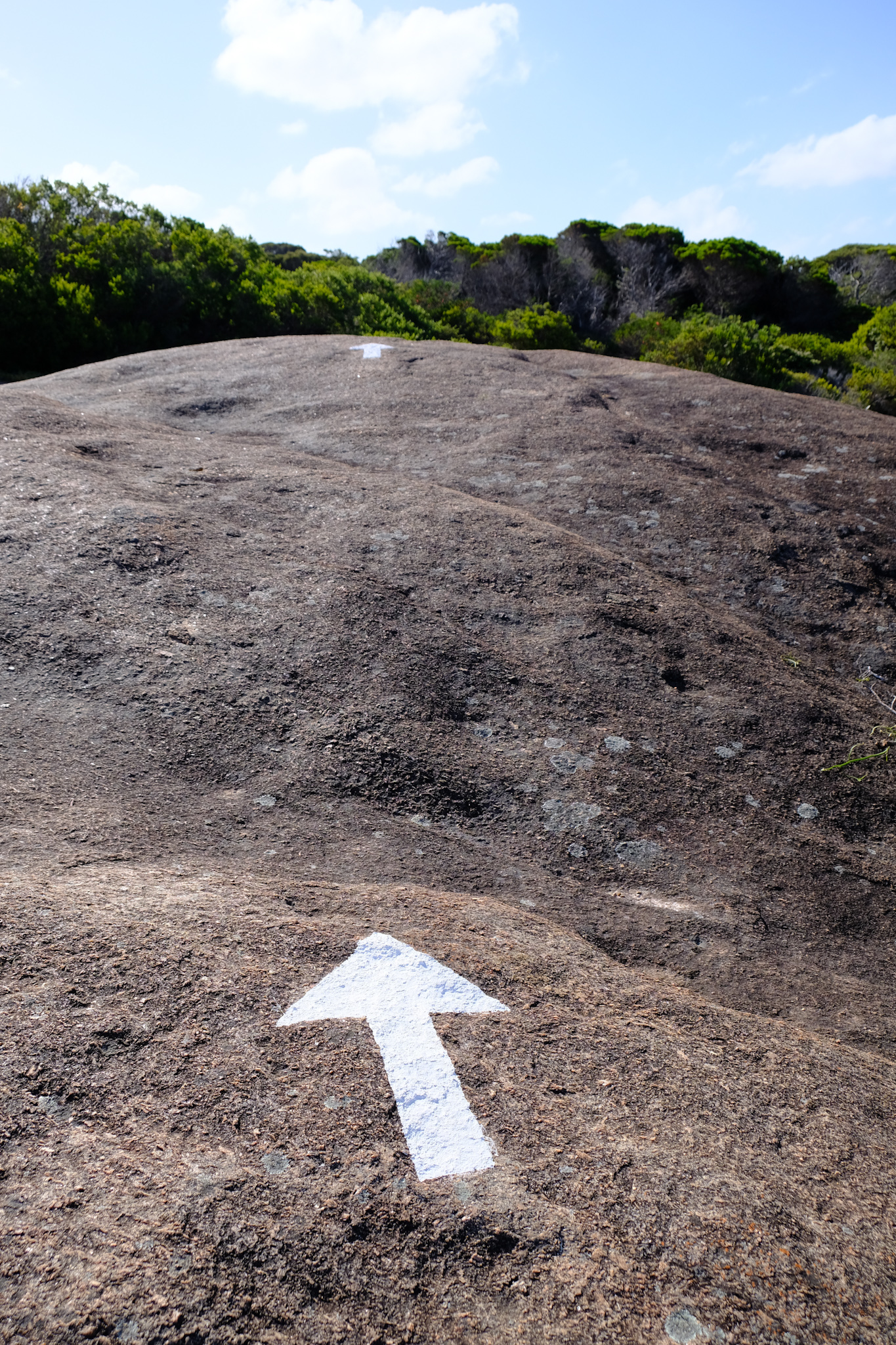Auf der Rückfahrt nach Esperance habe ich beim Rotary Lookout kurz vor dem Ort noch einen Halt gemacht. Der erhöhte Lookout ist zwar gut gemacht, aber die Aussicht wegen den Bäumen und zwei hohen Antennen neben dem Lookout nicht überragend. Dafür beginnt und endet hier der Rotary Loop Walk Trial. Der geht auf Treppen, Bohlenwegen und auf dem nackten Granitfelsen rund um den Hügel (respektive Felsen). Dicke, weisse Pfeile weisen den Weg auf der Granitoberfläche. Vom Weg aus hat man eine fantastische Aussicht auf die attraktive Umgebung, aber auch der abwechslungsreiche Weg selbst macht richtig Spass. Das ist ein etwas verstecktes Highlight, welches man besuchen sollte.