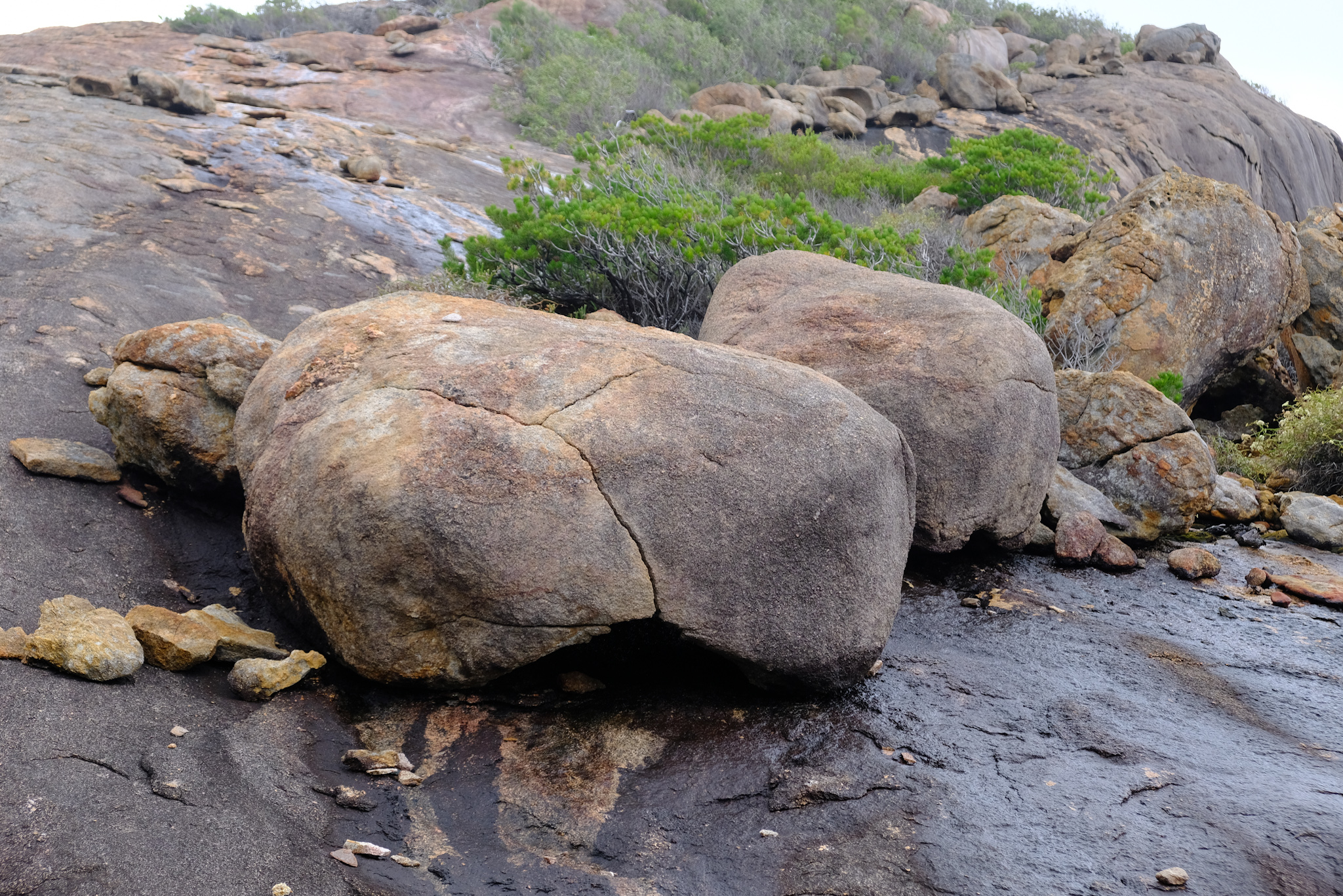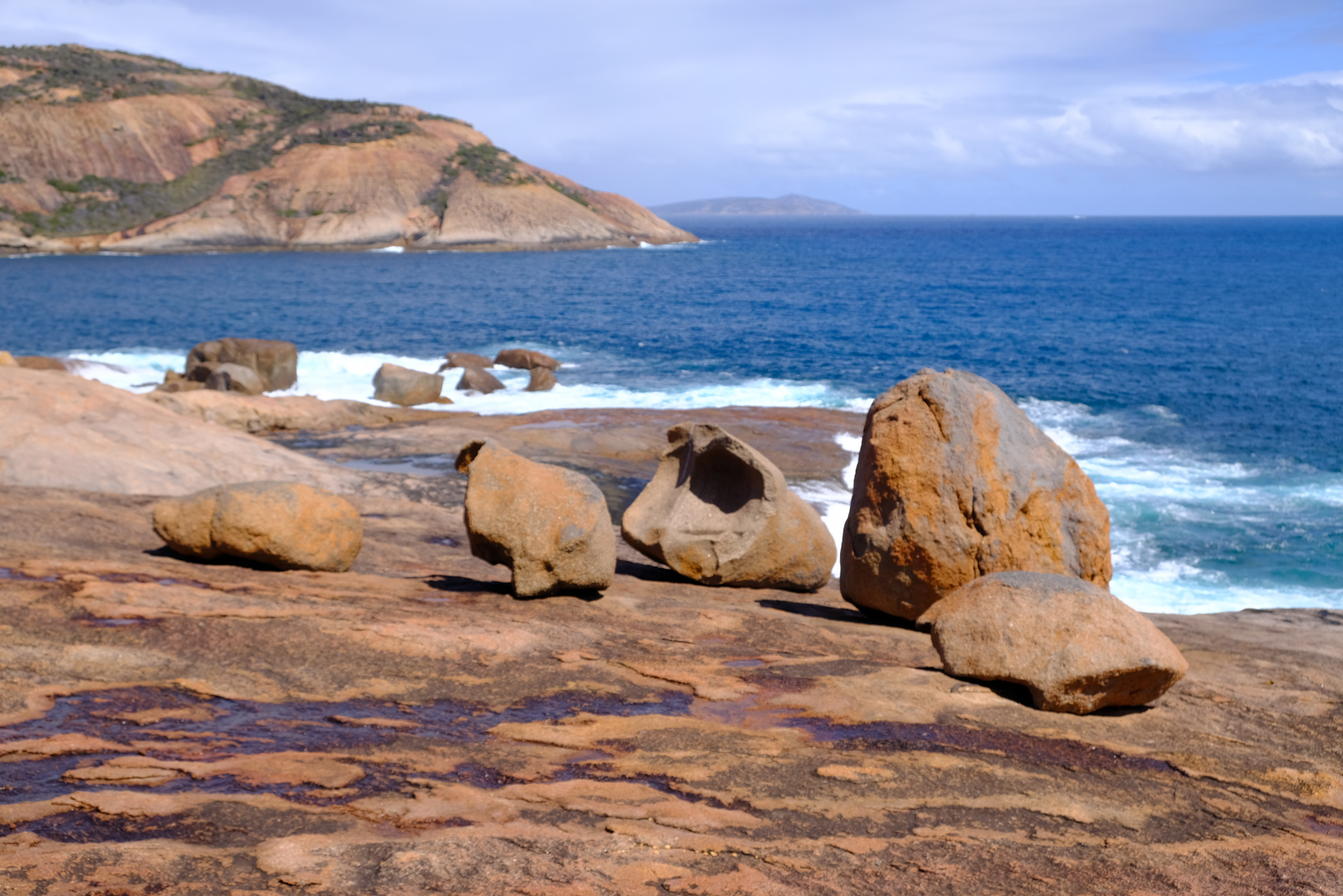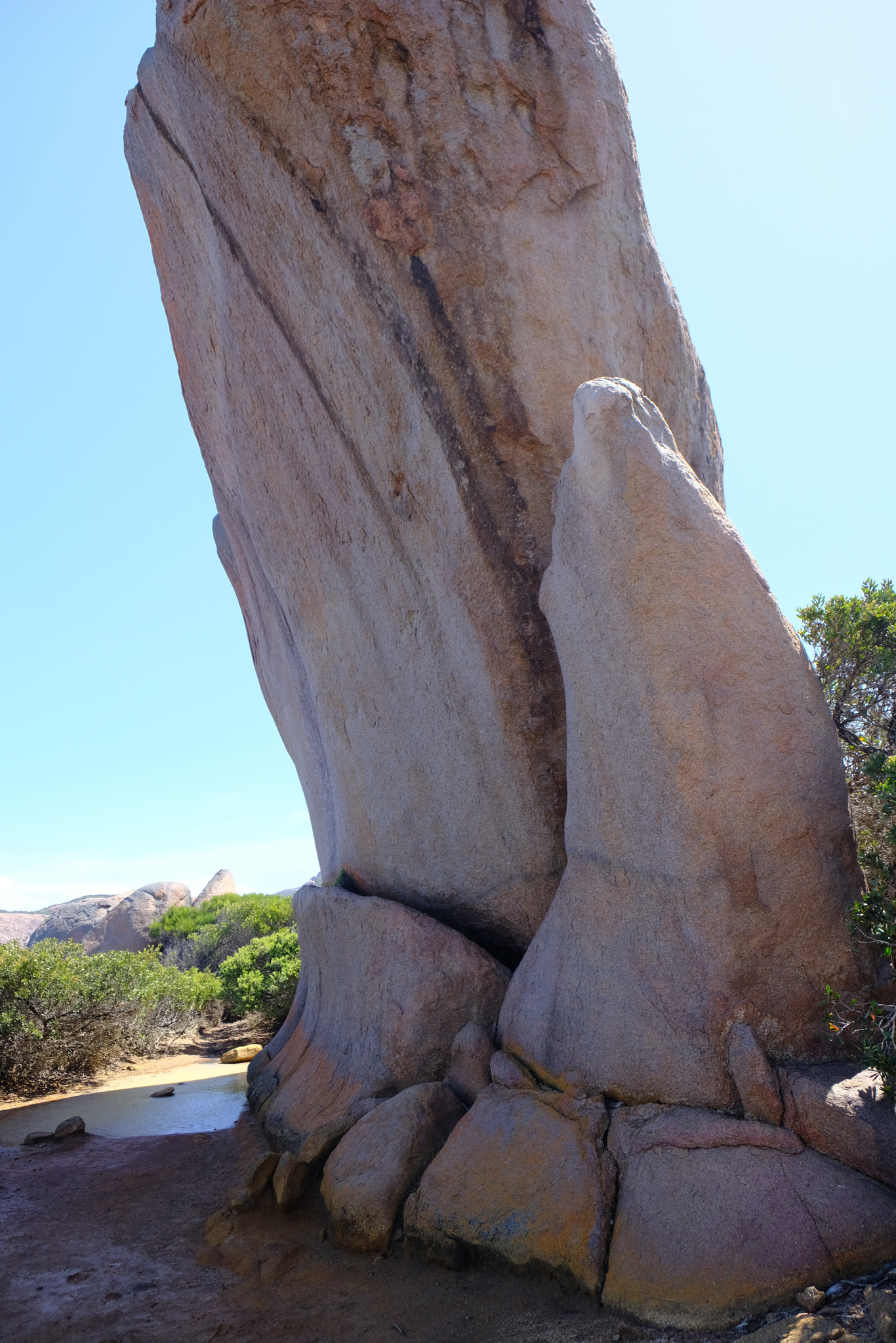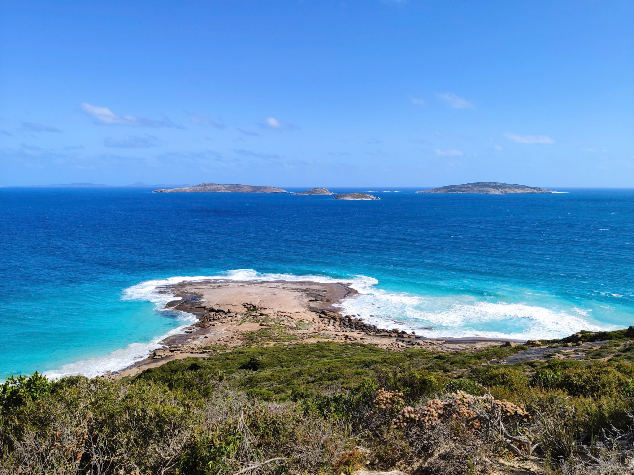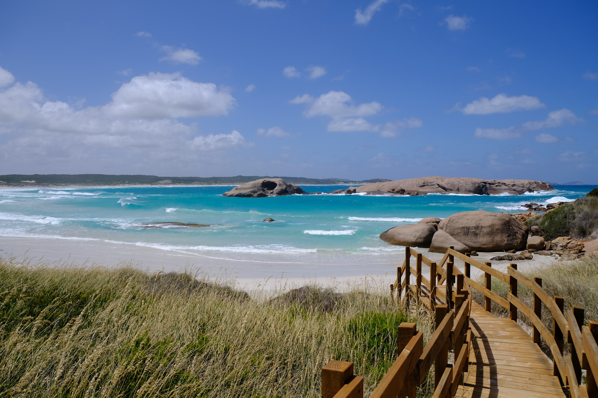 Auf der Rückfahrt nach Esperance habe ich beim Rotary Lookout kurz vor dem Ort noch einen Halt gemacht. Der erhöhte Lookout ist zwar gut gemacht, aber die Aussicht wegen den Bäumen und zwei hohen Antennen neben dem Lookout nicht überragend. Dafür beginnt und endet hier der Rotary Loop Walk Trial. Der geht auf Treppen, Bohlenwegen und auf dem nackten Granitfelsen rund um den Hügel (respektive Felsen). Dicke, weisse Pfeile weisen den Weg auf der Granitoberfläche. Vom Weg aus hat man eine fantastische Aussicht auf die attraktive Umgebung, aber auch der abwechslungsreiche Weg selbst macht richtig Spass. Das ist ein etwas verstecktes Highlight, welches man besuchen sollte.