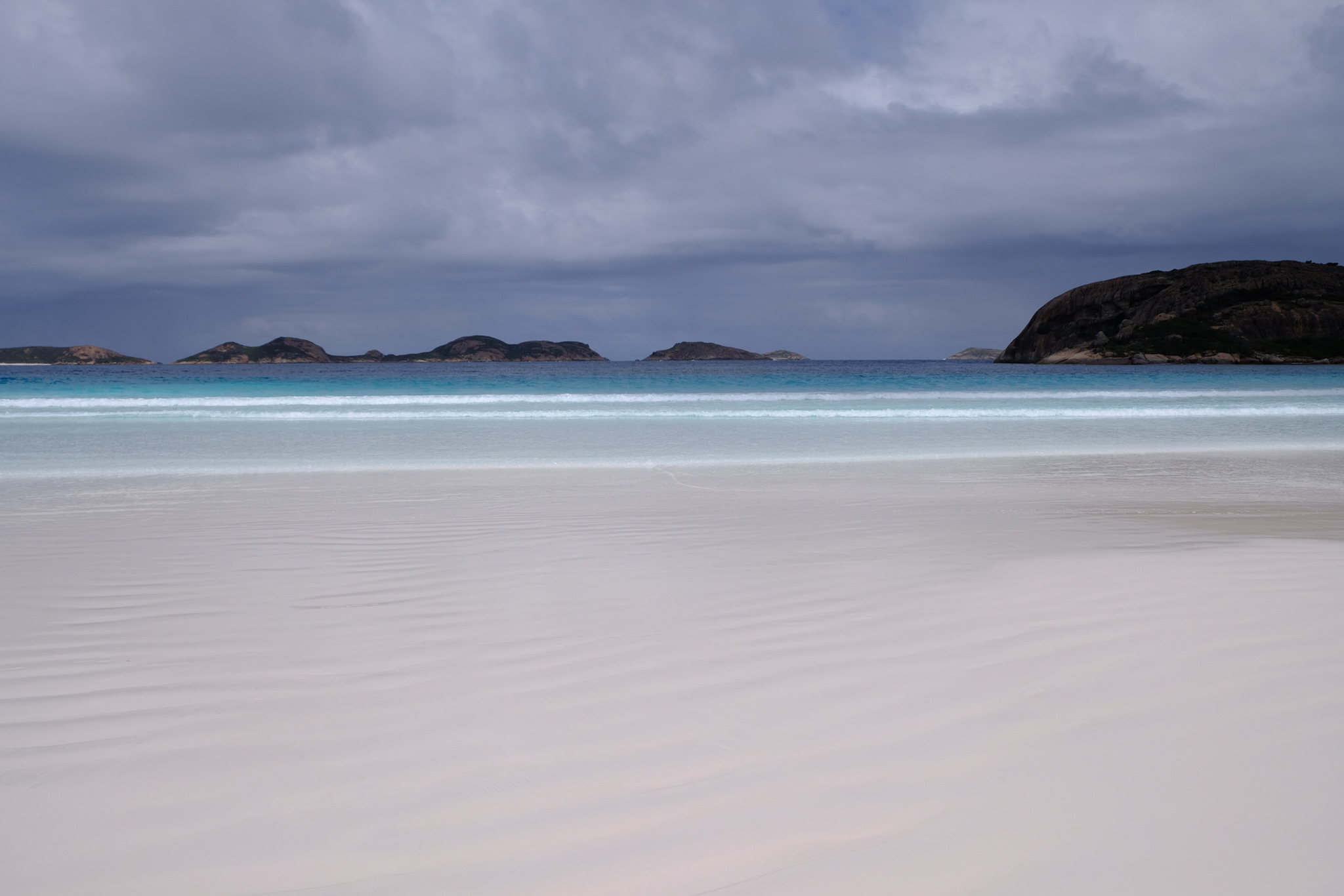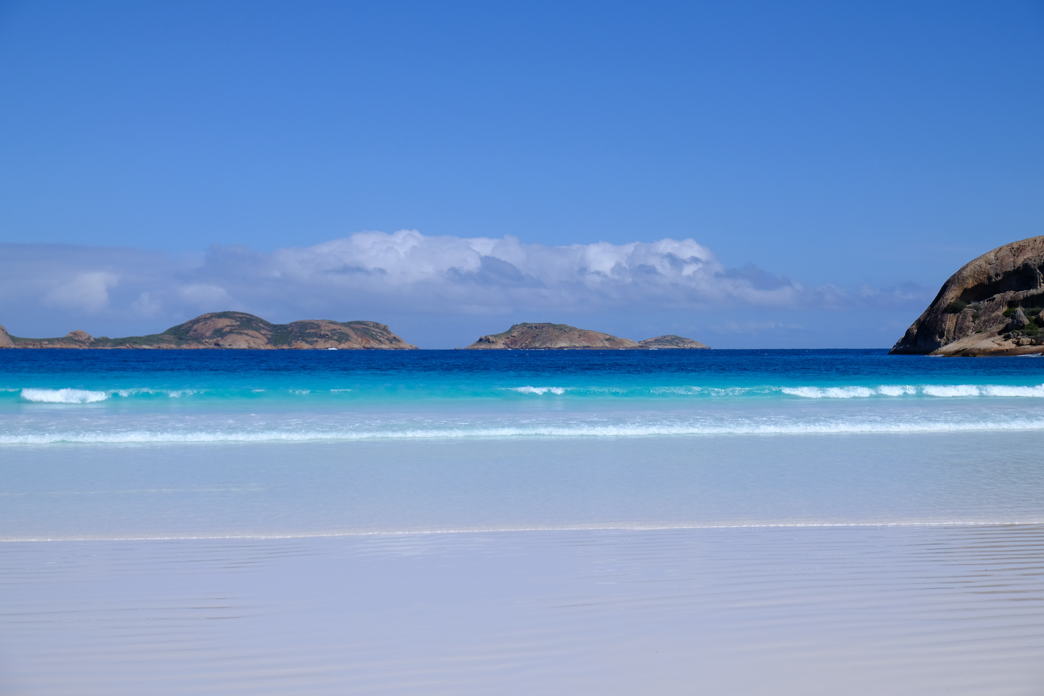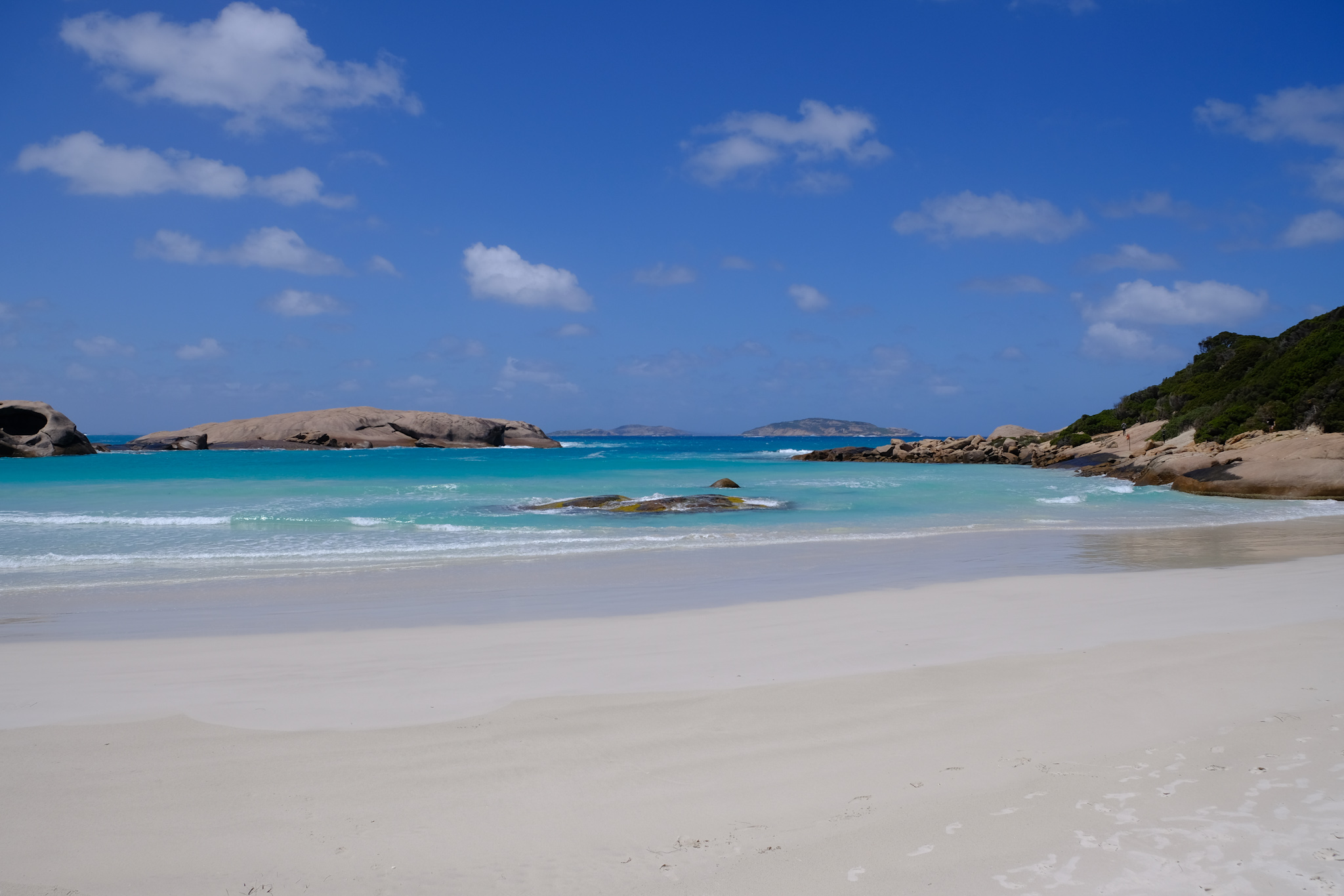 Der Sand ist an allen Stränden äusserst fein, weiss und vielfach sanft abfallend. Die Strände sind vielfach auch romantisch von Granitblöcken gesäumt. Den Horizont säumen die Inseln des Recherche Archipelagos.