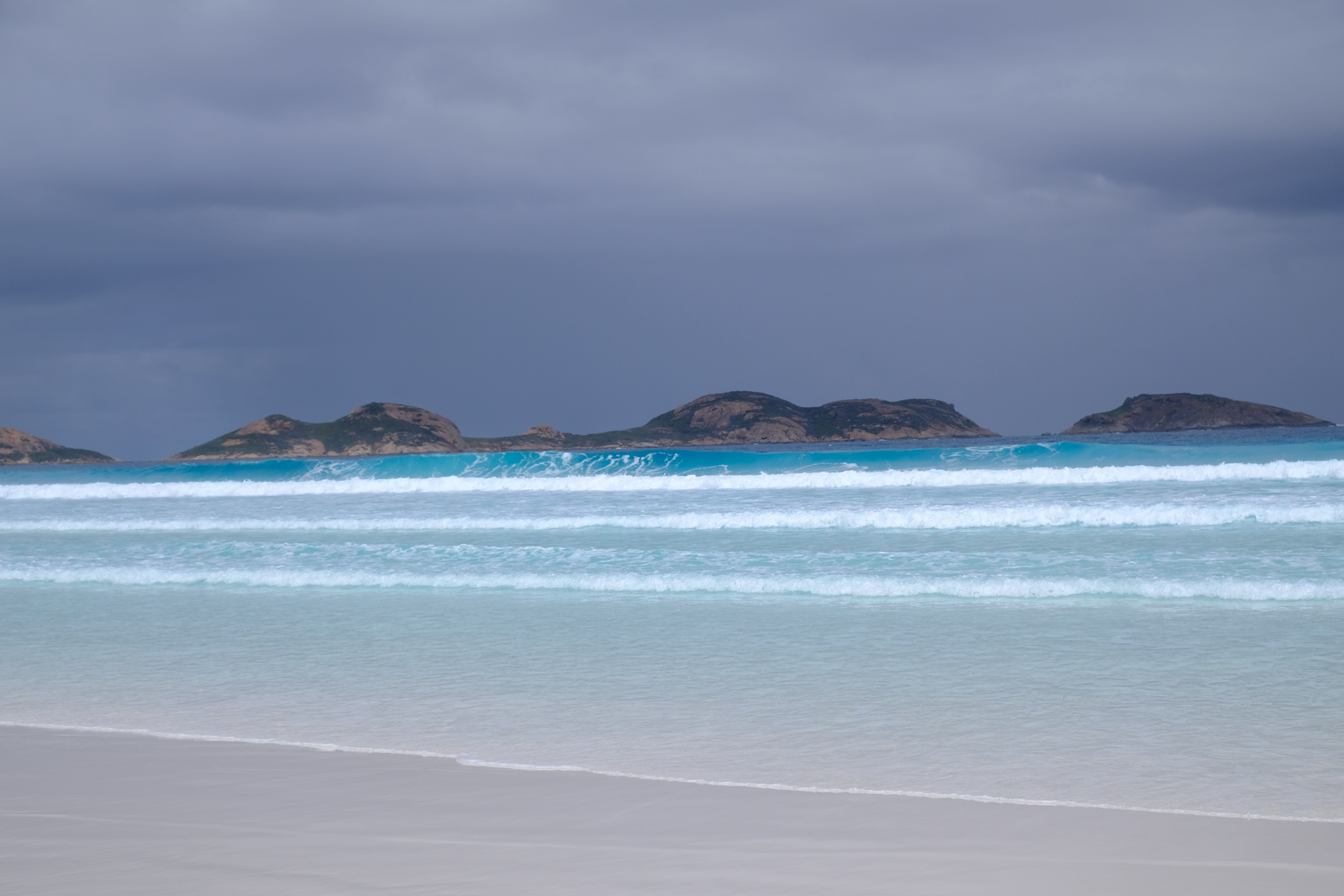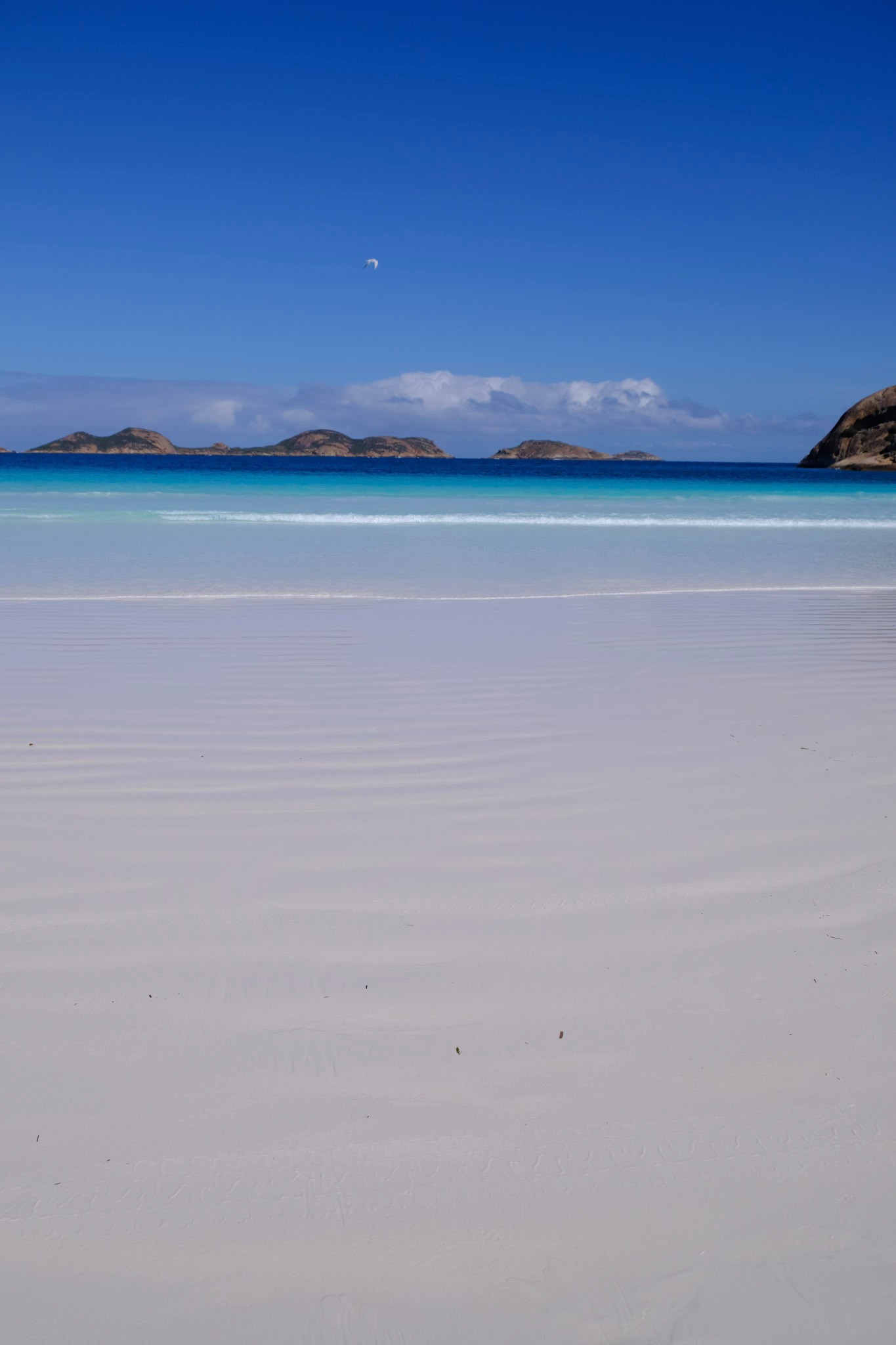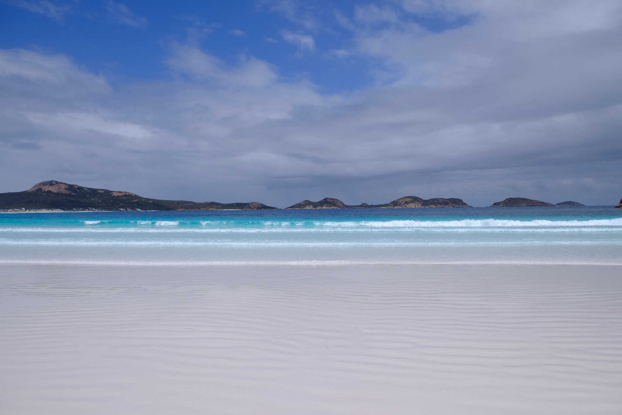 Der Sand ist an allen Stränden äusserst fein, weiss und vielfach sanft abfallend. Die Strände sind vielfach auch romantisch von Granitblöcken gesäumt. Den Horizont säumen die Inseln des Recherche Archipelagos.