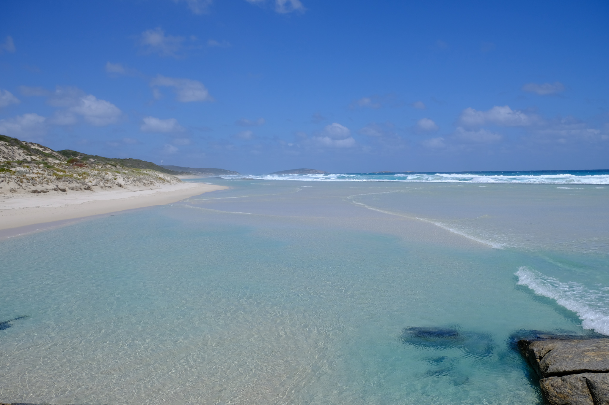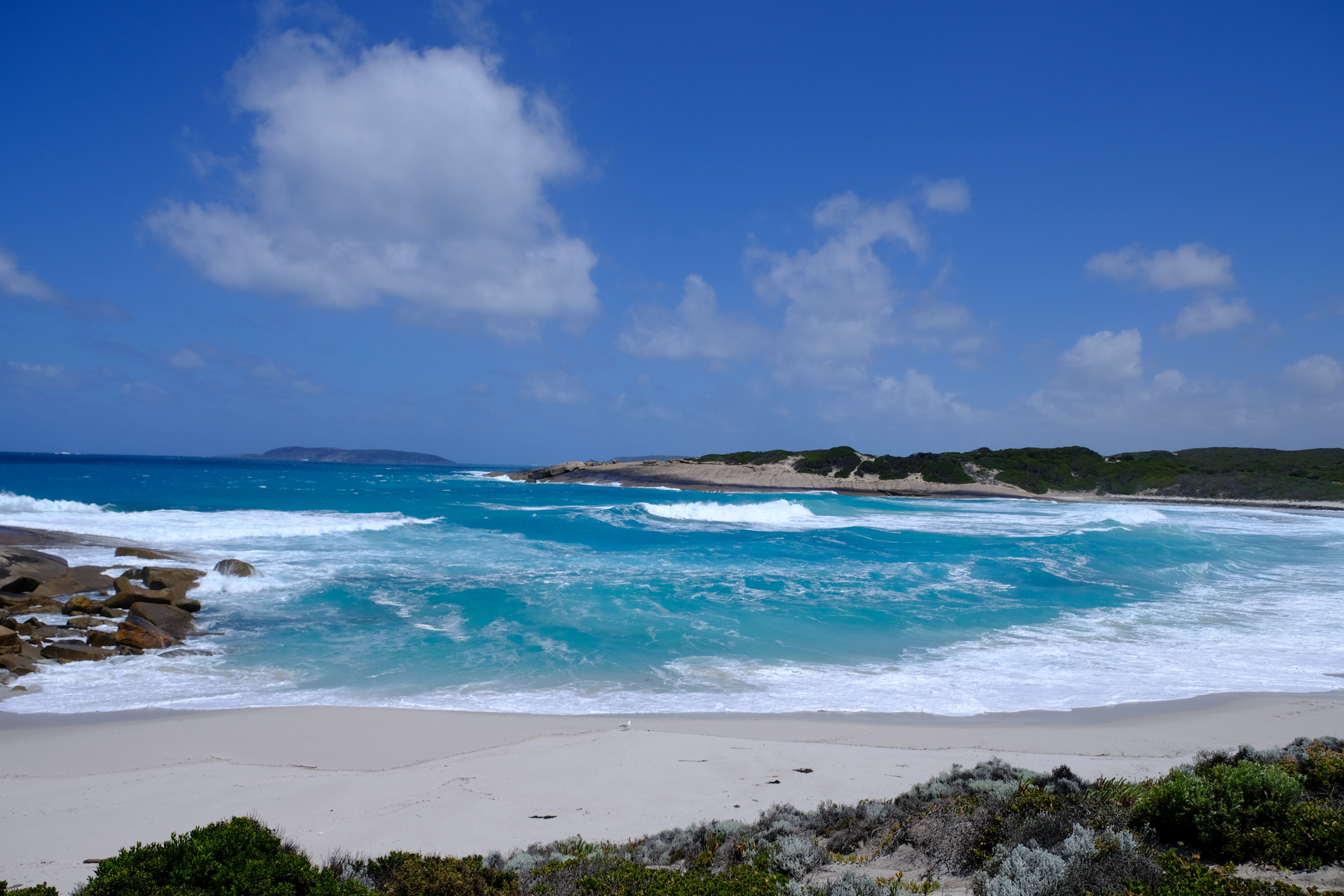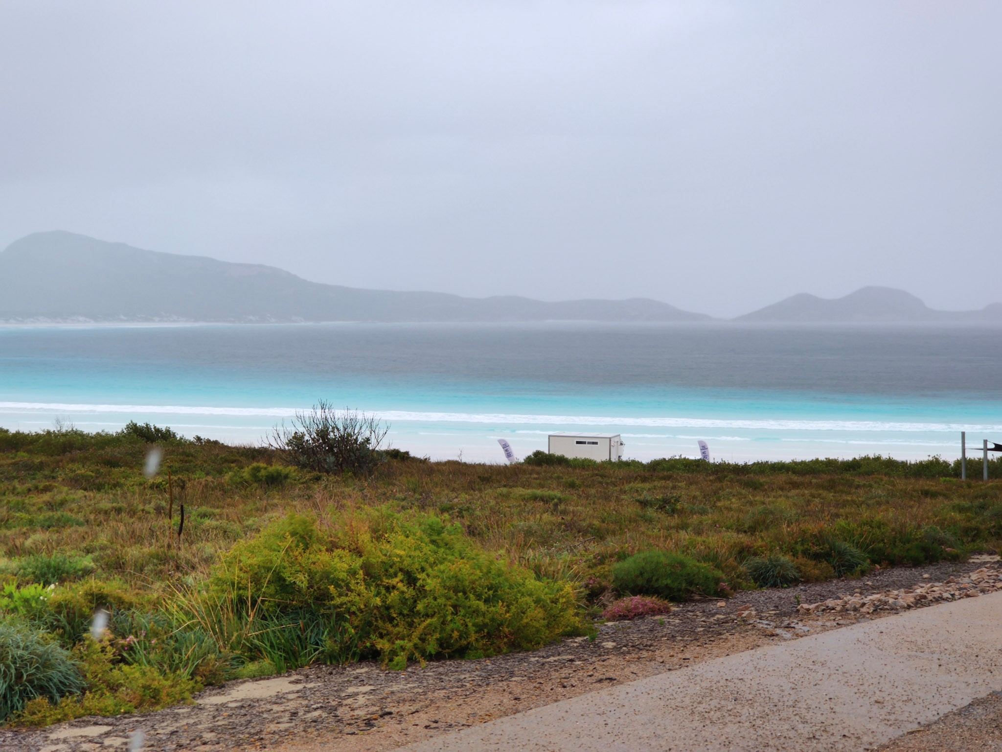 Nachdem der starke Regen heute morgen nach 10 Uhr aufhörte, machte ich mich auf den Weg, die Strände entlang der Great Ocean Road zu besuchen. Dies ist ein Rundweg, welche etwa 20km der Küste entlang führt und dann im Landesinneren entlang des Pink Lake (der schon lange nicht mehr rosa ist) zurück nach Esperance. Es reicht also eigentlich, die Strasse bis zur 11 Mile Lagoon zu fahren und dann umzukehren und die Szenerie von der anderen Strassenseite zu geniessen.