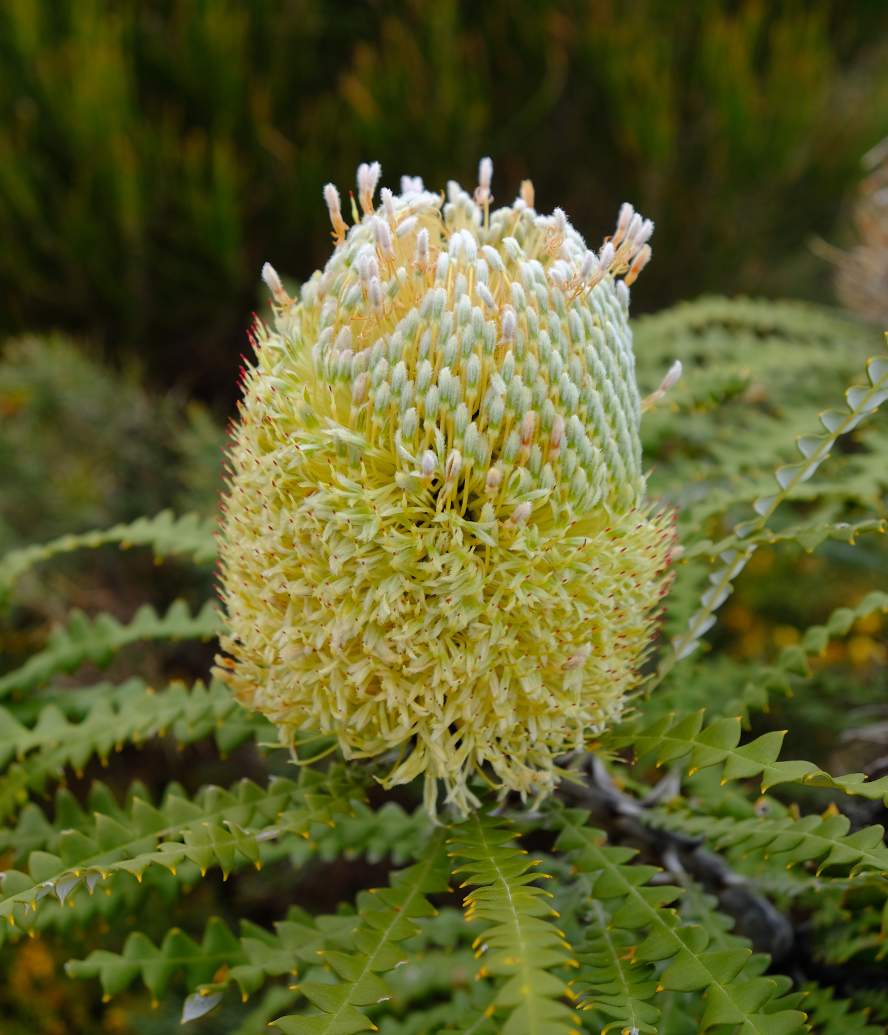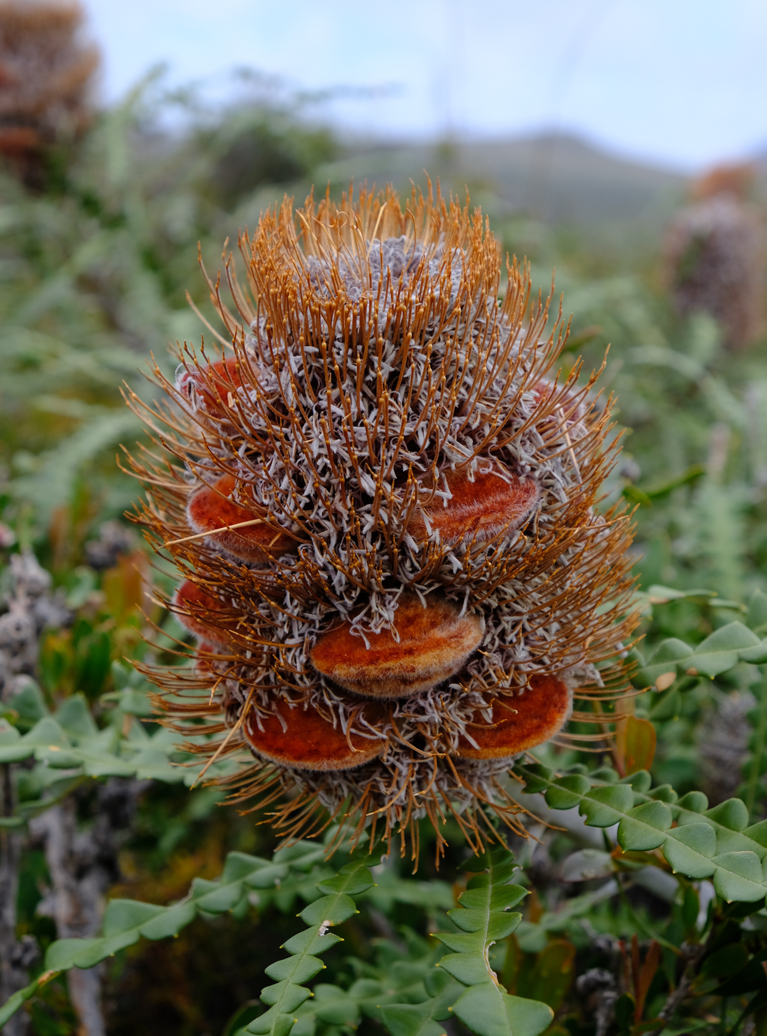 Viele Banksia haben sich an mögliche Buschbrände gut angepasst: Die harten, hölzernen Samenstände vieler Banksia-Arten öffnen sich erst bei grosser Hitze, wie zum Beispiel bei einem Buschfeuer. Die geflügelten Samen fallen aus und werden vom Wind fortgetragen.