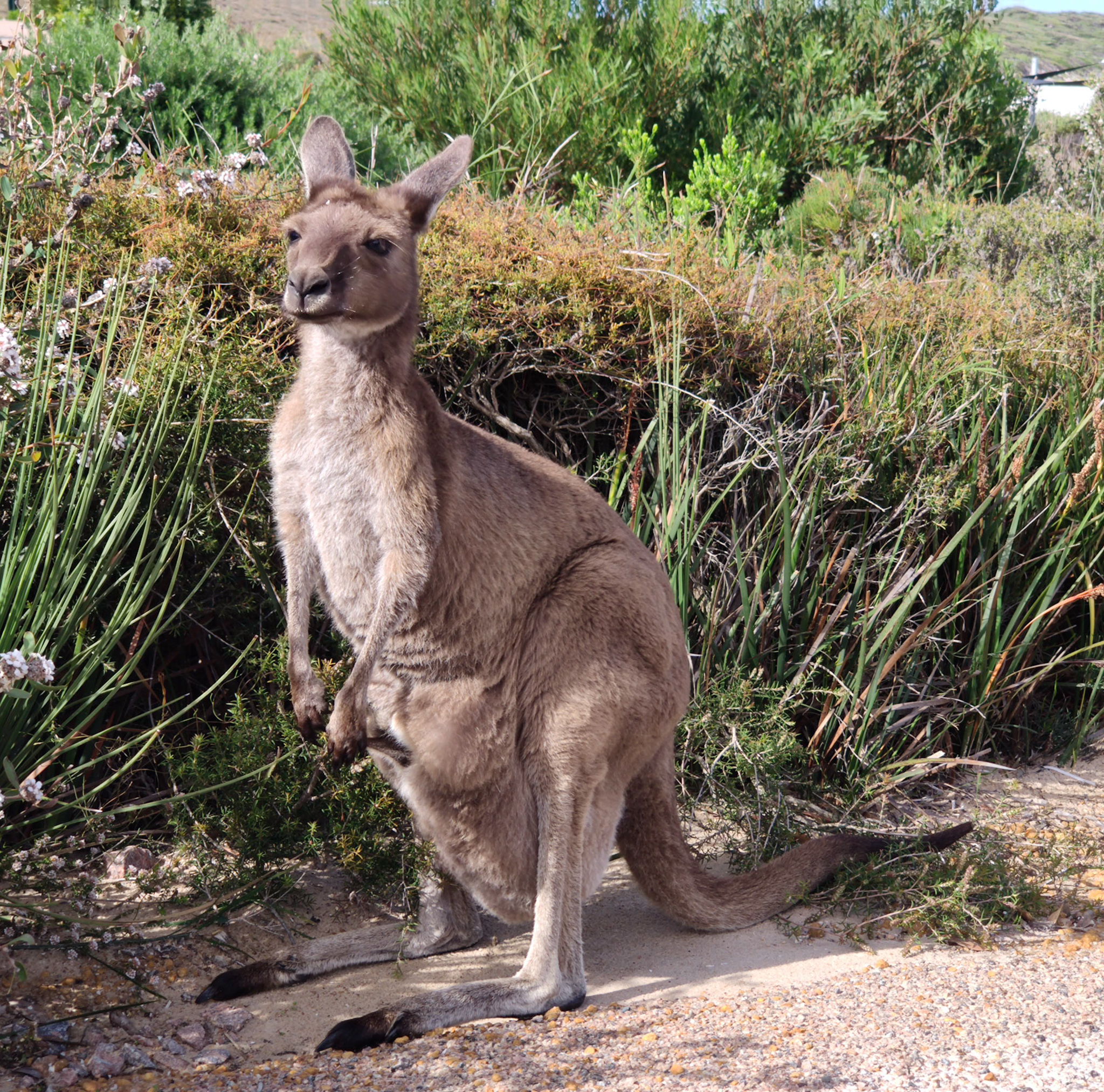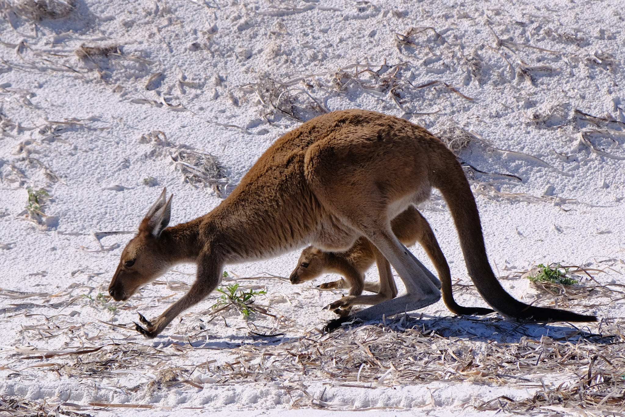 Und ich hatte Glück, denn es tauchte sogar eines der Kängurus mit Jungem am Strand auf, welches zur bekannten Kolonie am Strand gehört. Das Kleine hüpfte dann bald mal in den Beutel, wohl um darin zu säugen.