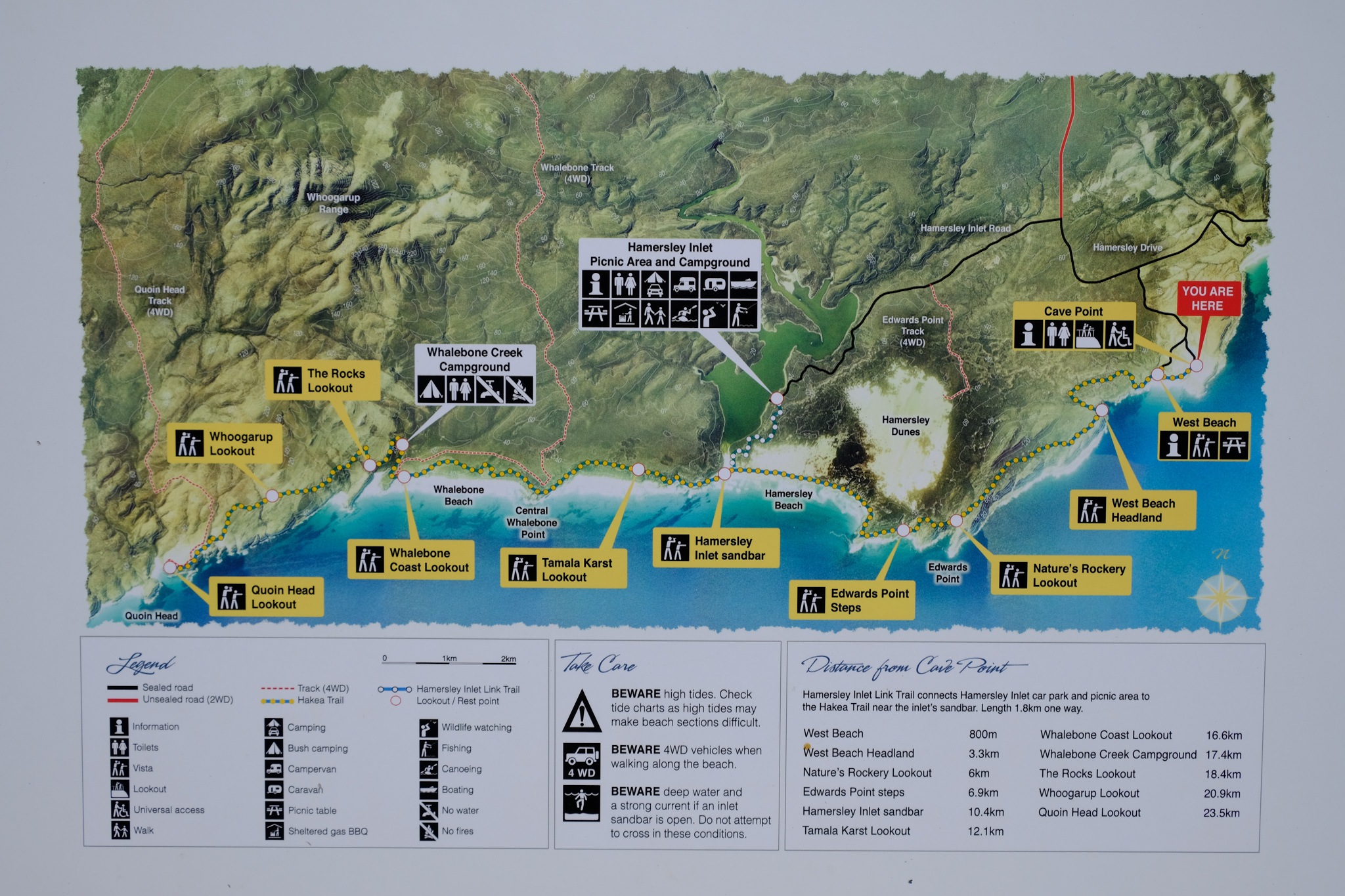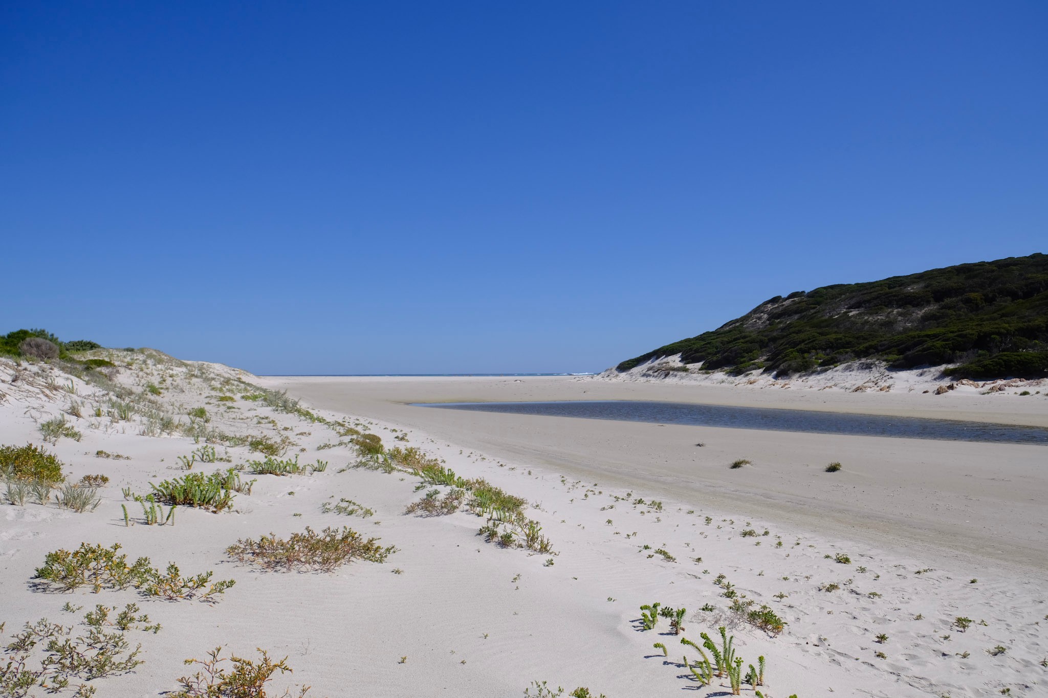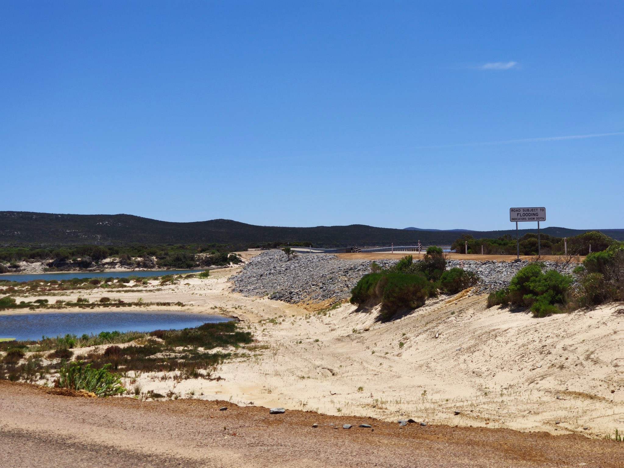 Dieser führt rauf und runter über zahllose bewaldete Dünen zur versandeten Mündung des Hamersley River und zum Strand. Ein toller Weg! Man könnte von hier aus die ganze Küste zurück wandern, der Weg ist gut markiert. Oder weiter in die Wildnis auf dem unmarkierten Weg via Whalebone Creek bis zum Quoin Head gehen. Diese beiden Stationen wären über einen 4WD Track erreichbar.