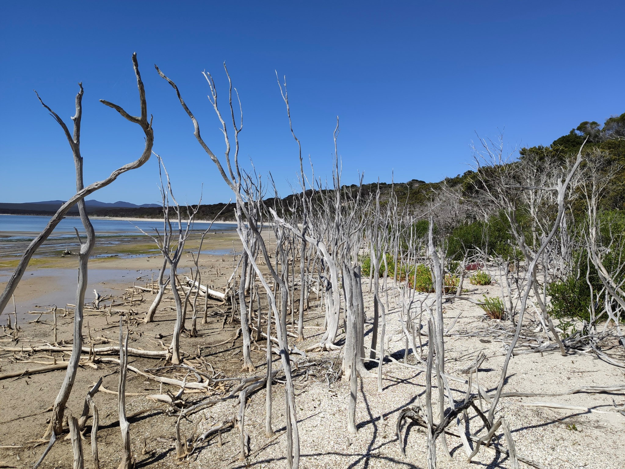 Da es Fahrzeugspuren entlang des Inlets gab, ging ich entlang des Ufers zurück. An einer sumpfigen Stelle ging es durch die abgestorbenen Bäume. Ich nahm viele Spinnfäden mit, was schon etwas gruselig war.