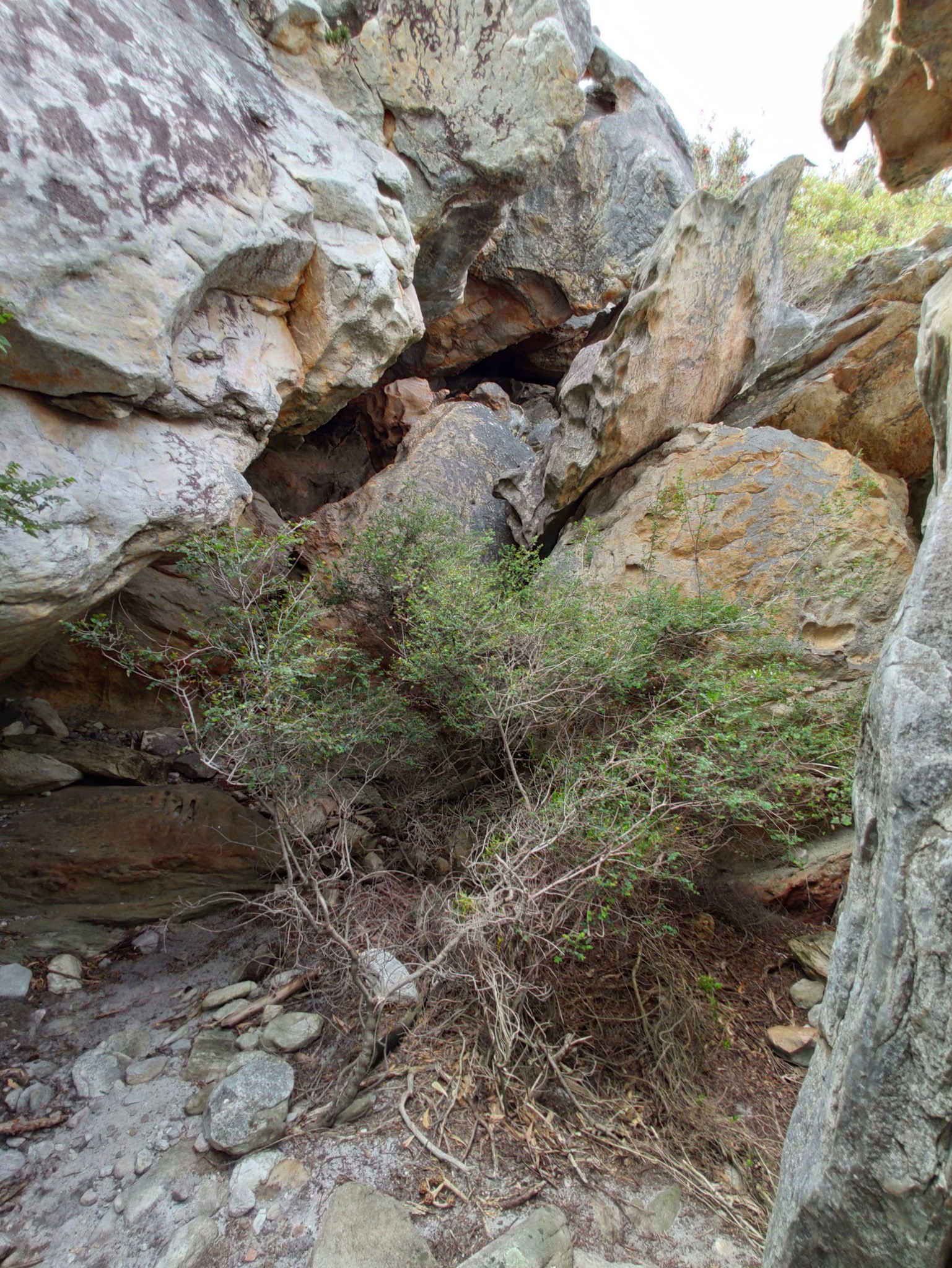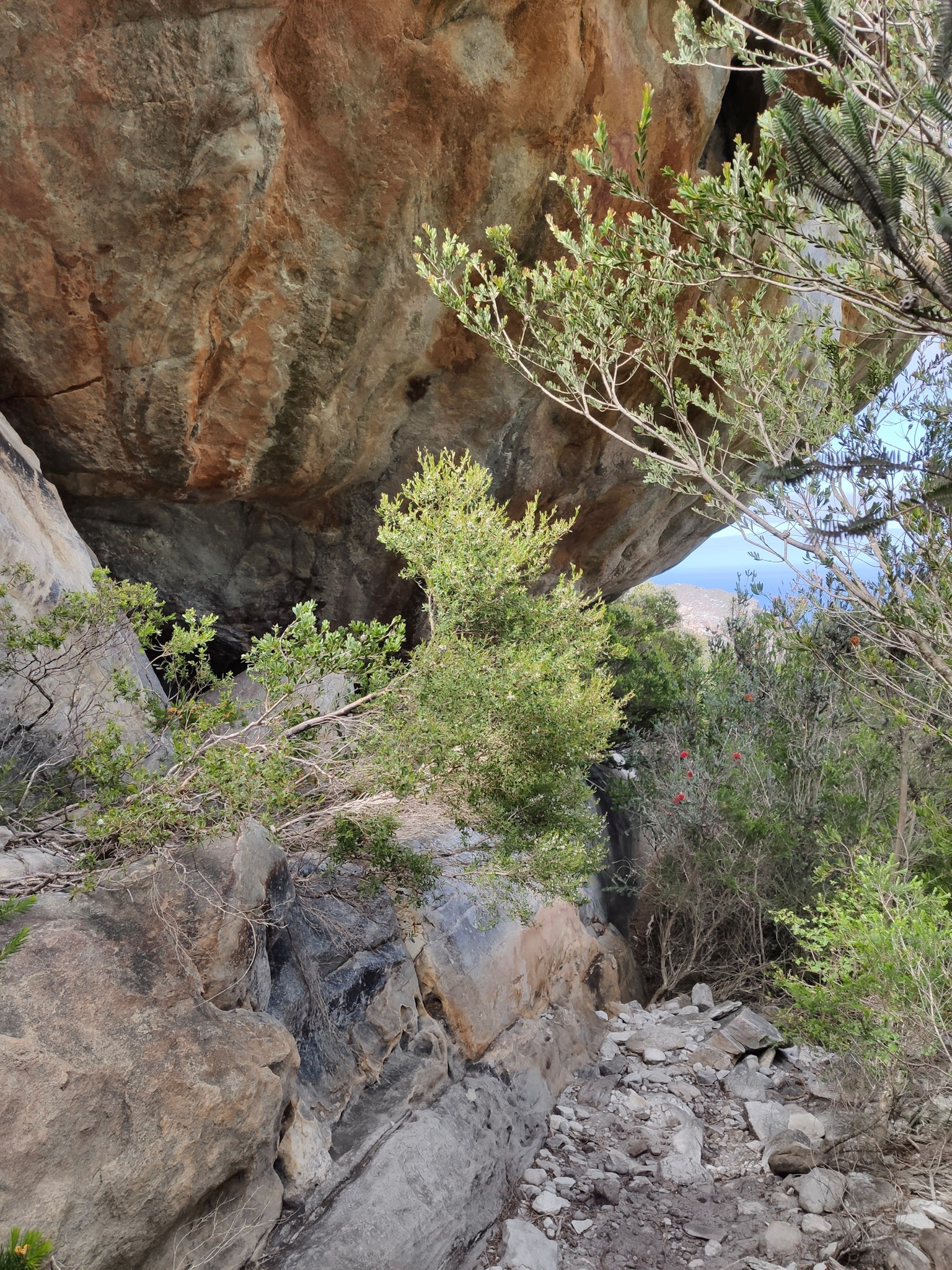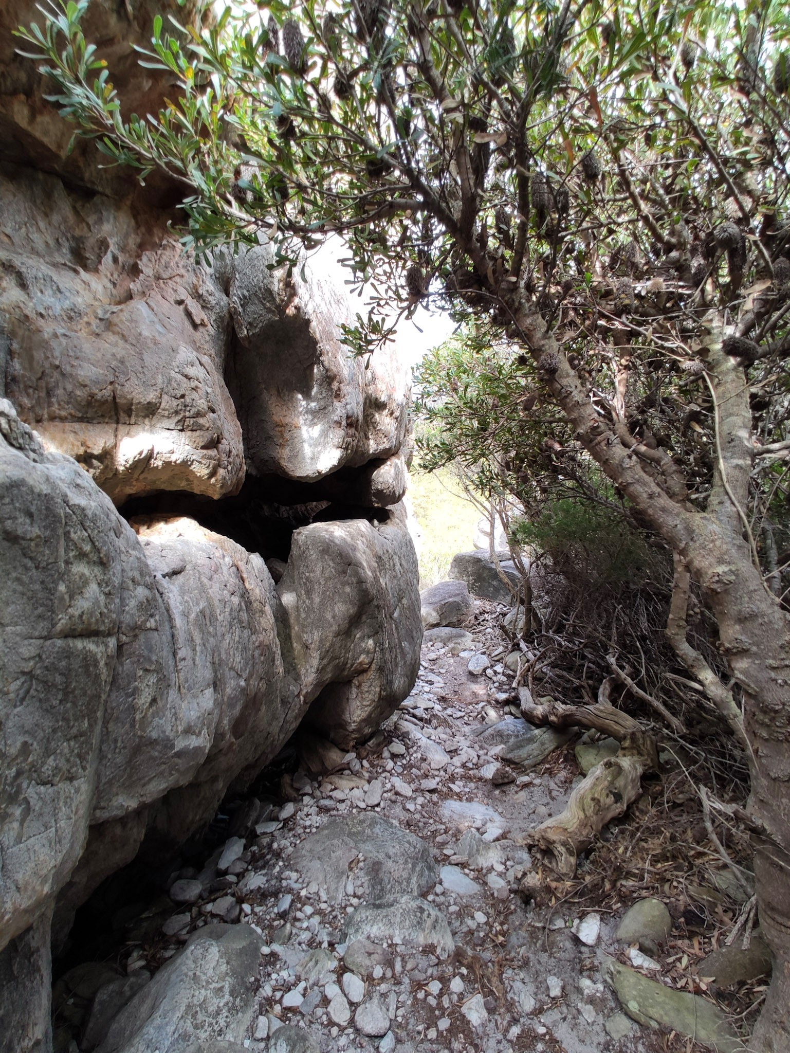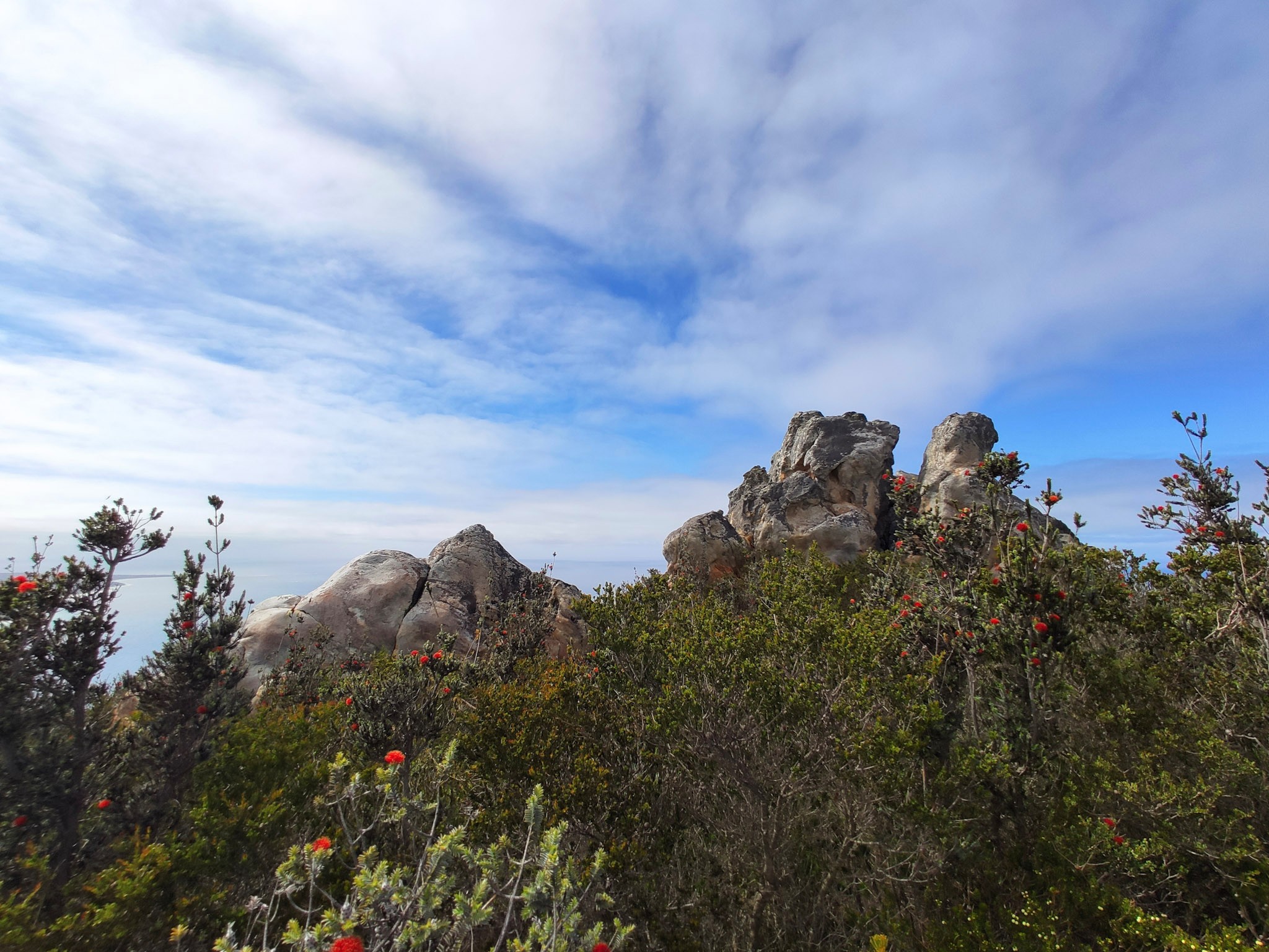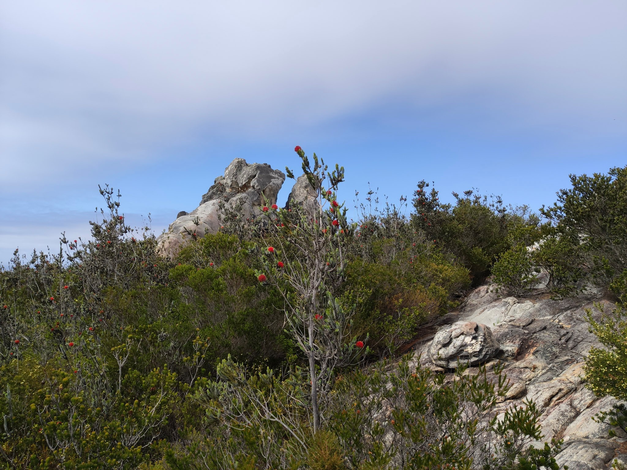 Der Weg geht zuerst recht steil bis zu einer ersten kleinen Ebene. Dabei geht es vielfach ziemlich eng durch das Buschwerk. Aber zum guten Glück machen diese Büsche keine Kratzer, sondern sind recht weich. Dabei sehen sie gar nicht danach aus. Auf dem Weg verscheuche ich noch ein paar Skinke und Lizards von ihren Sonnenplätzen auf den Steinen. Faszinierend sind auch die unterschiedlichen Vogelgesänge und -rufe, die einem auf dem Weg begleiten.