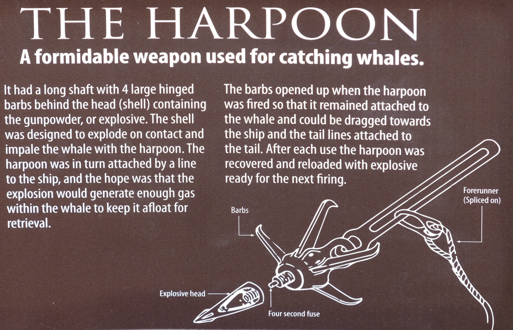 Die Wale wurden dann jeweils von einem Flugzeug aus gesucht und an das Verfolger-Schiff gemeldet. Dieses harpunierte den Wal mit einer Sprengladung, sodass dieser meist sofort tot war. Der Wal wurde dann mit Luft aufgepumpt und an einer Boie befestigt. Dann konnte Jagd auf den nächsten Wal gemacht werden. Abends wurden die Wale vom Schiff eingesammelt und vor der Station an Boien befestigt, sodass die Walkadaver einer nach dem anderen an Land gezogen und verarbeitet werden konnten. Die vom vielen Blut angezogenen Haie wurden in der Bucht per Gewehr geschossen!