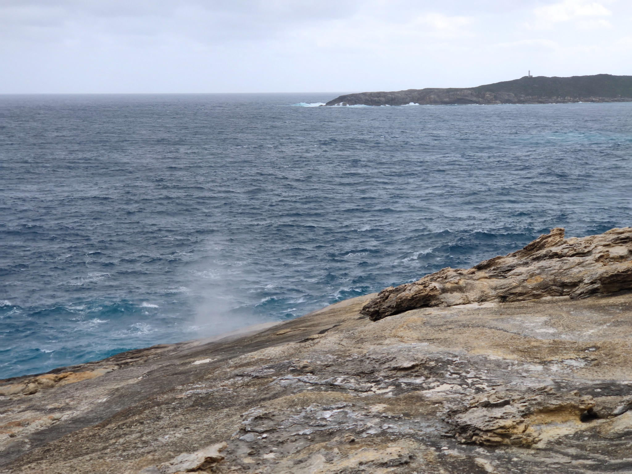 Auf dem Rückweg von Albany’s Whaling Station wollte ich mir diese Sehenswürdigkeiten ansehen. Als ich beim Parkplatz zu den Blowholes anhielt, war der blaue Himmel wieder verschwunden und hat dramatischen dunkelgrauen Wolken Platz gemacht. Also gerade das richtige Wetter, um die Blowholes in Aktion zu sehen und zu hören. Der Weg führt zuerst durch die Büsche, dann entlang des nackten Felsens zu mehreren der Blowholes. Weit unterhalb der immer steiler werdenden Felsen hört man die Wellen am Gestein brechen. Und oben hört man dann die durch die Vertiefungen gedrückte Luft und etwas Gischt durch die Blowholes sausen. Das tönt fast wie der Atem eine gigantischen Wals, der gerade Luft holt. Nur ist die Walsaison schon vorbei!
