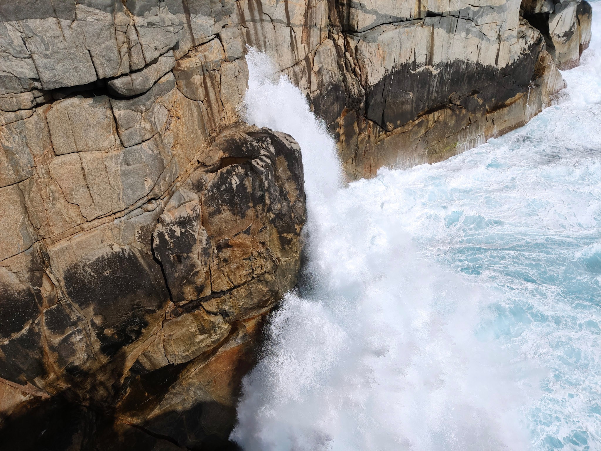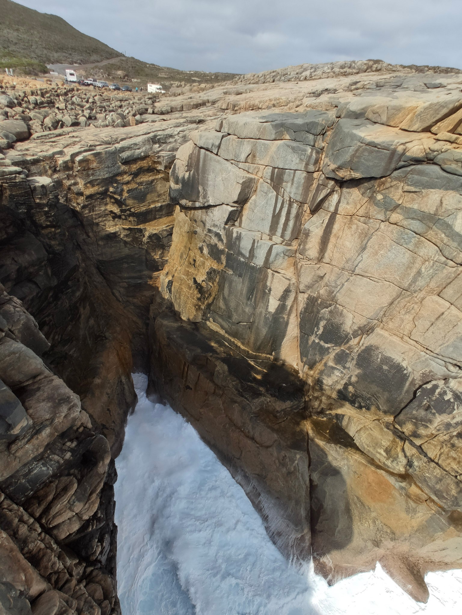 Das mulmige Gefühl, dann fast 40m über der brodelnden und fauchenden See zu stehen, musste ich zuerst überwinden. Dann aber faszinieren die weissen Brecher, welche in den Spalt (The Gap) reindrücken und brüllend eine Gischt erzeugen, welche weit über den Felsrand hinaus spritzt. Jetzt wusste ich auch, dass mein Campervan (im Hintergrund eines Bildes ersichtlich) eine ganz schöne Salzschicht abbekommen würde.