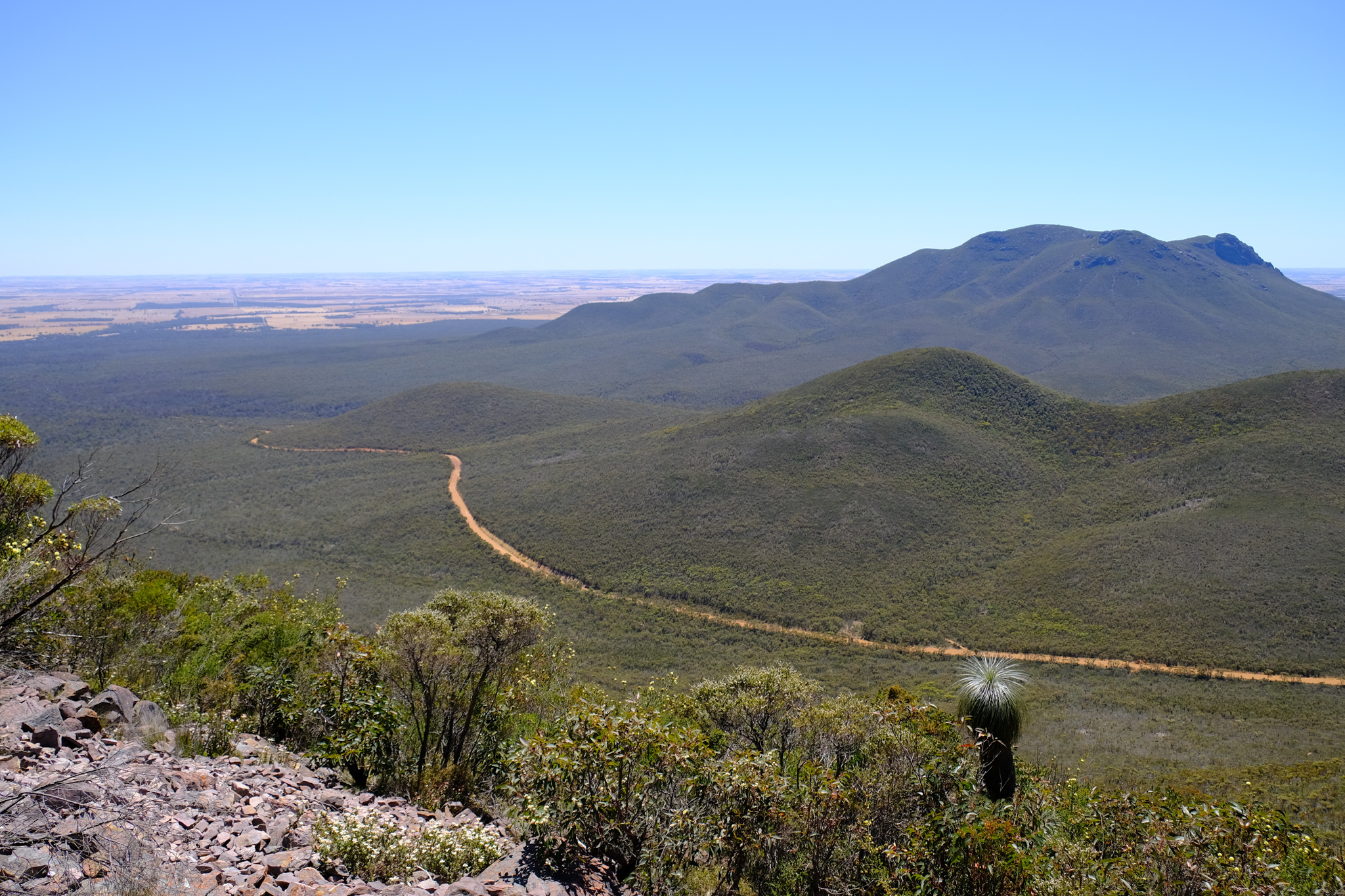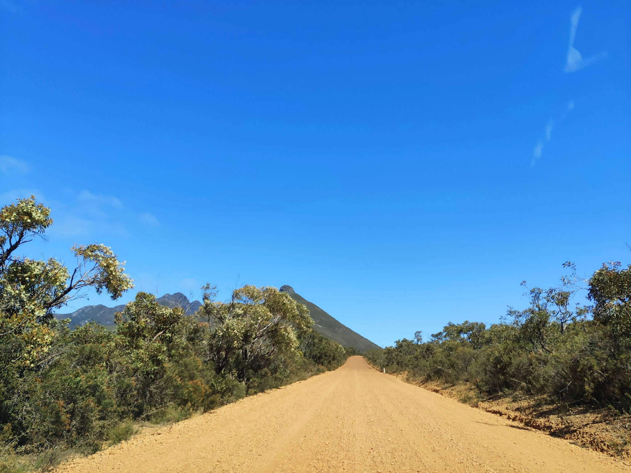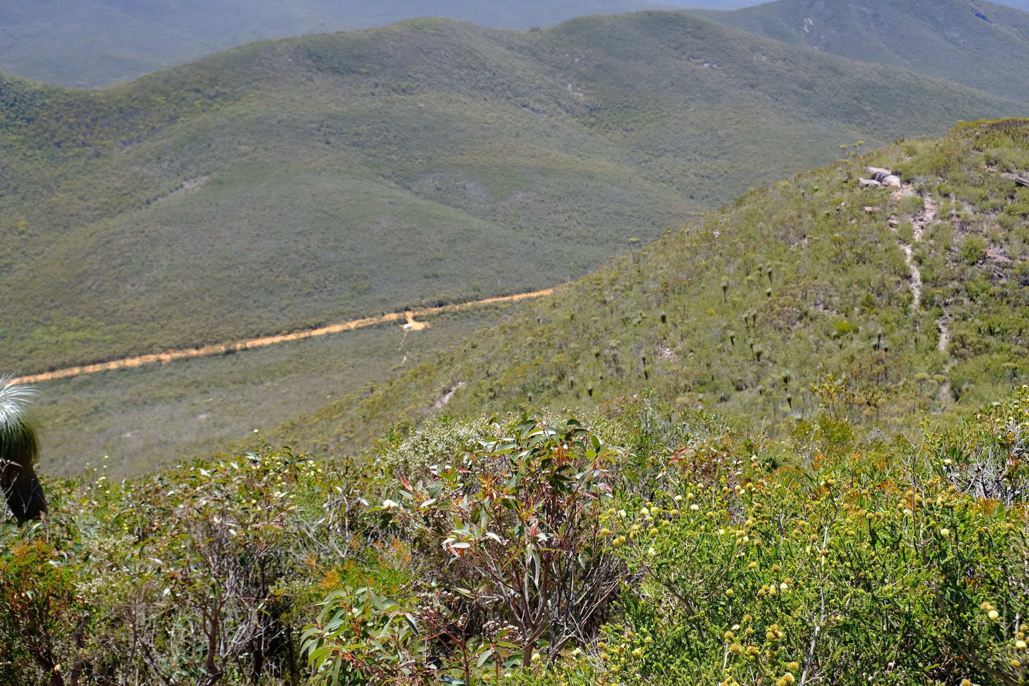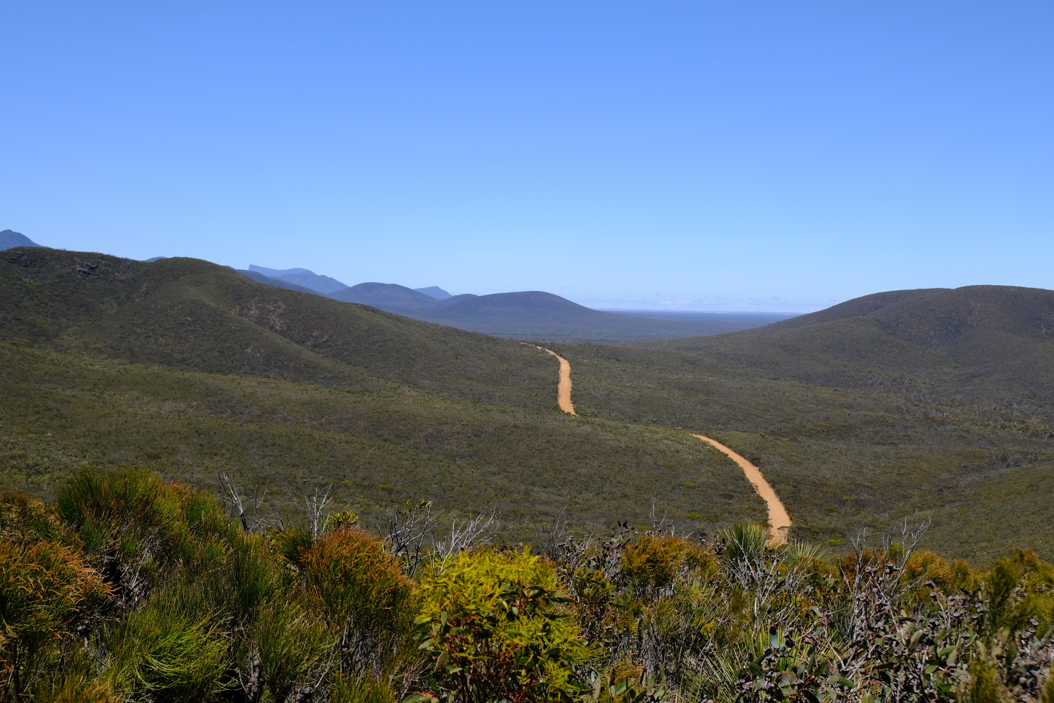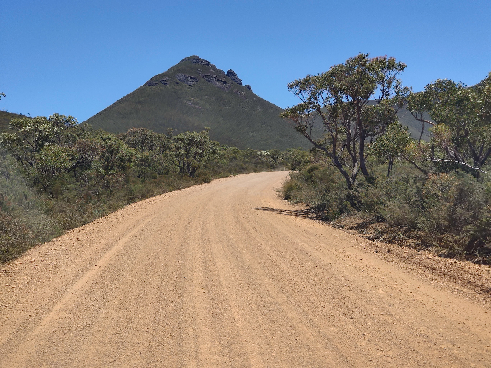 Ich habe entschieden, einen anderen Berg zu besteigen, nämlich den Mount Hassel. Der ist zwar mit 827m etwas weniger hoch, erlaubt aber auch sehr schöne Ausblicke, besonders auf den Toolbrunup Peak, mit 1052müM der zweithöchste Berg der Kette. Der Parkplatz befindet in der Nähe des Starts des Stirling Range Drive. Dieser schlängelt sich durch das Herz des Parks und bietet immer wieder neue Ausblicke auf schroffe Gipfel, von denen jeder seinen einzigartigen Charakter hat. Die 42km lange Fahrt auf grösstenteils nicht asphaltierten Straßen erstreckt sich vom Western Lookout in der Nähe der Red Gum Spring bis zum Eastern Lookout unterhalb von Bluff Knoll. Das wollte ich natürlich auskosten, wenn ich schon mit meinem 4WD auf solchen Strassen fahren darf. Ich habe allerdings im Westen nicht den nördlichen Weg zurück zu Mt Trio und Bluff Knoll genommen, sondern bin Richtung Süden (über Mt Barker) zurück nach Albany gefahren. Das waren dann rund 60km auf Schotterstrassen…