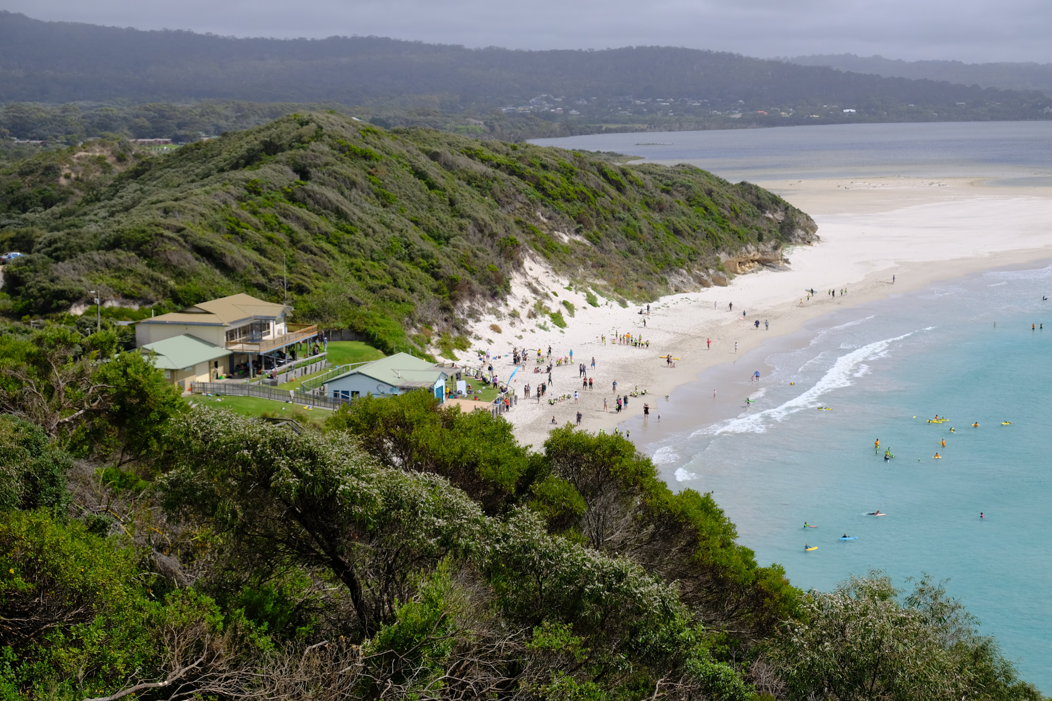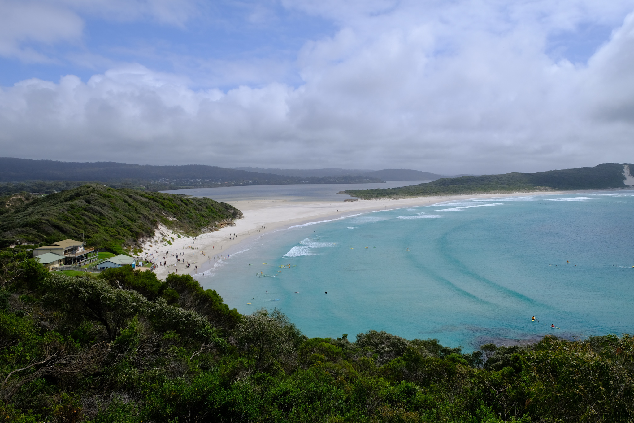 Auf der Anfahrt nach Walpole habe ich mir bei Denmark zuerst die Ocean Beach vom Lookout aus angesehen. Ich hatte mich gewundert, weshalb auf dieser Nebenstrecke (Sackgasse) so viele Autos unterwegs waren. Mit dem Blick vom Lookout war dann alles klar: Die Life Savers hatten alle Kinder zu einem Schwimm- und Surf-Kurs eingeladen. So besetzten sicher hundert Kinder und Jugendliche in Wetsuits den Strand und vergnügten sich mit den Lehrern und Vätern im Wasser. Jetzt war auch der letzte Nieselregen durch und die Sonne drückte langsam durch die Wolken.