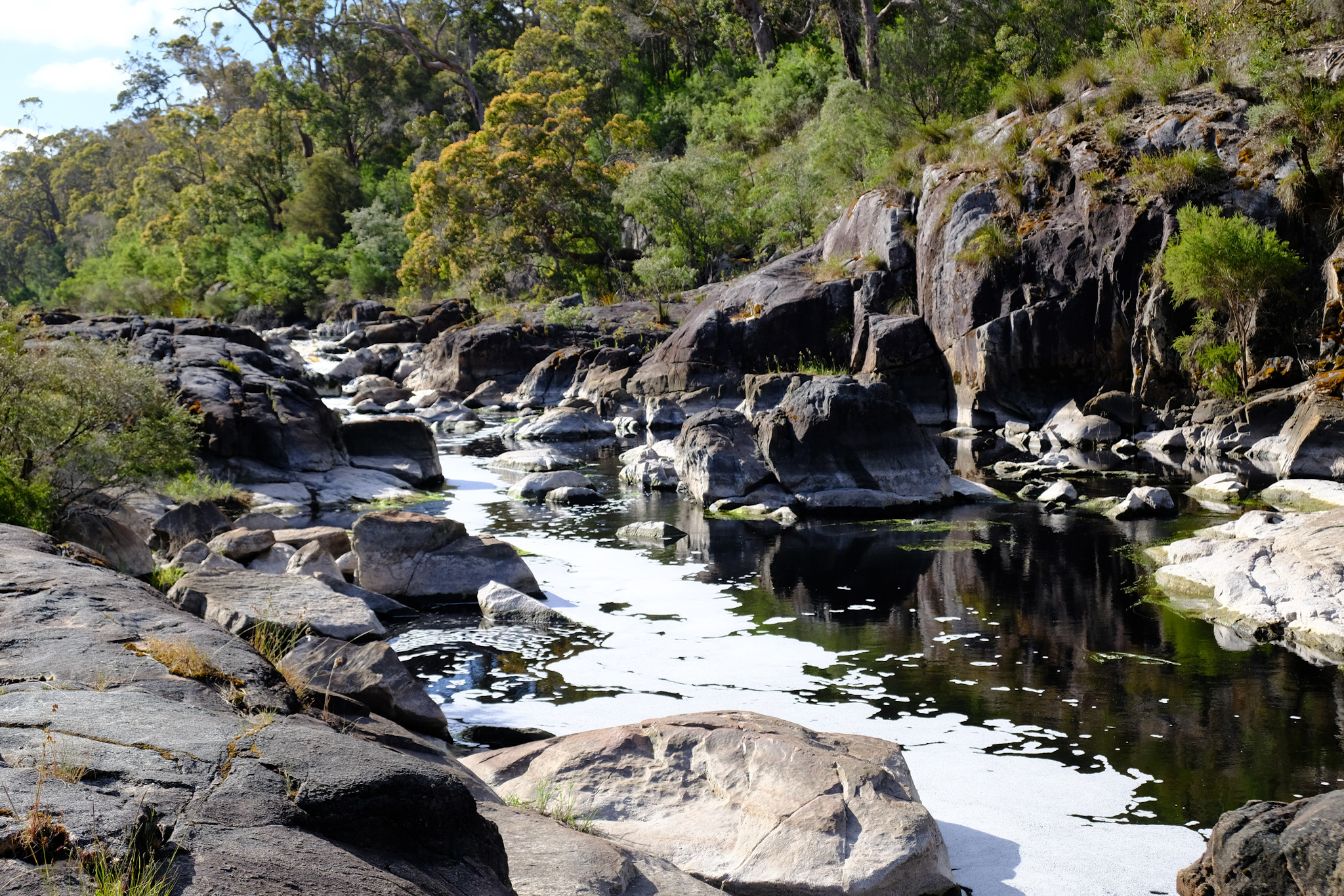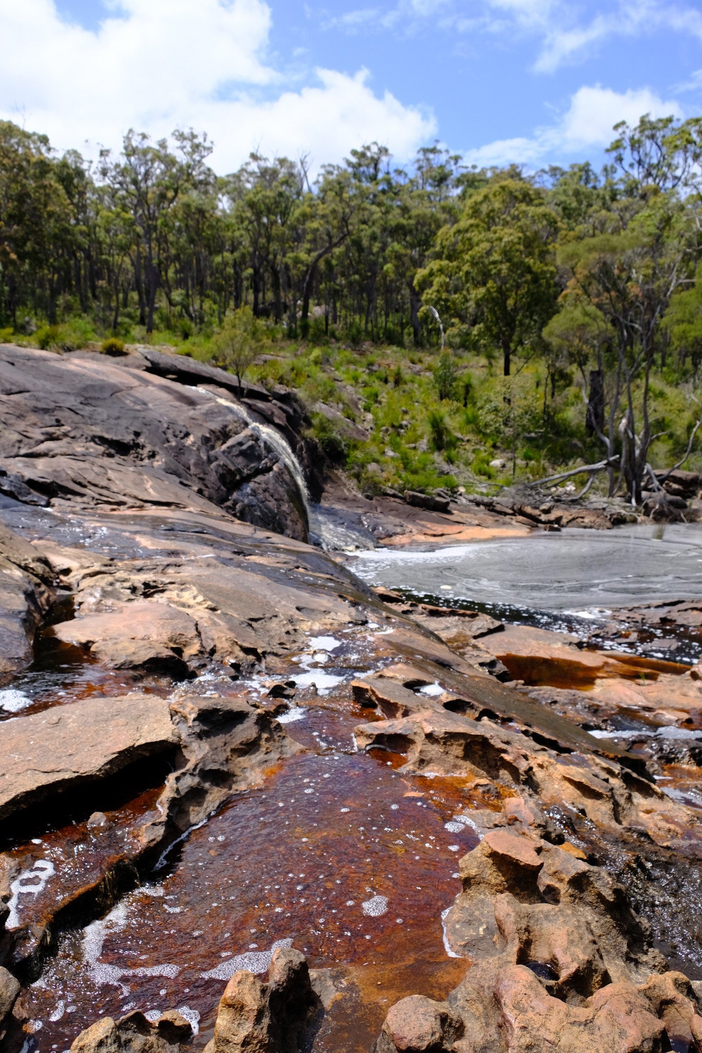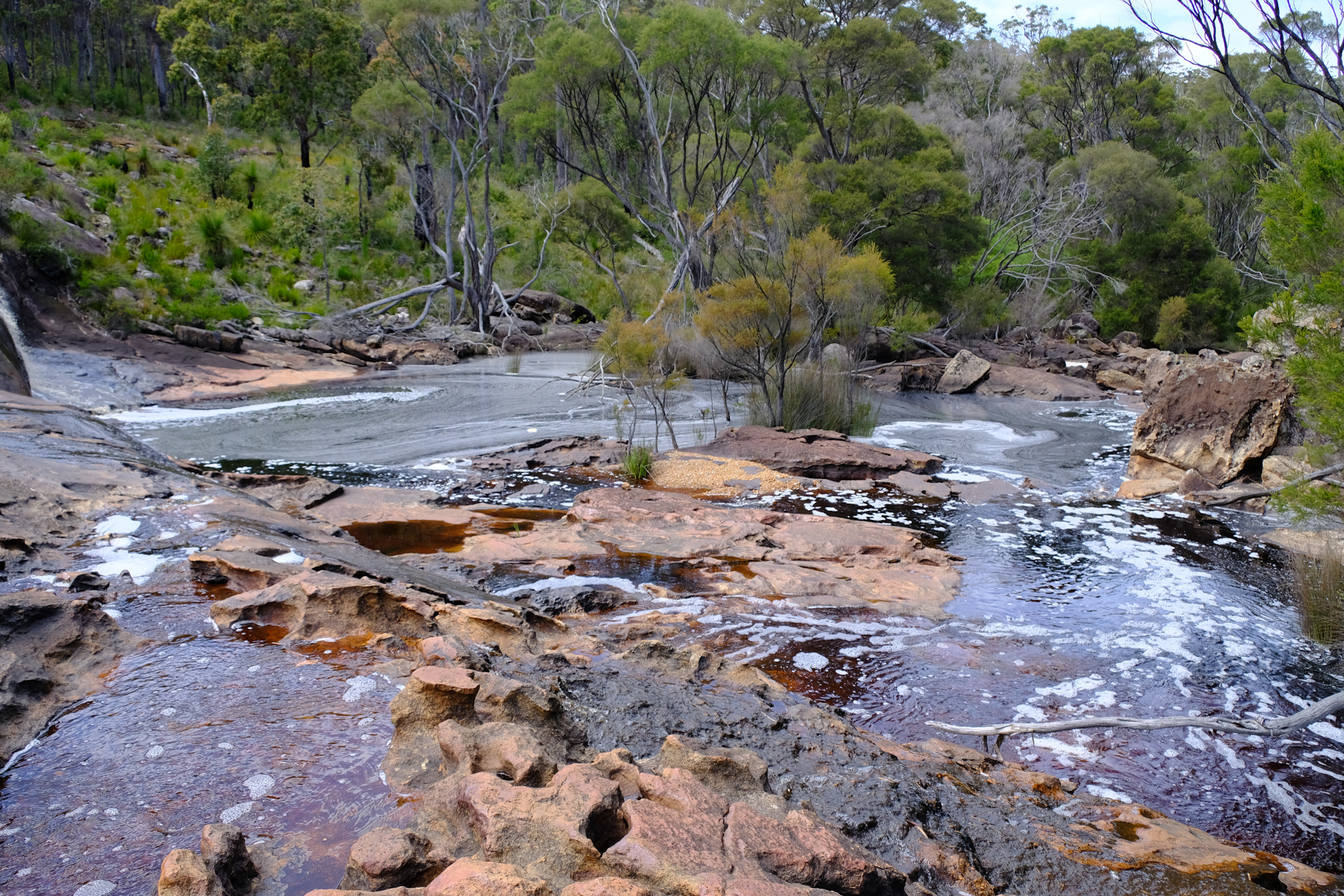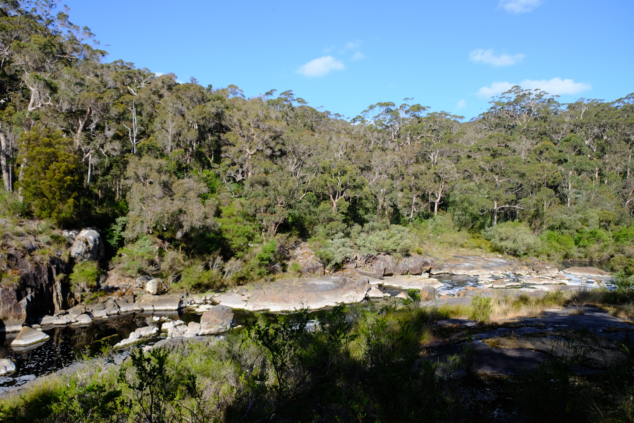 Für diesen Montag habe ich mir eine Rundfahrt durch die Sehenswürdigkeiten des Inlandes der Walpole Wilderness vorgenommen. Als erstes standen die Fernhook Falls auf dem Plan. Diese sind nur wenige Kilometer vom South Coast Hwy, etwa 25km nordwestlich von Walpole, entfernt. Die Wasserfälle donnern im Winter imposant über die Granitfelsen. Im Frühling plätschert angenehm viel Wasser über die Felsen. Sehr idyllisch! Besonders, wenn die Sonne dann auch noch warm scheint. Ich war mal wieder der einzige Besucher.