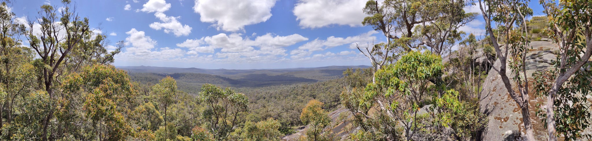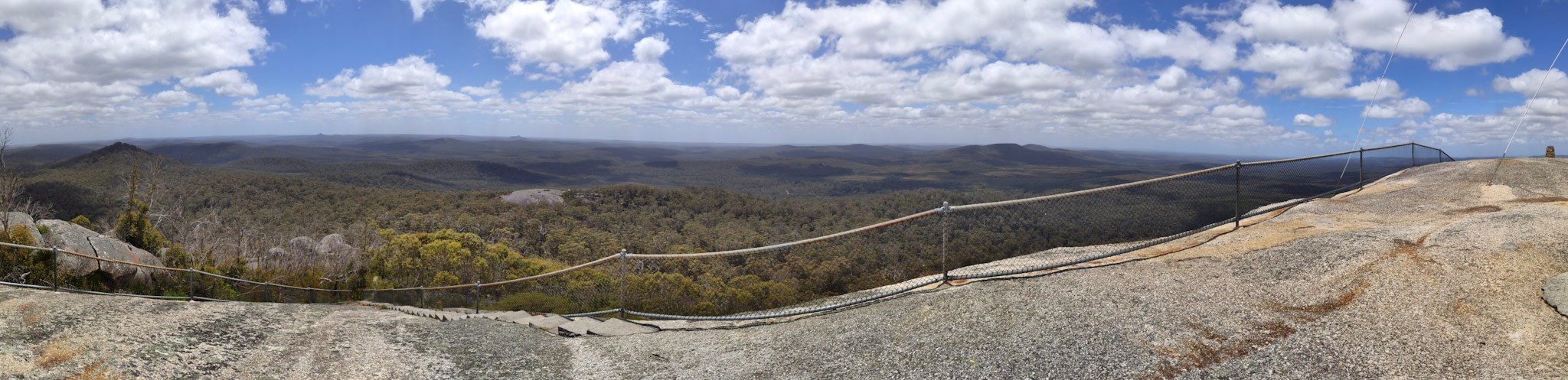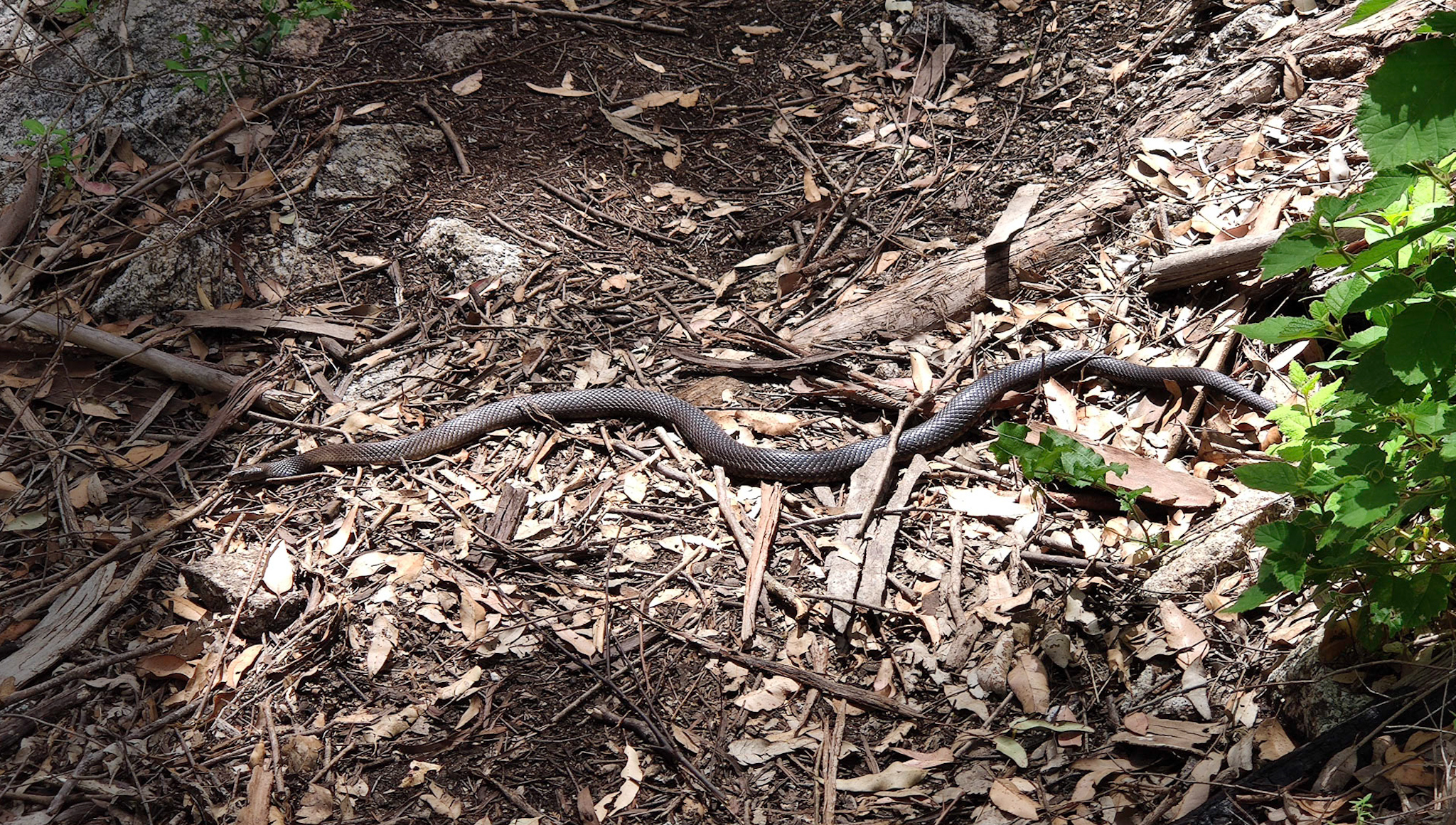 Zurück geht es denn wieder viel einfacher. Am Fuss der Treppen habe ich mich entschieden, dem Caldyanup Trail rund um den Fuss des Granithügels zu folgen. Der Pfad geht rauf und runter durch den Wald. Mit scharfem Auge habe ich auf dem Weg eine grosse Schlange entdeckt, welche sich dort sonnte. Sie liess sich durch Stampfen nicht wegbewegen und einen Weg drumherum gab es auch nicht. Da musste ich halt Stecken und Holzstücke werfen, bis ich sie mal traf und sie in das Gebüsch abhuschte. Ich hab‘ das Foto dann den Holzarbeitern beim Parkplatz gezeigt und sie haben mir bestätigt, dass es sich um eine der giftig(st)en Schlangen Australiens handelte. Neun der zehn giftigsten Schlangenarten der Welt leben sowieso in Australien. Man muss also immer auf der Hut sein und gut beobachten, wohin man tritt und geht.