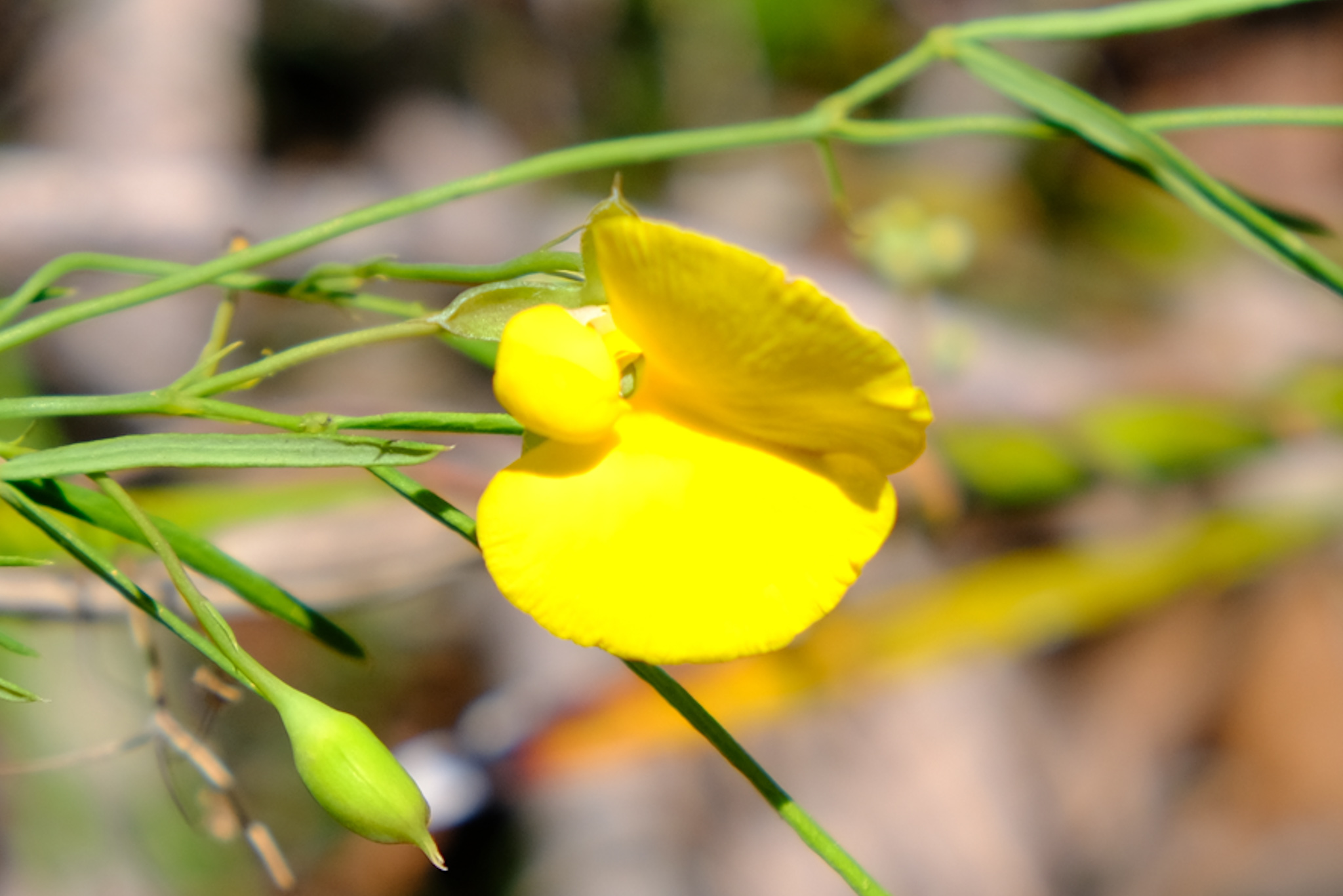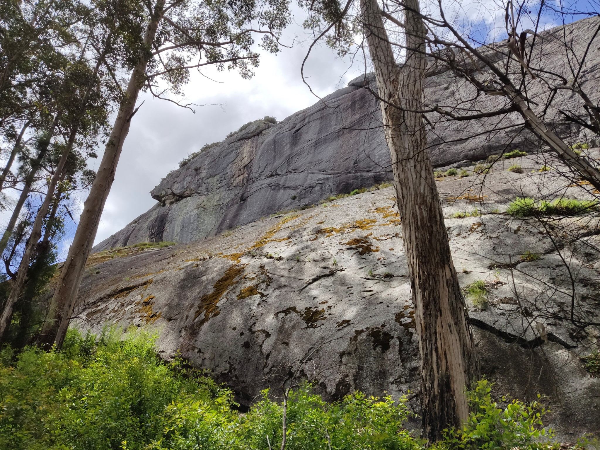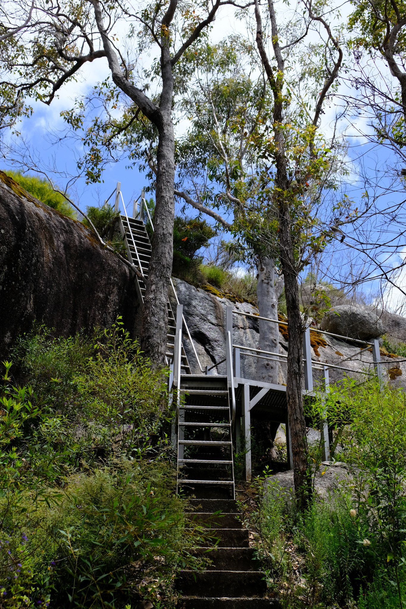 Zurück geht es denn wieder viel einfacher. Am Fuss der Treppen habe ich mich entschieden, dem Caldyanup Trail rund um den Fuss des Granithügels zu folgen. Der Pfad geht rauf und runter durch den Wald. Mit scharfem Auge habe ich auf dem Weg eine grosse Schlange entdeckt, welche sich dort sonnte. Sie liess sich durch Stampfen nicht wegbewegen und einen Weg drumherum gab es auch nicht. Da musste ich halt Stecken und Holzstücke werfen, bis ich sie mal traf und sie in das Gebüsch abhuschte. Ich hab‘ das Foto dann den Holzarbeitern beim Parkplatz gezeigt und sie haben mir bestätigt, dass es sich um eine der giftig(st)en Schlangen Australiens handelte. Neun der zehn giftigsten Schlangenarten der Welt leben sowieso in Australien. Man muss also immer auf der Hut sein und gut beobachten, wohin man tritt und geht.