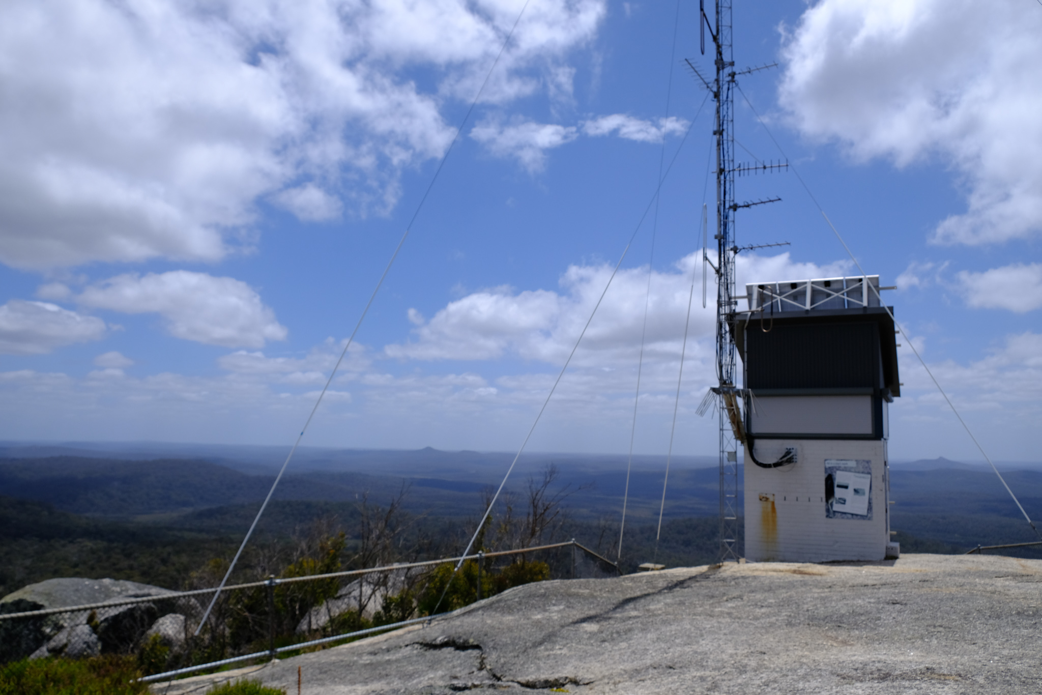 Zuerst folgte ich dem befestigten Pfad auf den Gipfel. Dieser wird bald von unendlich vielen Treppenstufen und zwischendrin einer Treppenleiter abgelöst. Der Pfad diente dem früheren Ausguck auf dem Granitfelsen, welcher mögliche Brände im Areal überwachte. Der Wärter durfte diese Treppen jeden Tag rauf und runter gehen! Mit etwas Energie hat man das geschafft und wird mit weiten Ausblicken über die Wildnis belohnt. Die moderne Station steht immer noch auf dem Gipfel, ist nun aber mindestens teilautomatisiert und durch Flugzeug abgelöst. In der Station hört man den Funk, denn jemand hat vergessen, die Lautsprecher abzuschalten.