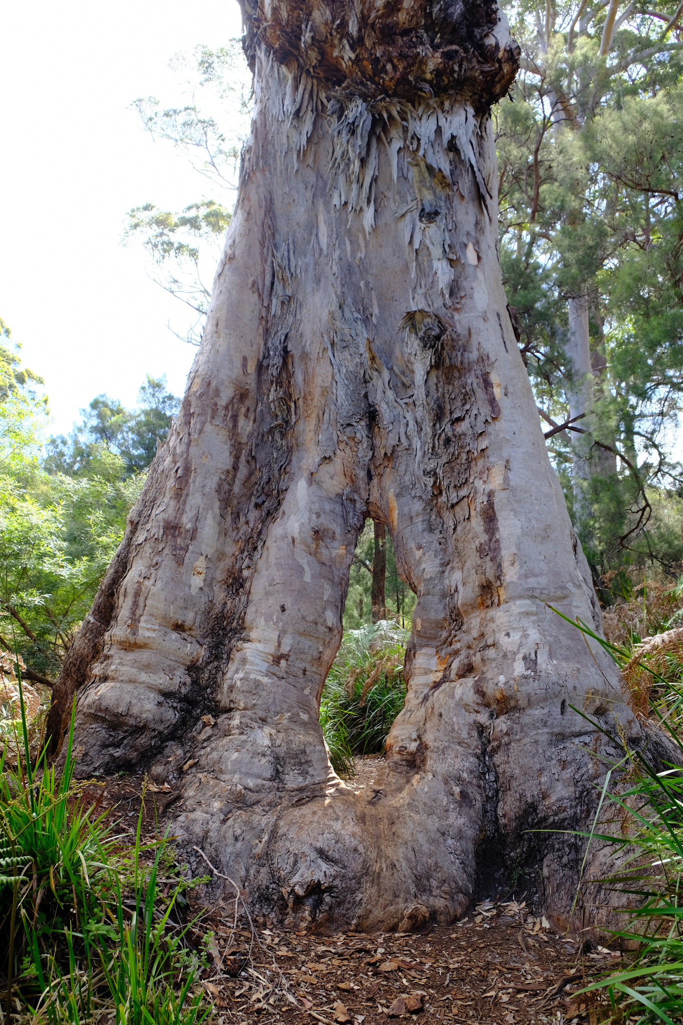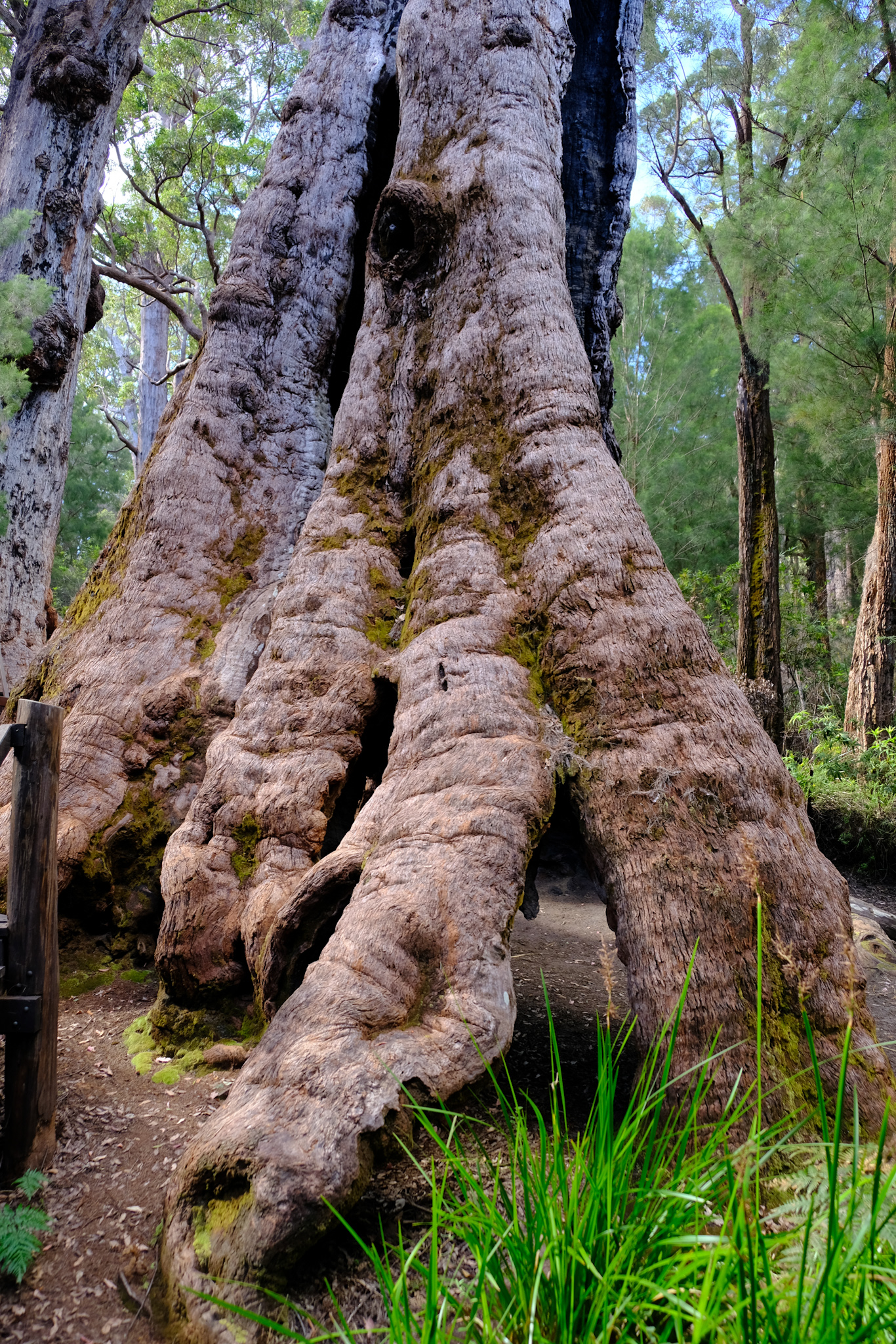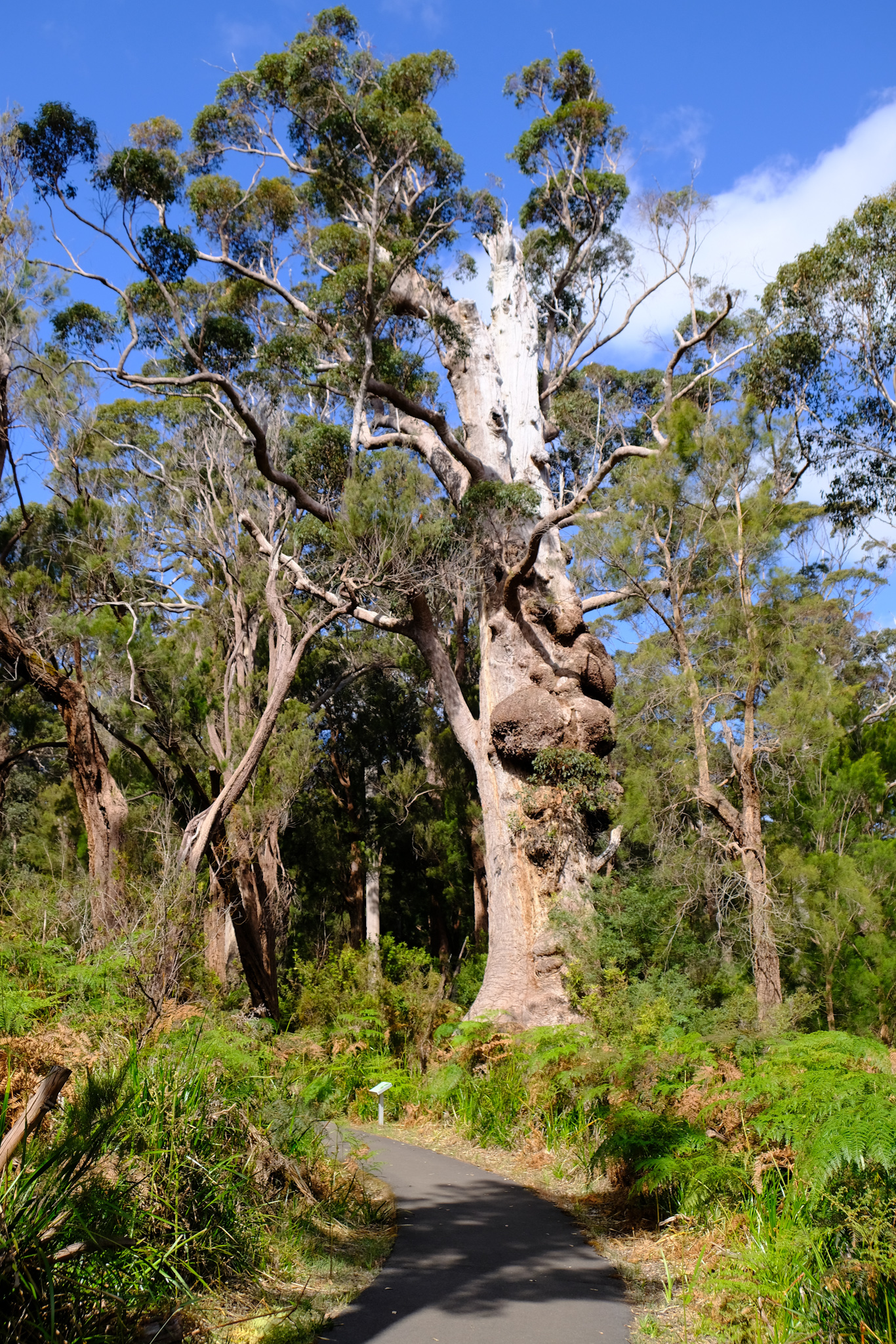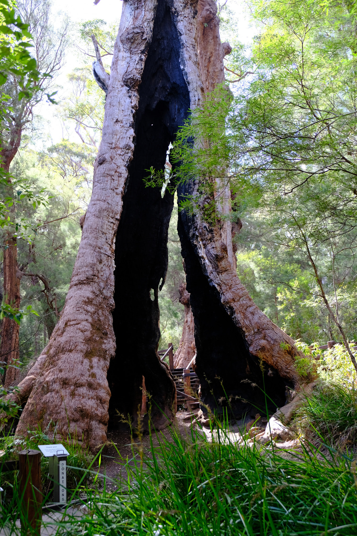 Dort befindet sich ein beeindruckender Pfad durch die hohen Bäume. Der Giant Tingle Tree ist innen total ausgebrannt und steht sozusagen nur noch auf seiner Rinde, der äusseren aktiven Schicht. Das ist bei den Bäumen gar nicht unüblich. Denn Pilze und Insekten greifen den Baum an und hinterlassen Lücken in der feuerfesten Rinde. Dort greift dann ein Buschfeuer an und verbrennt langsam das tote Innere des Baumes manchmal über Monate. Dem Baum macht das nicht sehr viel aus, solange er stabil bleibt. Wenn das aber vorfällt, entwickelt er meist neue Seitentriebe, um das Wachstum der Hülle zu durch den Wasserfluss verstärken. Bei den Bäumen sieht man noch Jahrzehnte später an den Brandspuren und Jahrhunderte später den Ästen, ob sie von Buschfeuer beschädigt wurden.