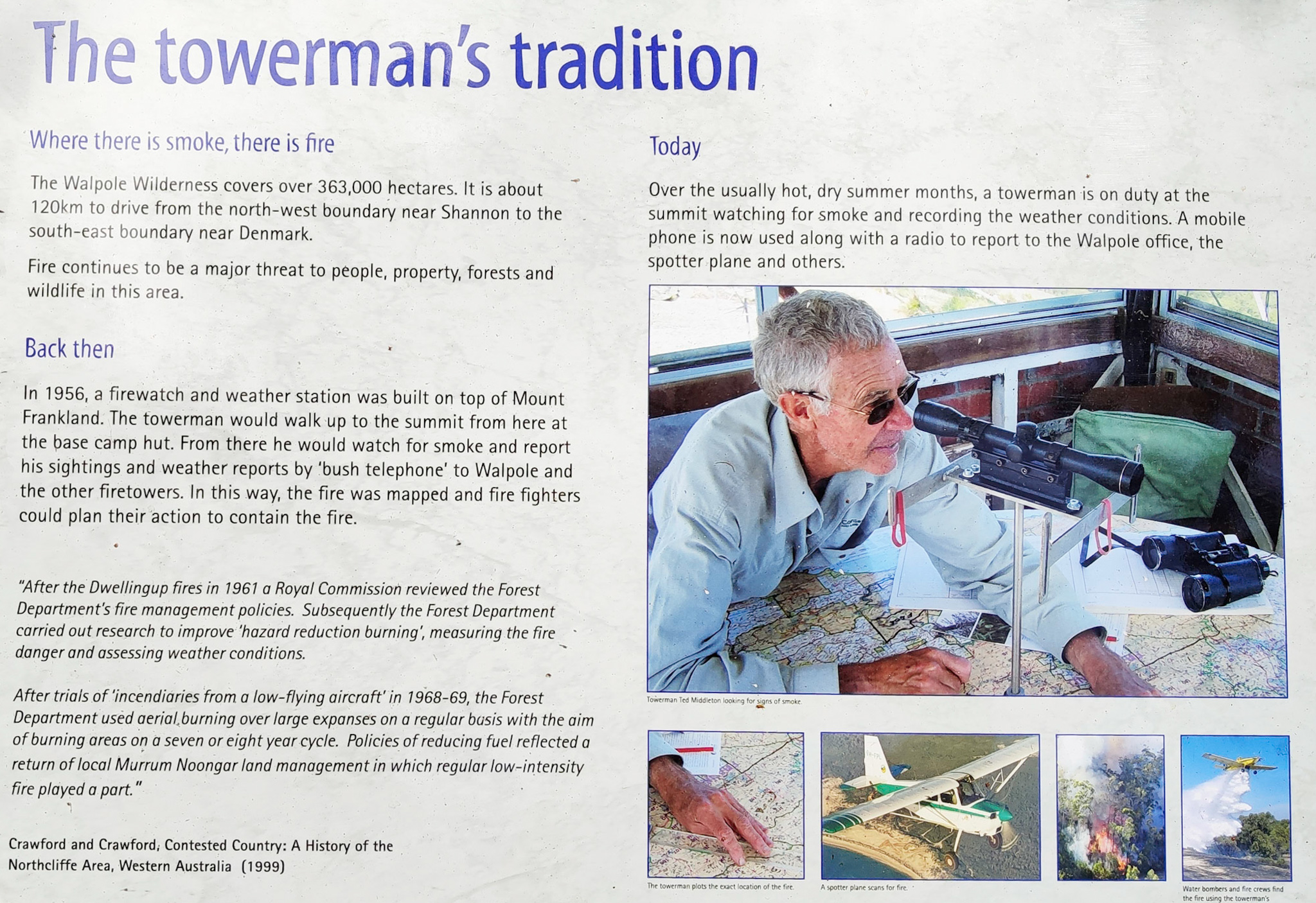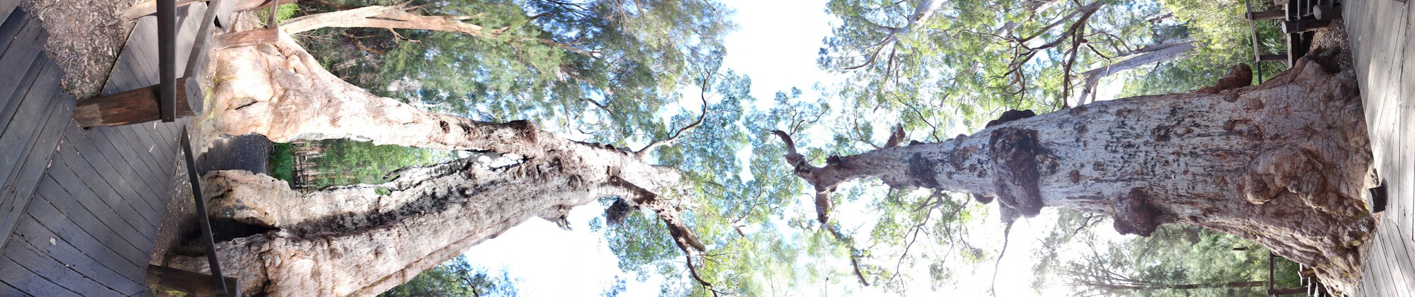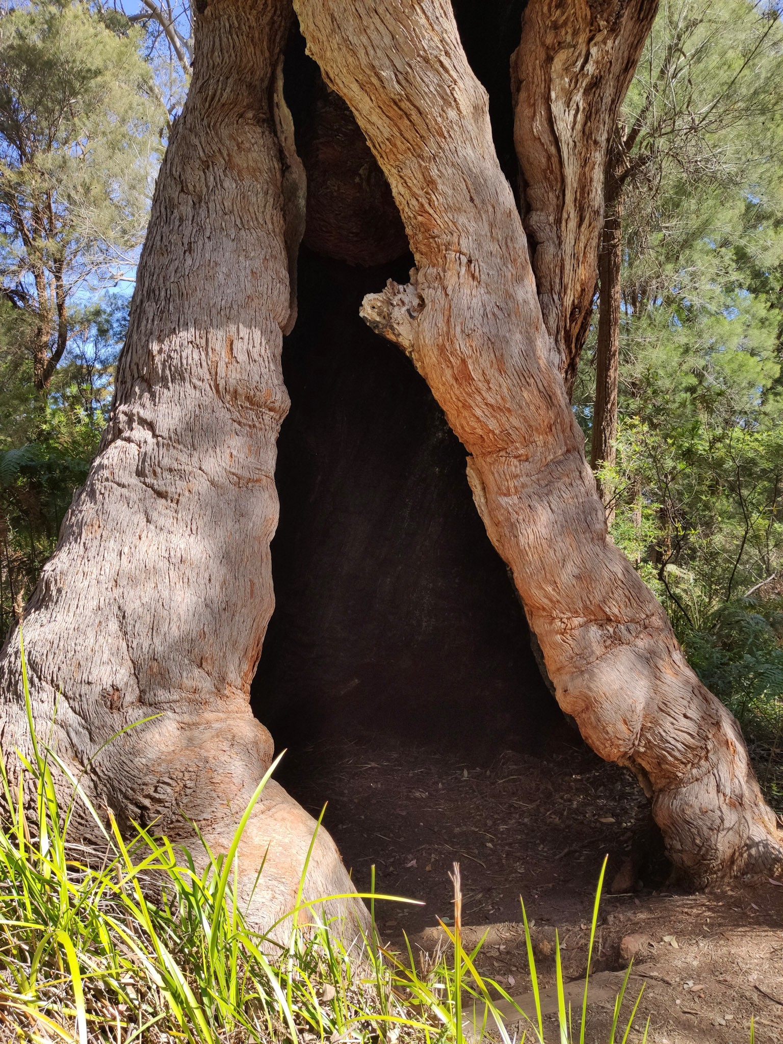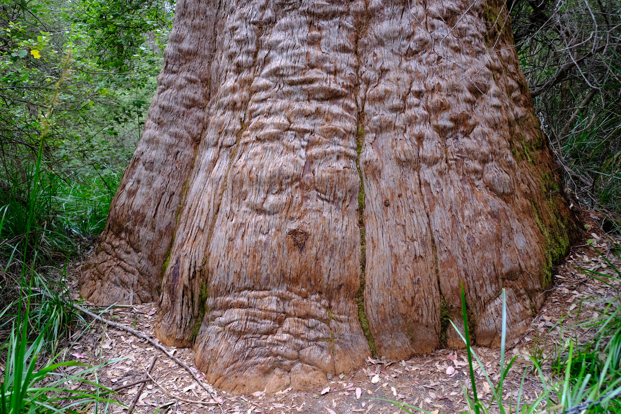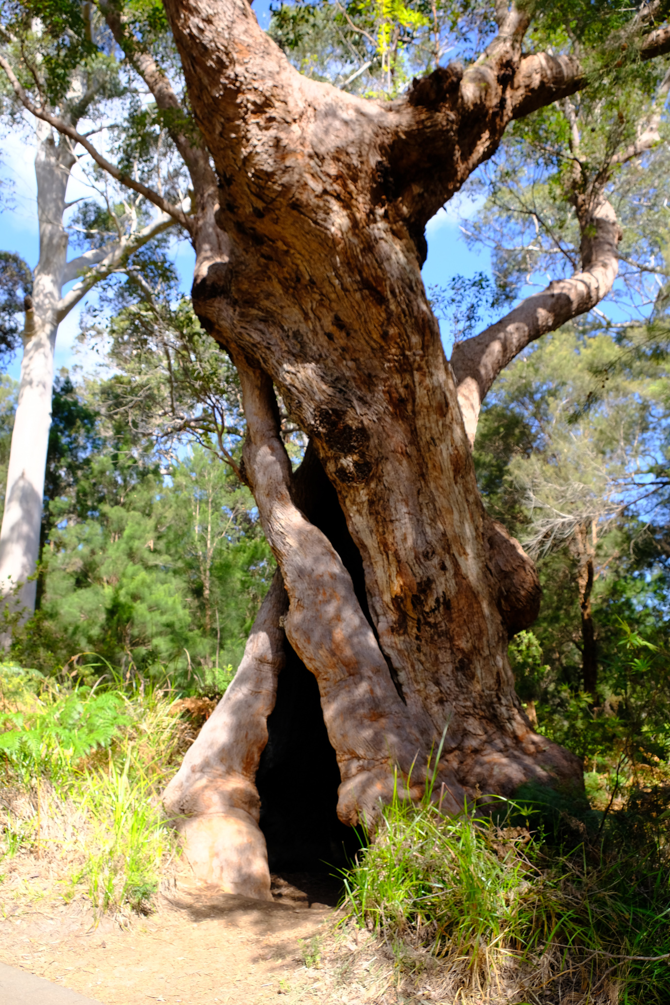 Dort befindet sich ein beeindruckender Pfad durch die hohen Bäume. Der Giant Tingle Tree ist innen total ausgebrannt und steht sozusagen nur noch auf seiner Rinde, der äusseren aktiven Schicht. Das ist bei den Bäumen gar nicht unüblich. Denn Pilze und Insekten greifen den Baum an und hinterlassen Lücken in der feuerfesten Rinde. Dort greift dann ein Buschfeuer an und verbrennt langsam das tote Innere des Baumes manchmal über Monate. Dem Baum macht das nicht sehr viel aus, solange er stabil bleibt. Wenn das aber vorfällt, entwickelt er meist neue Seitentriebe, um das Wachstum der Hülle zu durch den Wasserfluss verstärken. Bei den Bäumen sieht man noch Jahrzehnte später an den Brandspuren und Jahrhunderte später den Ästen, ob sie von Buschfeuer beschädigt wurden.