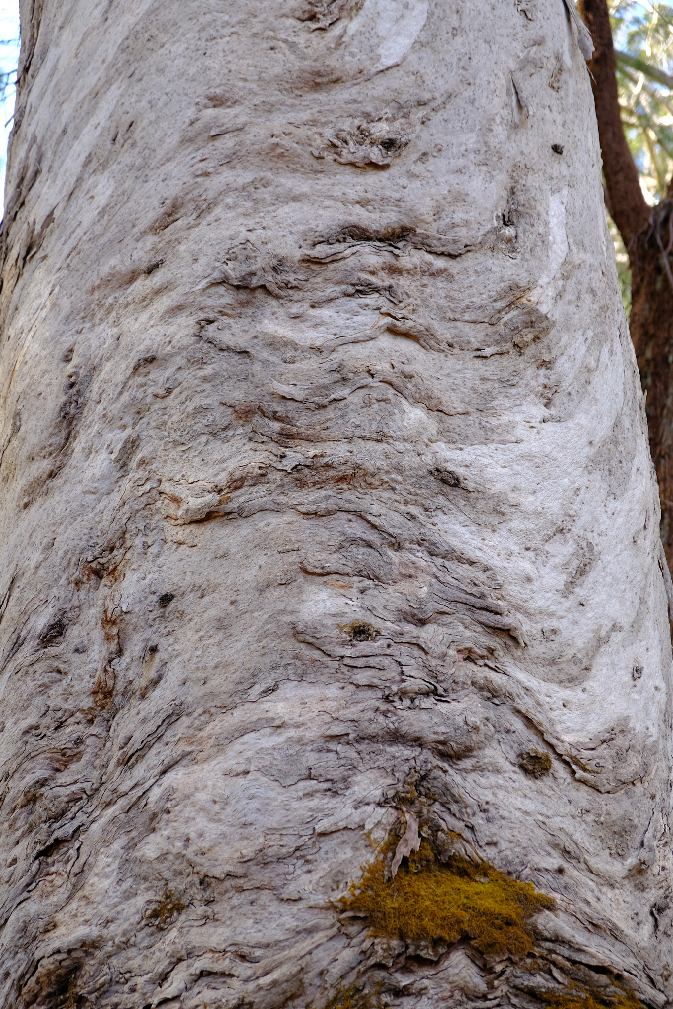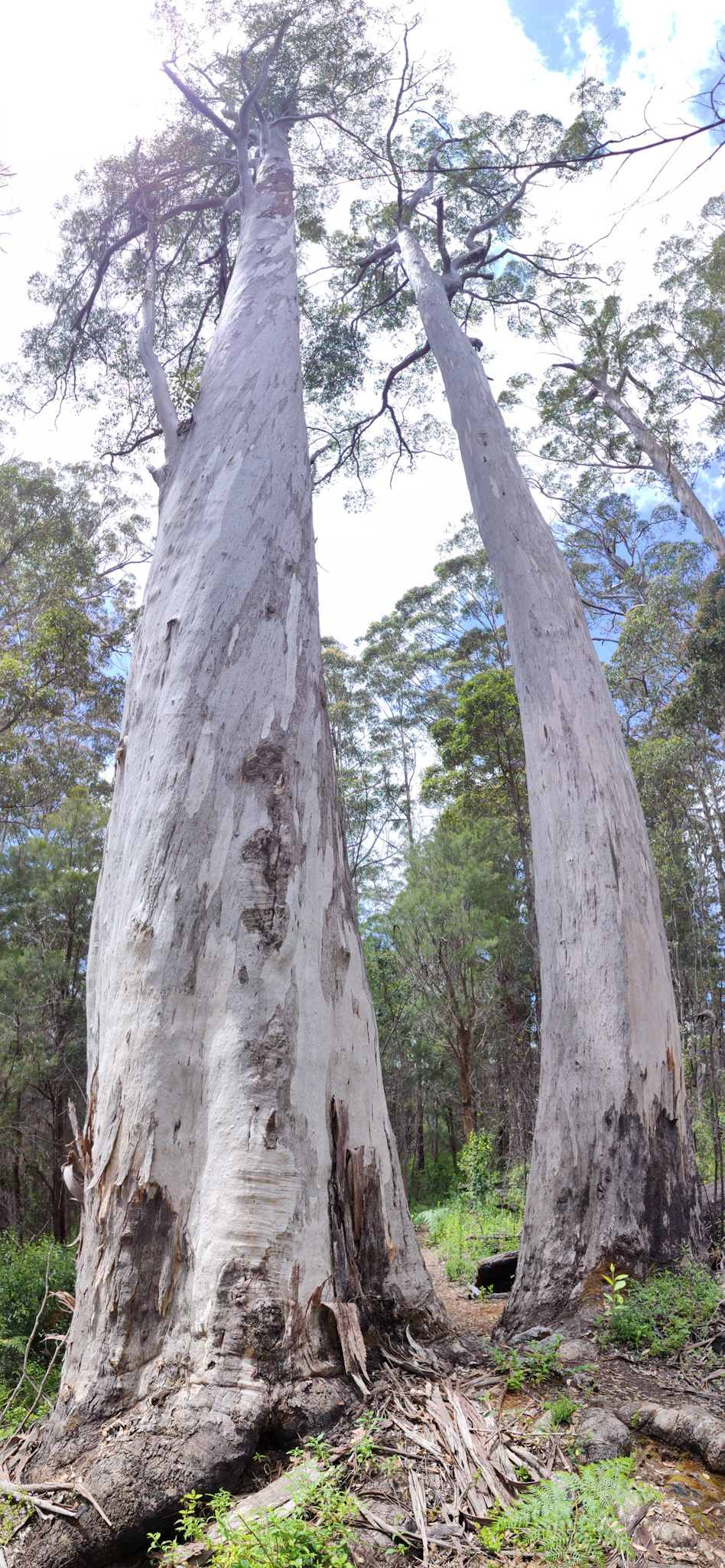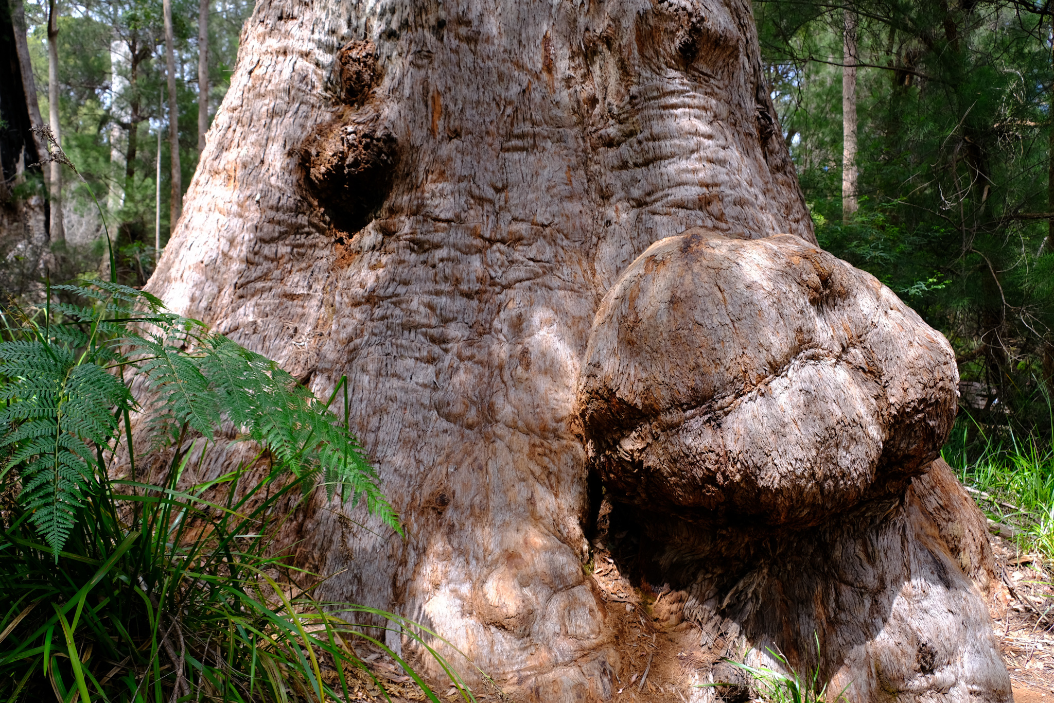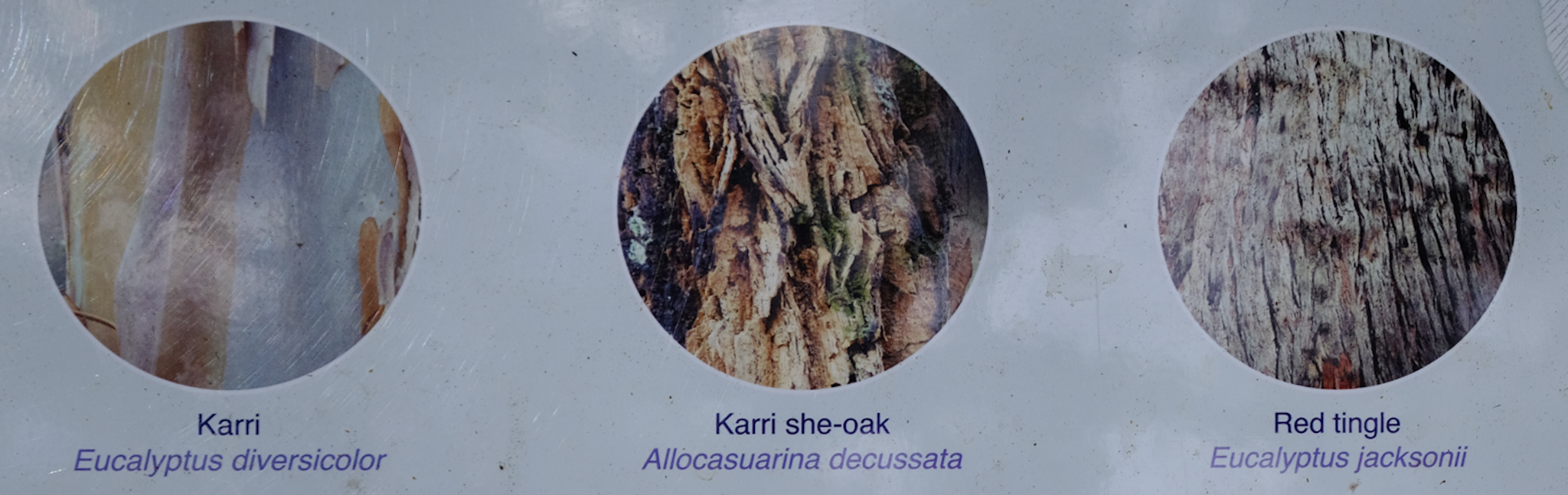 Red Tingle (Eucalyptus jacksonii): Mit einer Höhe von bis zu 75m und einem Umfang von bis zu 20m erkennt man den Red Tingle an den grossen, häufig ausgehöhlten Basen. Der Red Tingle Verfasser im Stamm mit dem Alter. Deshalb ist er als Nutzholz kaum geeignet. Diese Aushölungen entstehen durch eine Kombination aus Pilz- und Insektenbefall und anschliessendem Feuer, wobei das tote Holz aus der Mitte des Baumes herausgebrannt wird. Red Tingle wächst nur in einem kleinen Gebiet um Walpole und Nornalup und benötigt jedes Jahr über einen Meter Regen, um gedeihen zu können.