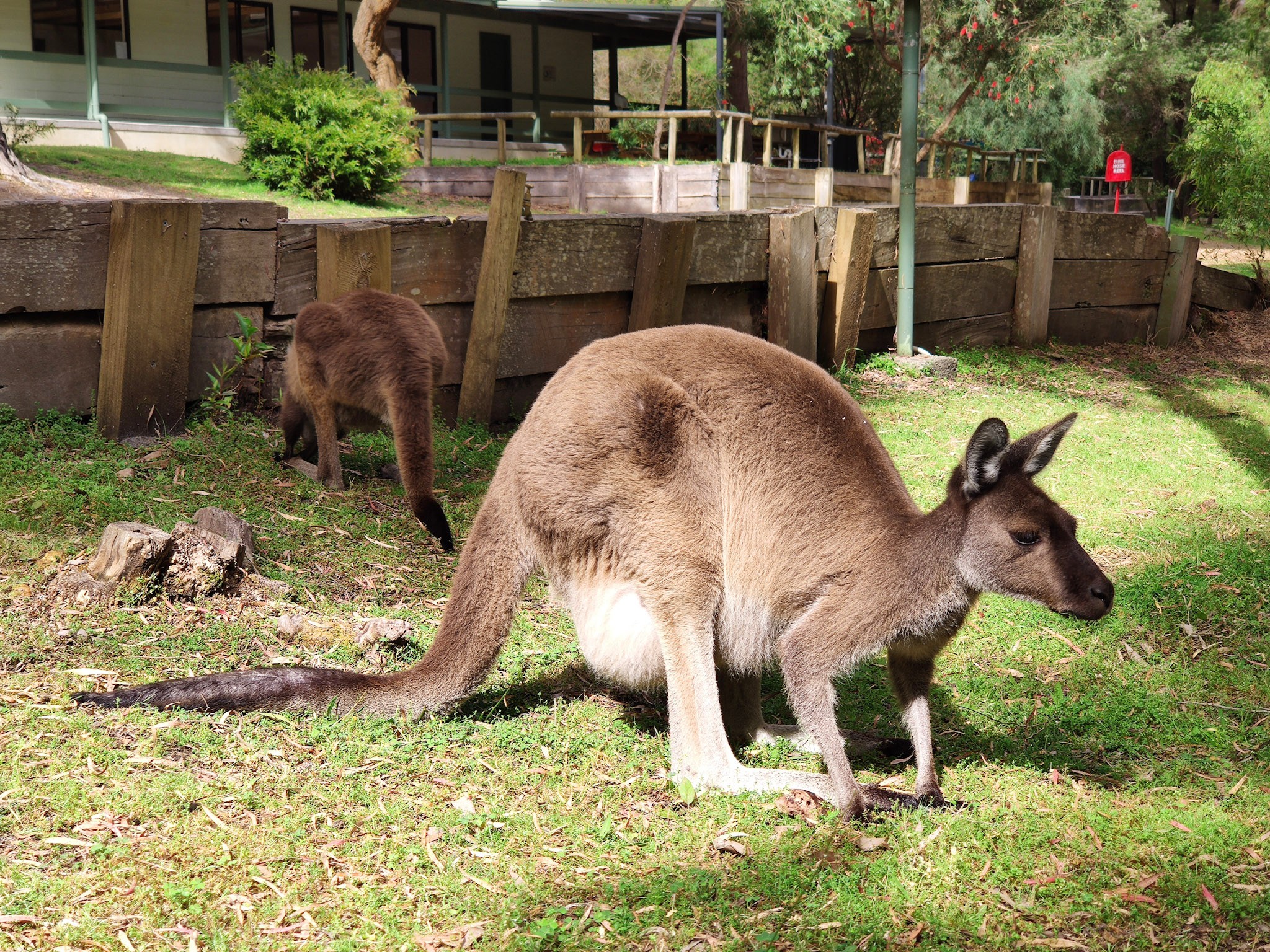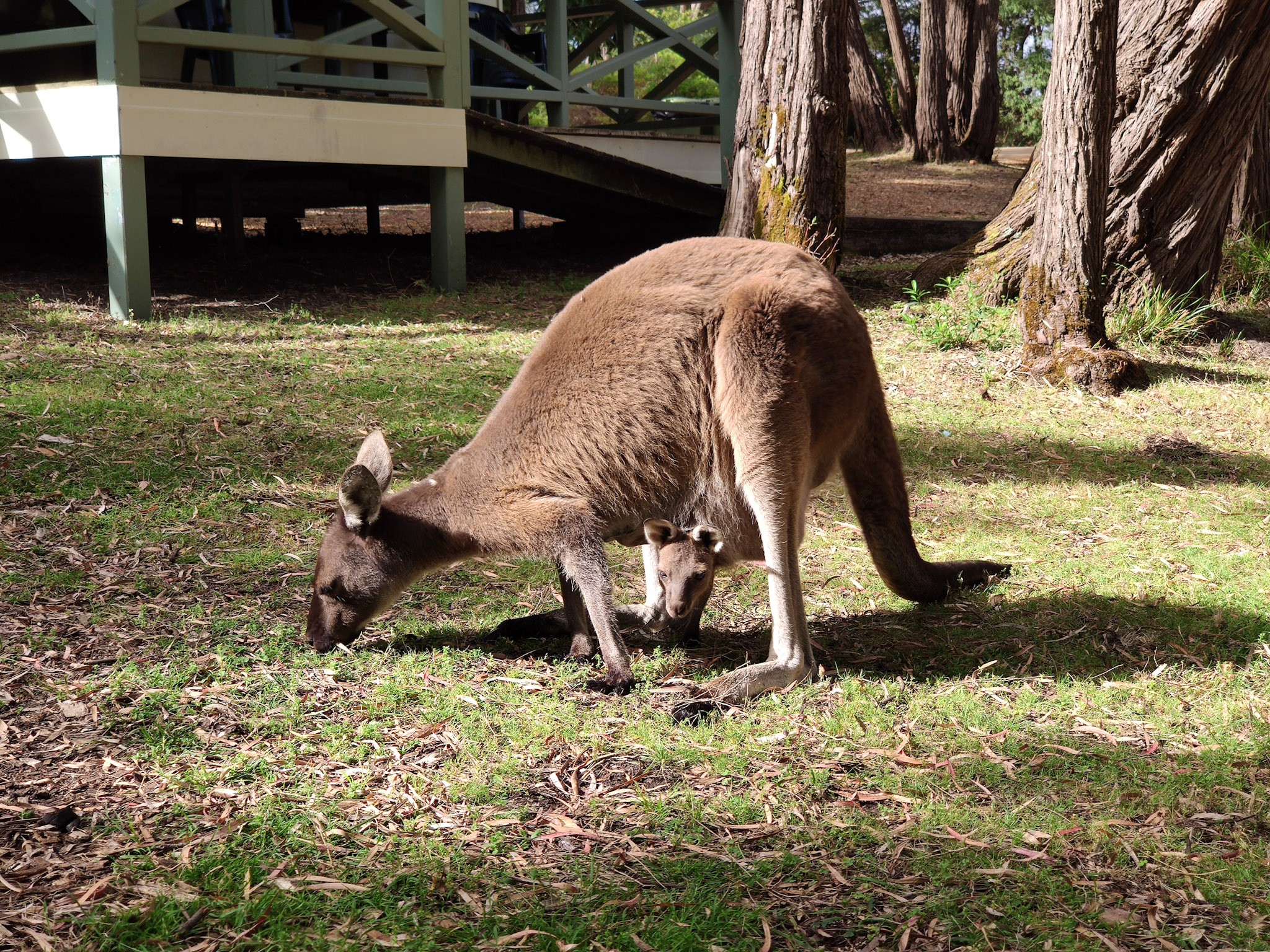 Am nächsten Morgen wurde ich netterweise von mehreren Kängurus besucht, die keine Furcht vor Besuchern haben. Bei den Leuten, die sich mit Füttern nicht zurückhalten können, werden die Roos dann aber wohl ziemlich frech, habe ich mir sagen lassen.